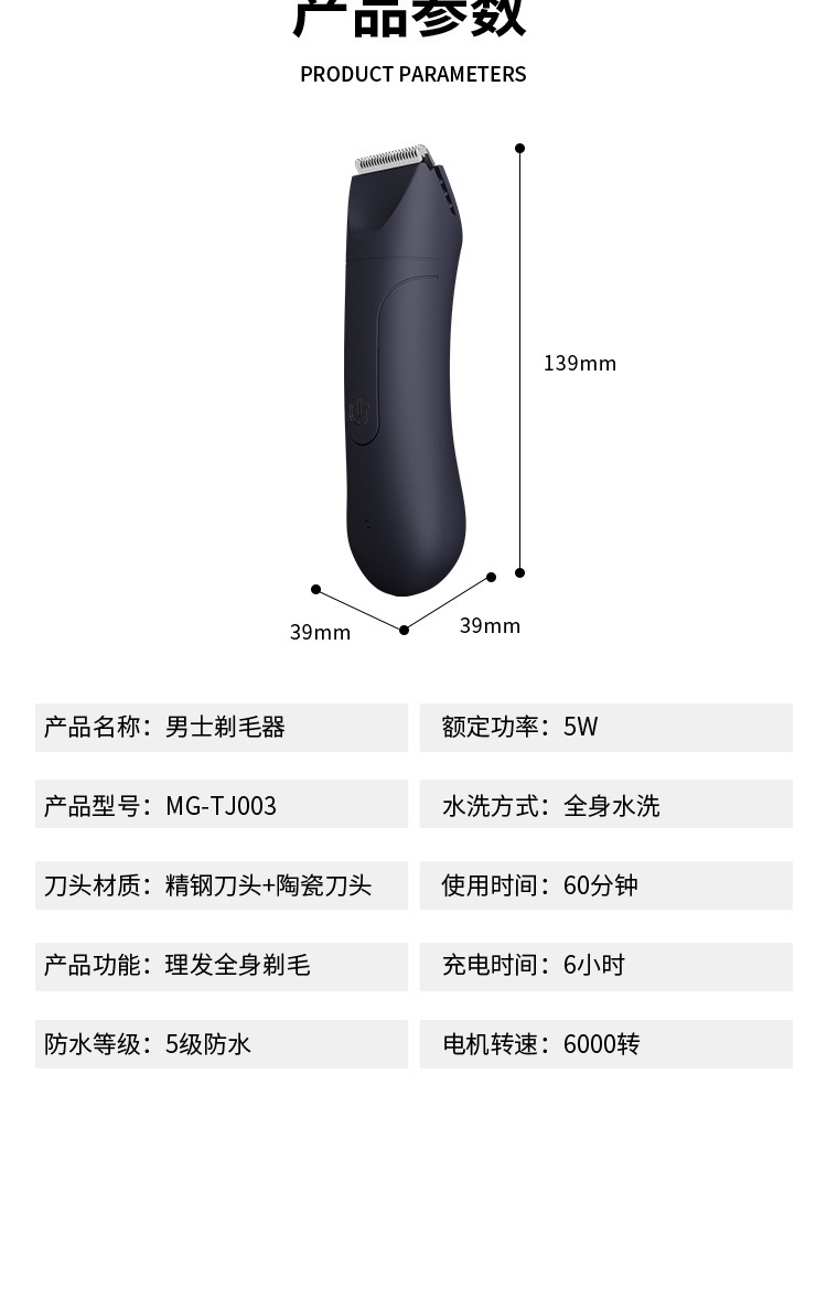 【产品名称】私密剃毛器 【产品包含】主机,清洁刷,彩盒,说明书,USB充电线 【产品型号】MG-TJ003 【产品颜色】神秘黑 【电源方式】USB充电 【产品材质】陶瓷刀头+ABS机身+PCB 【清洁方式】清洁刷清洁 【裸机重量】192g 【整套重量】203g 【产品尺寸】139*39*39mm 【彩盒尺寸】128*63*146mm ![]() |
