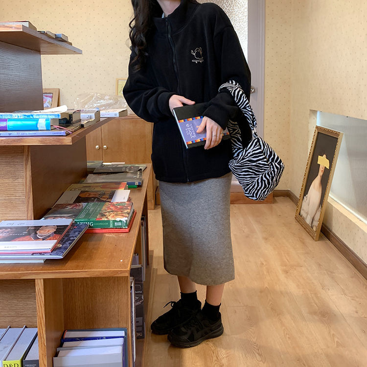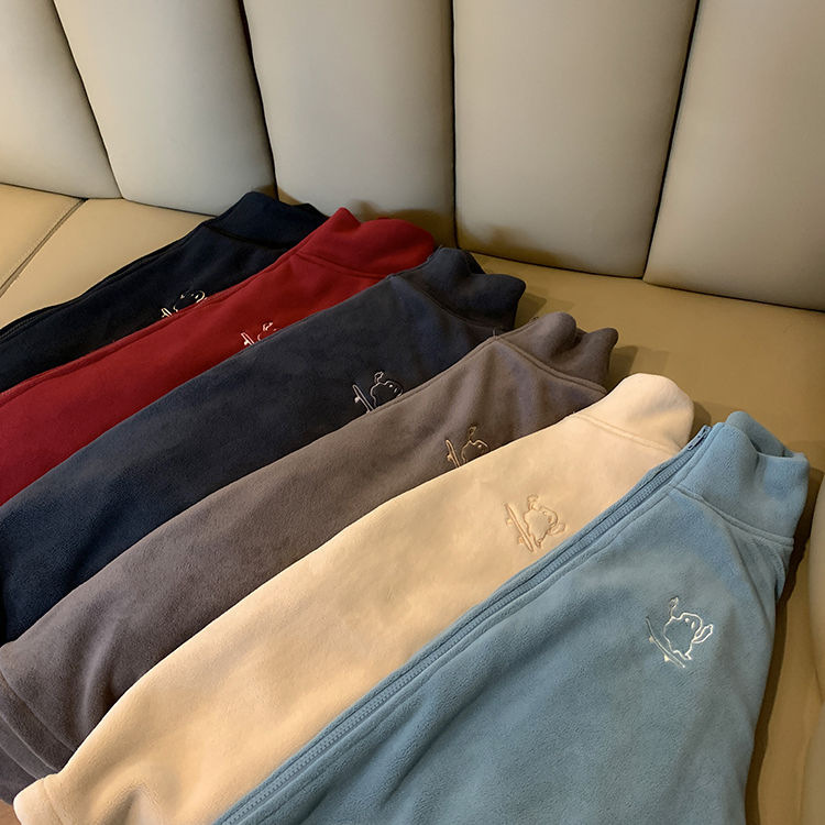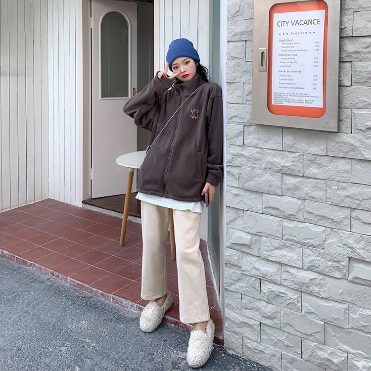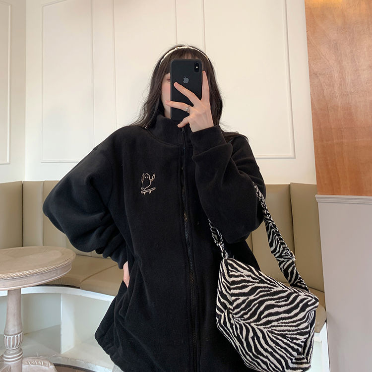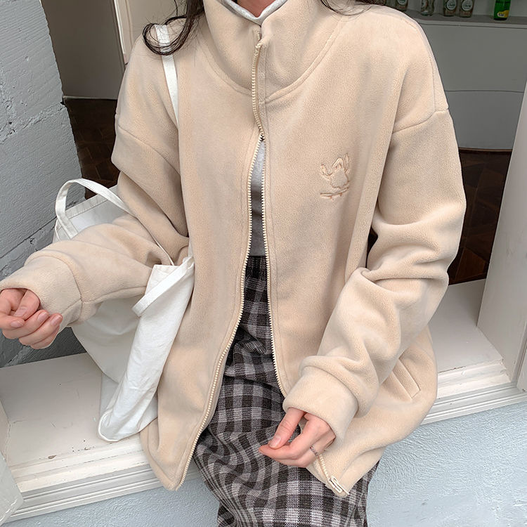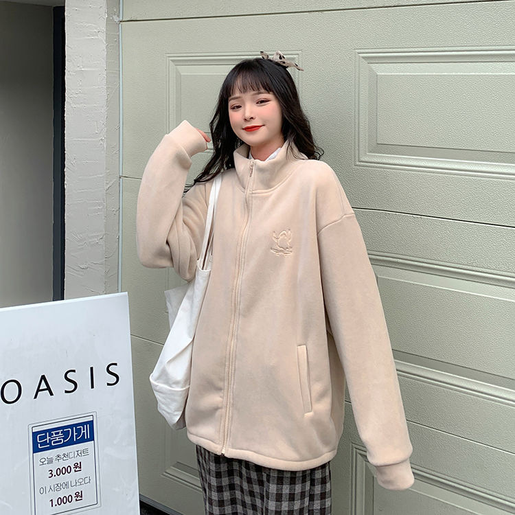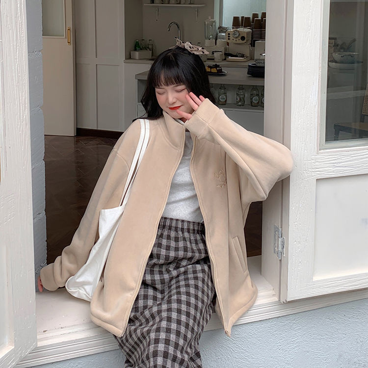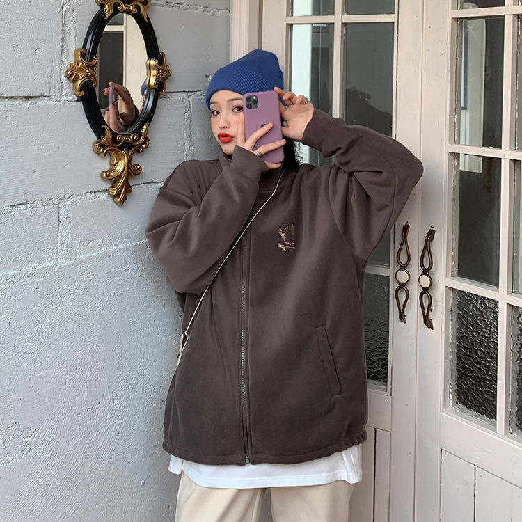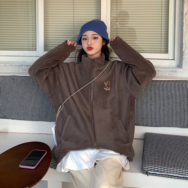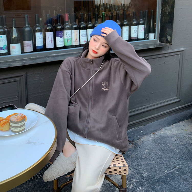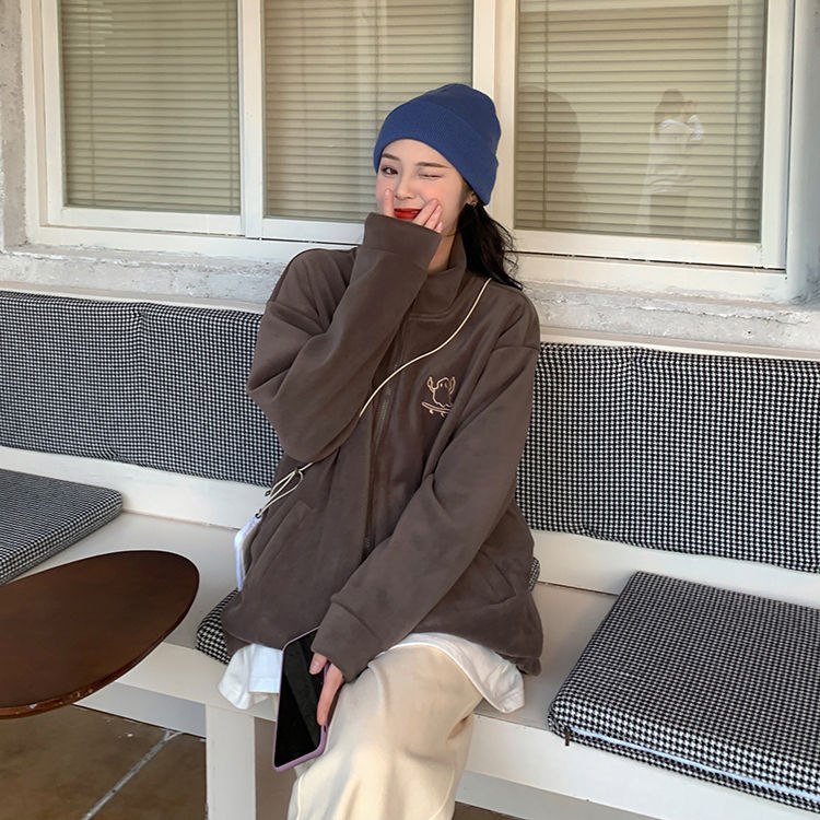 Chaqueta Bordada de terciopelo y terciopelo de grano sacudido en otoño e invierno con suéteres suéteres relajados versión coreana suéteres dulces y cálidos de color sólido