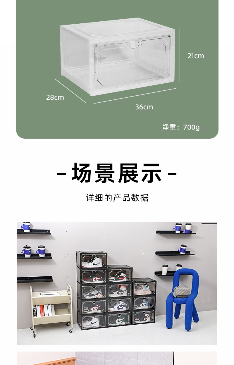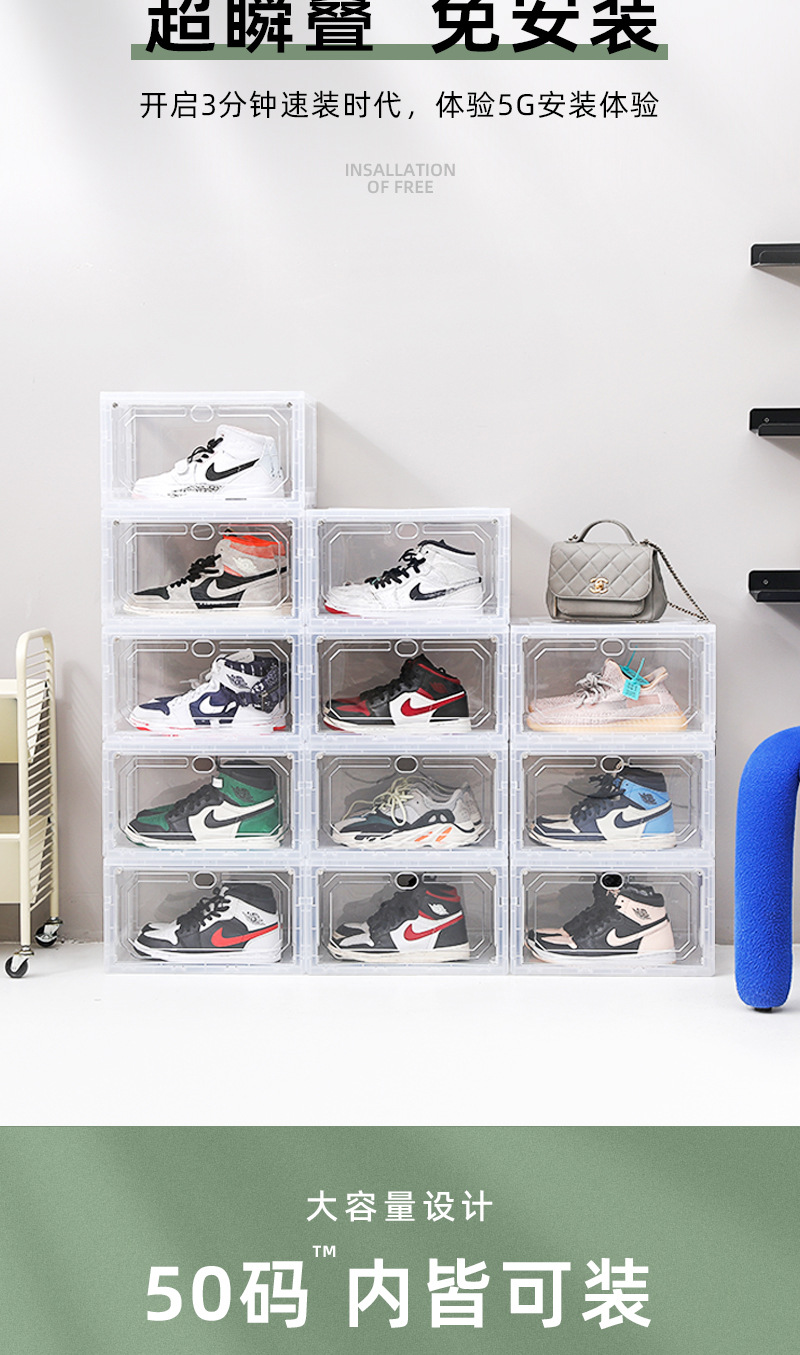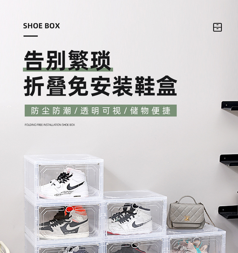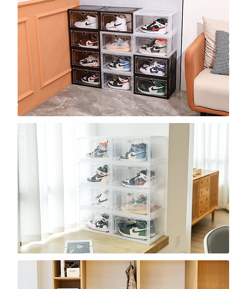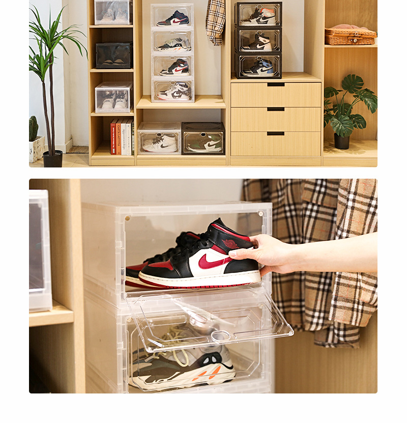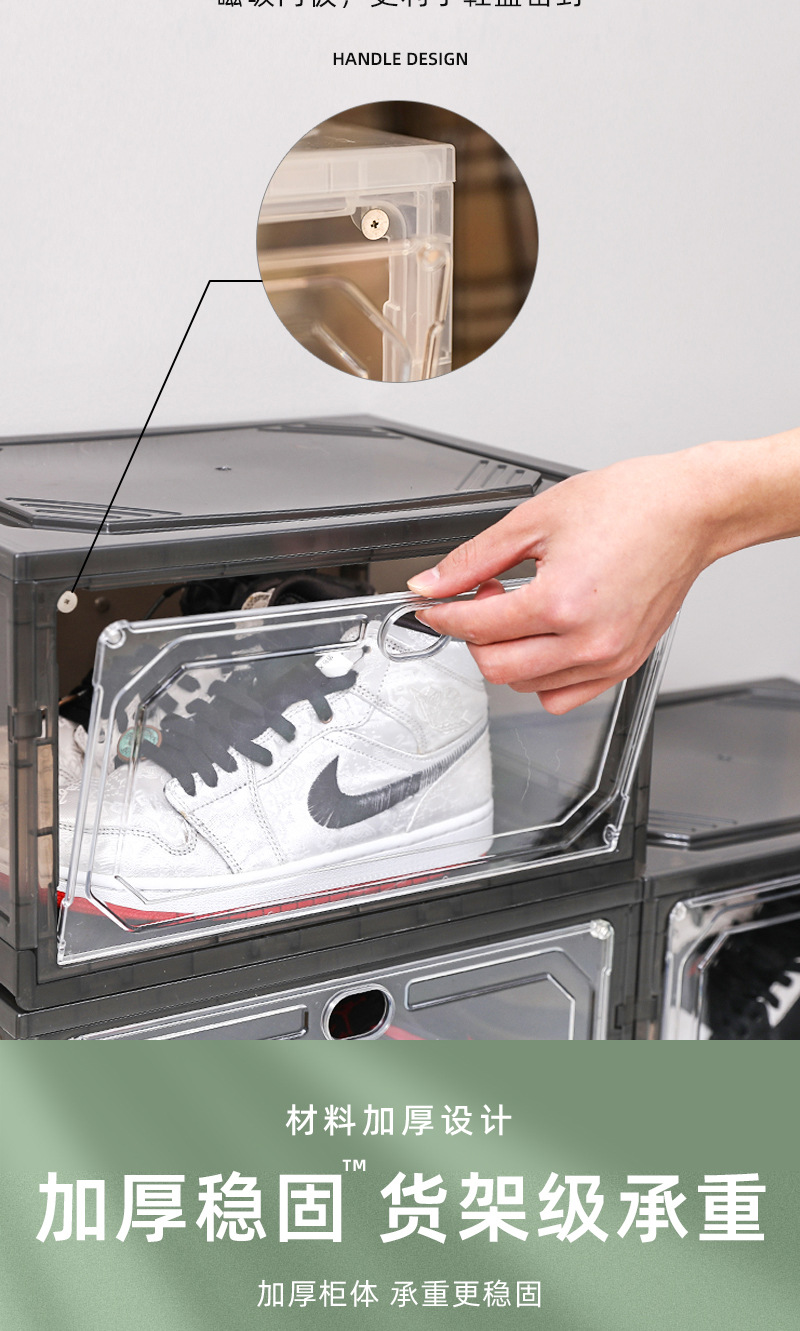 Caja de zapatos de baloncesto abierta en el lado de absorción magnética integral sin montaje, caja de zapatos de almacenamiento transparente grande de acrílico, venta directa del fabricante de cajas de zapatos