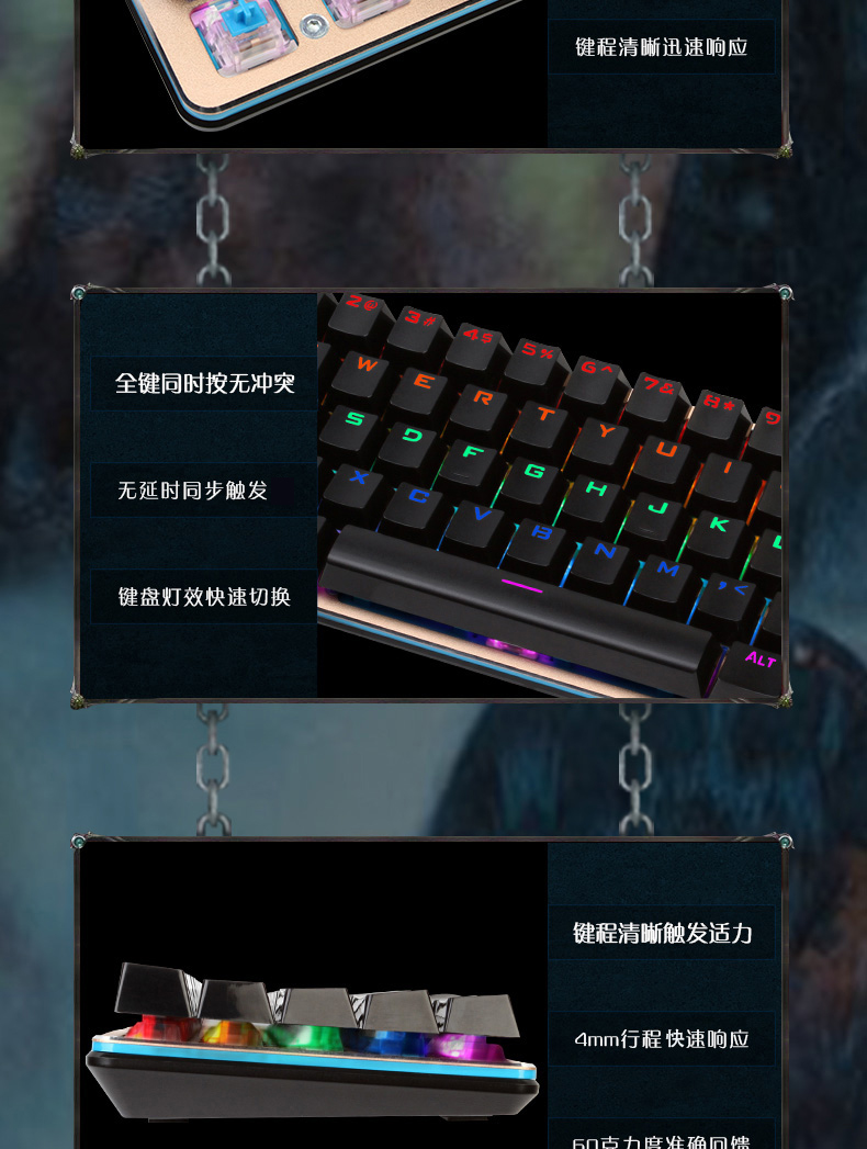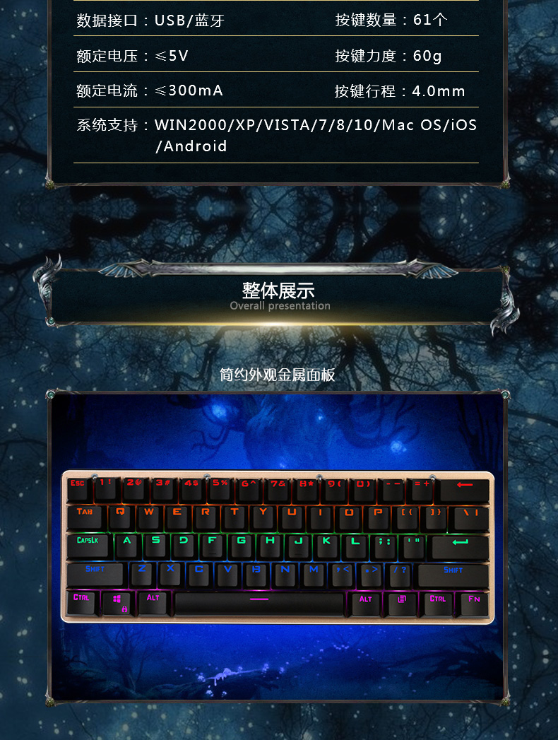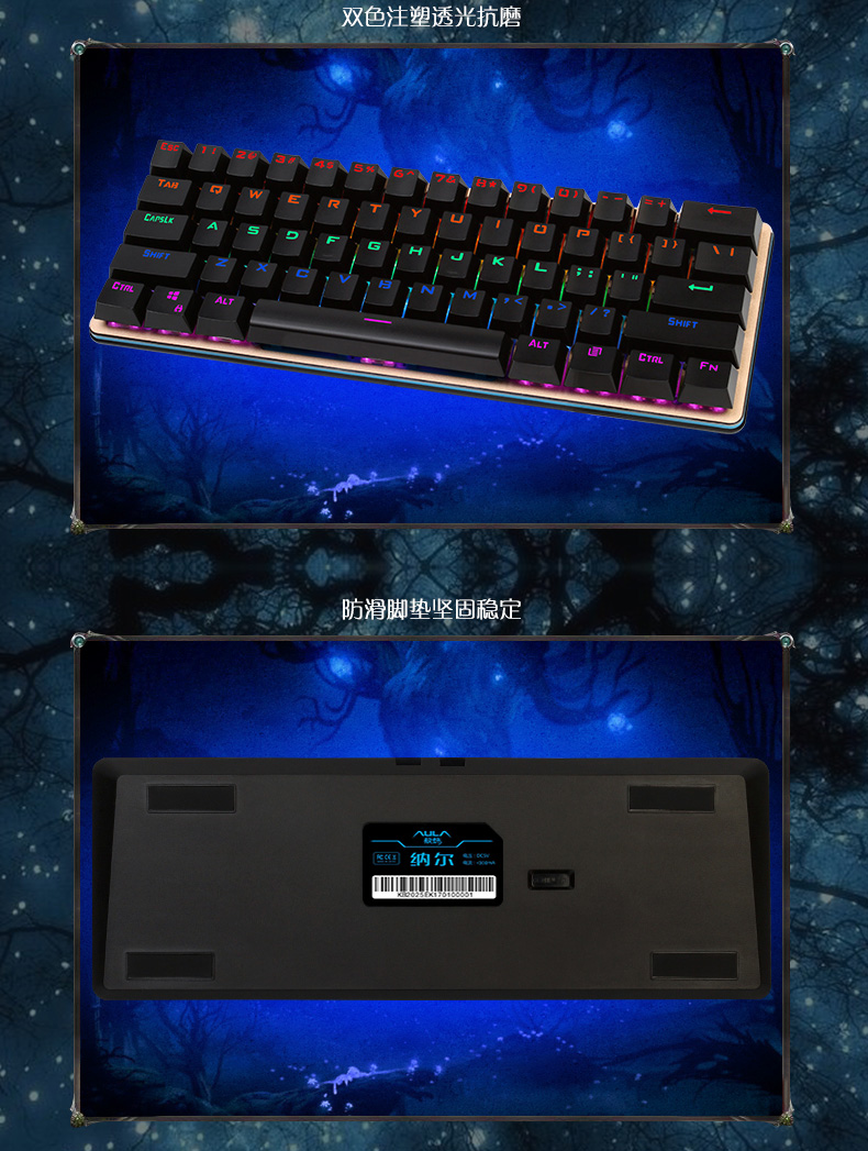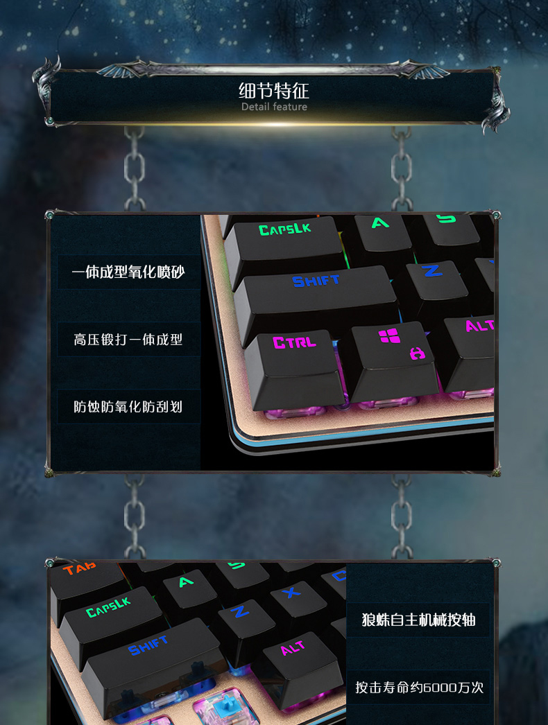 1,时尚的外观设计,一体成型金属面板,永不生锈,耐刮伤。 2,键帽采用双色注塑工艺,经久耐磨,永不掉色,多色可选。 3,采用机械轴设计,6000万次按键寿命,经久耐用,手感好。 4,键帽和缝隙背光,色彩均匀,多色混光,五彩缤纷。 5,键盘厚重,按键反应灵敏,按键寿命超长,高达6000万次