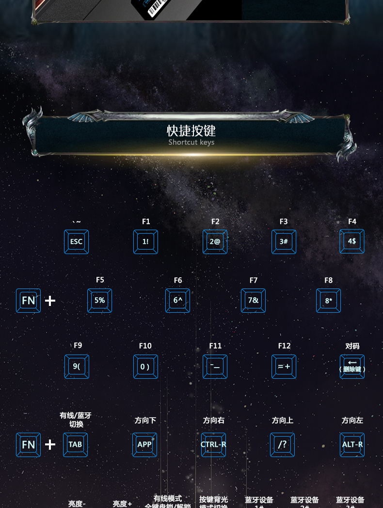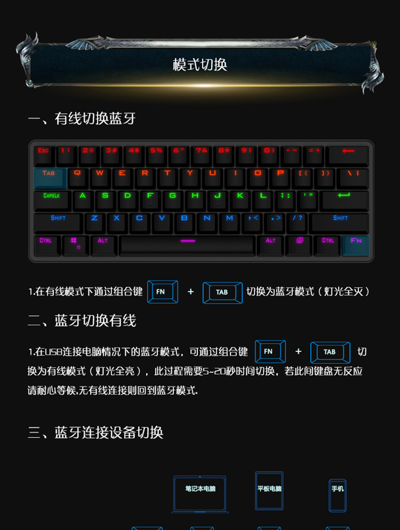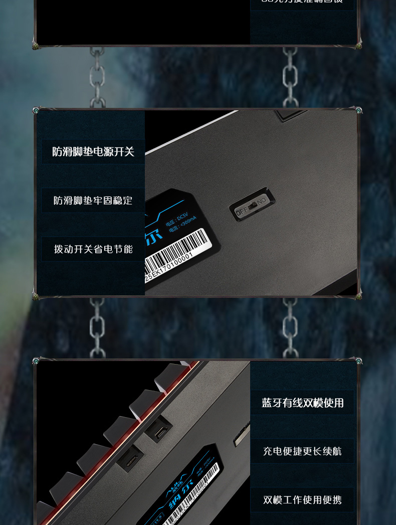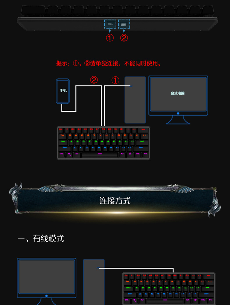 1,时尚的外观设计,一体成型金属面板,永不生锈,耐刮伤。 2,键帽采用双色注塑工艺,经久耐磨,永不掉色,多色可选。 3,采用机械轴设计,6000万次按键寿命,经久耐用,手感好。 4,键帽和缝隙背光,色彩均匀,多色混光,五彩缤纷。 5,键盘厚重,按键反应灵敏,按键寿命超长,高达6000万次