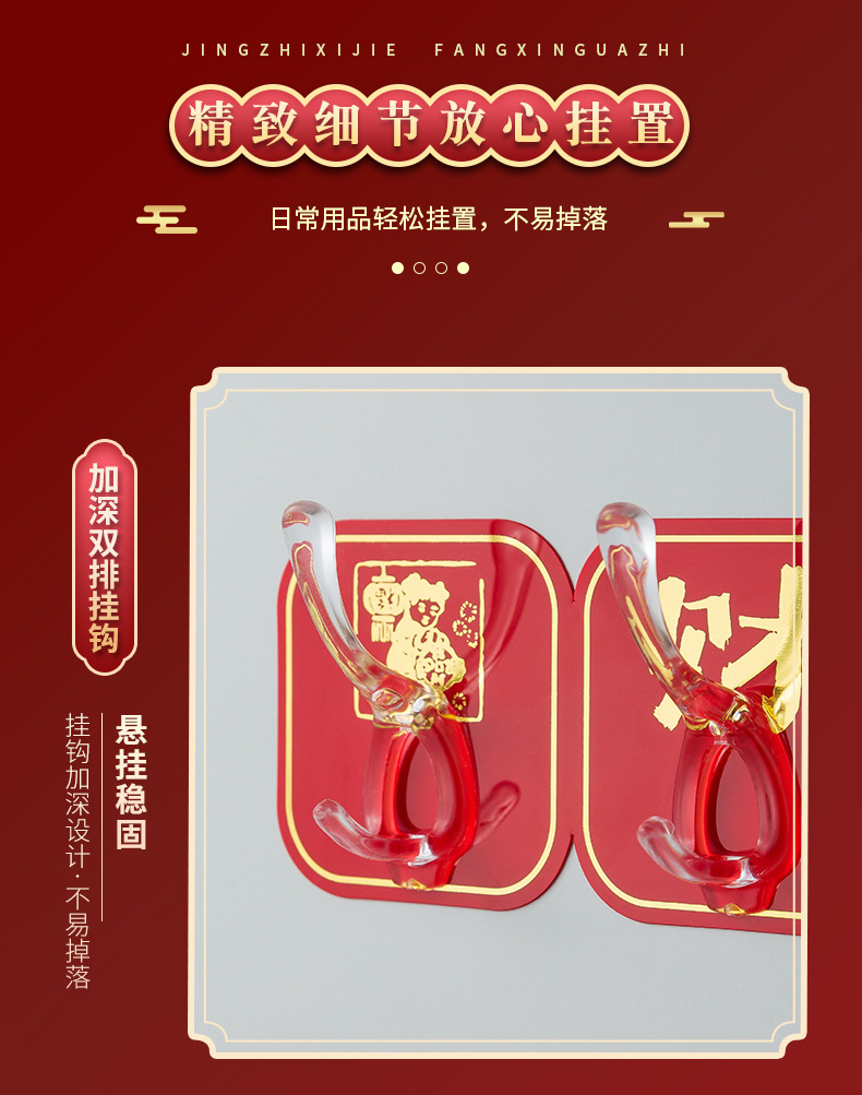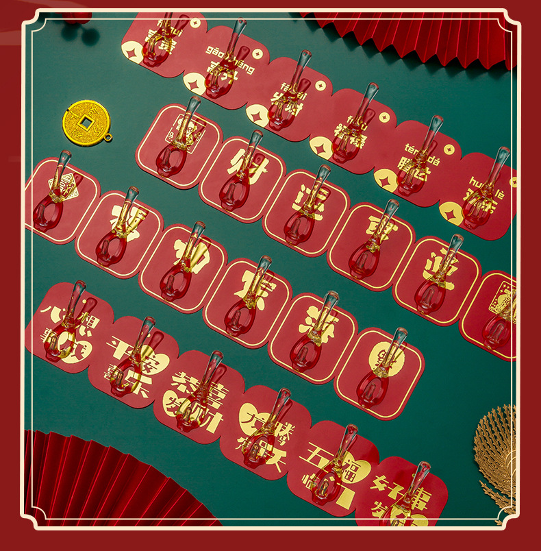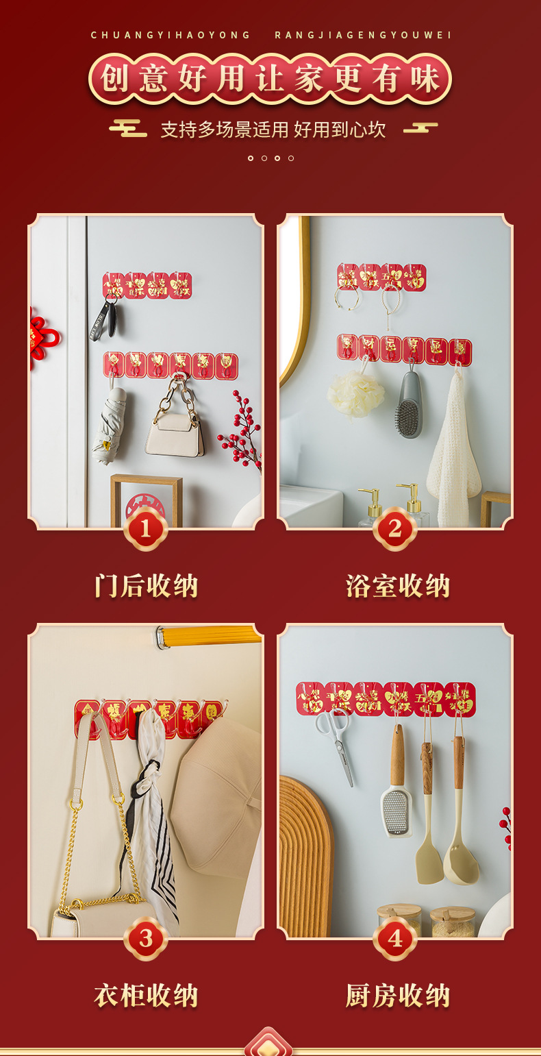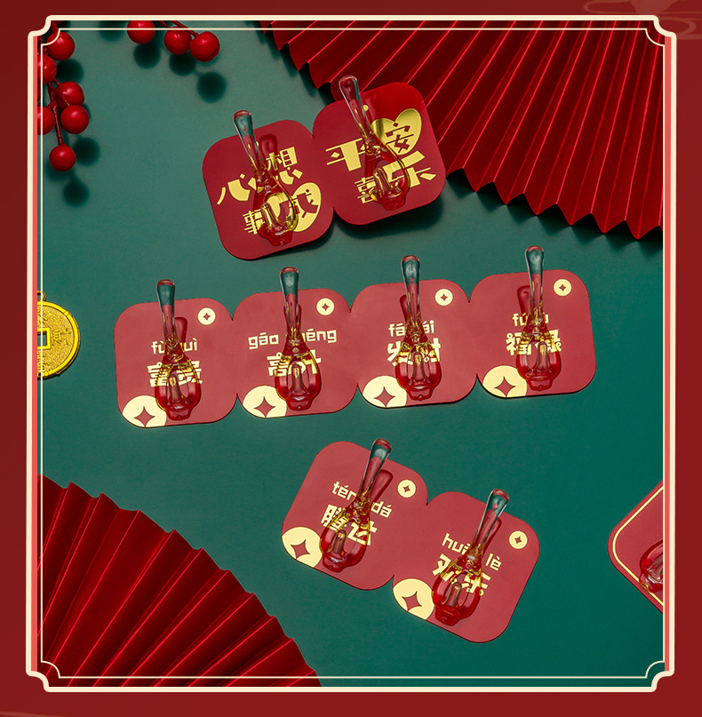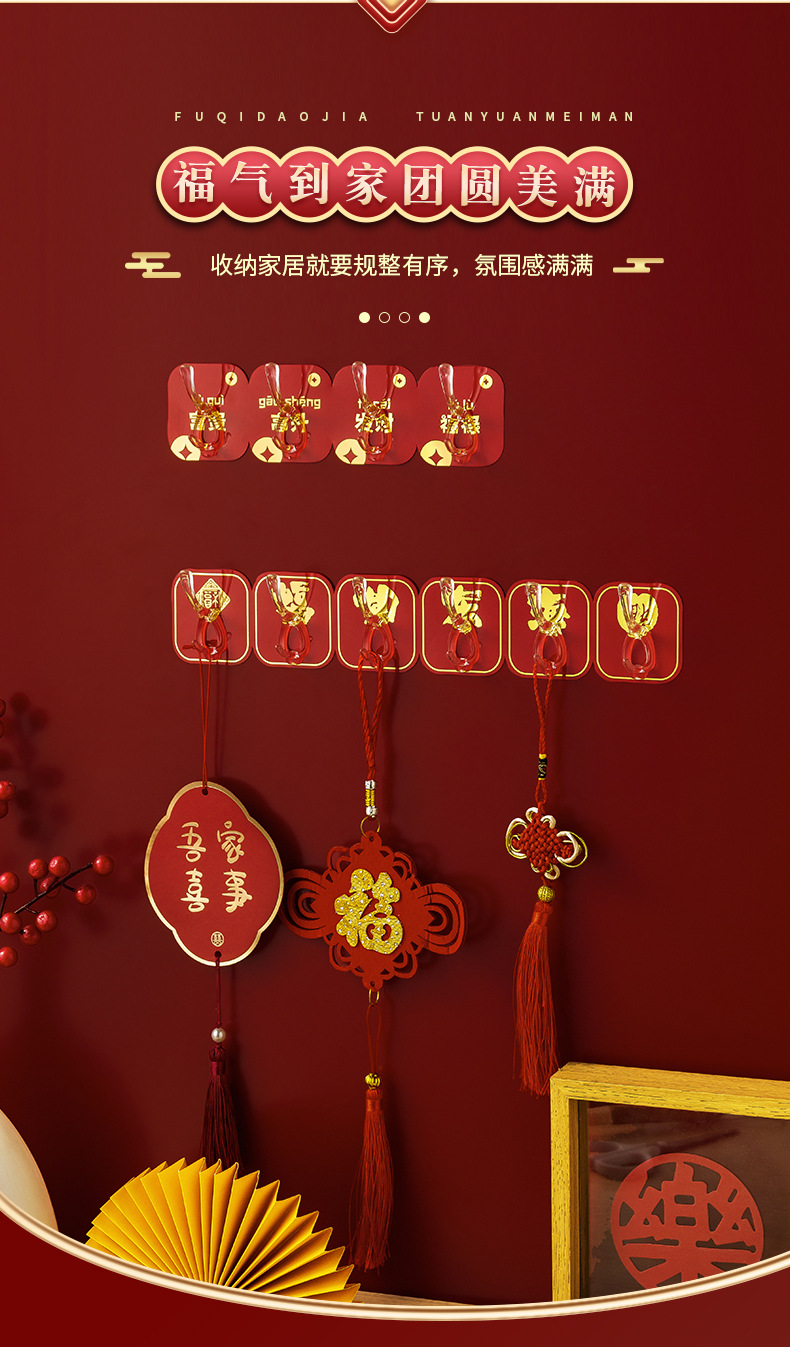 Seis ganchos festivos sin perforación, seis ganchos consecutivos, pegatinas de viscosa de carga fuerte, ganchos pegajosos rojos, ganchos festivos para aumentar los ganchos de bendición