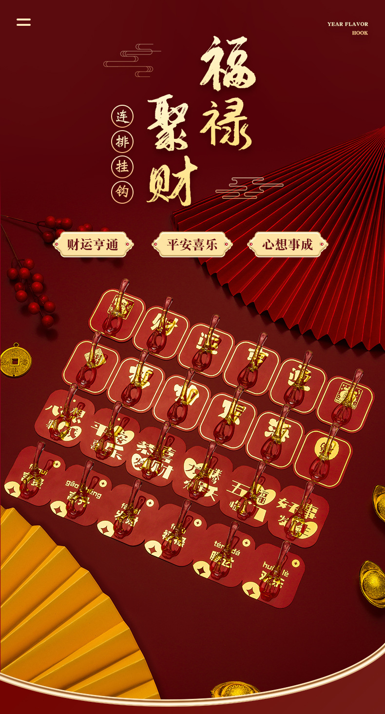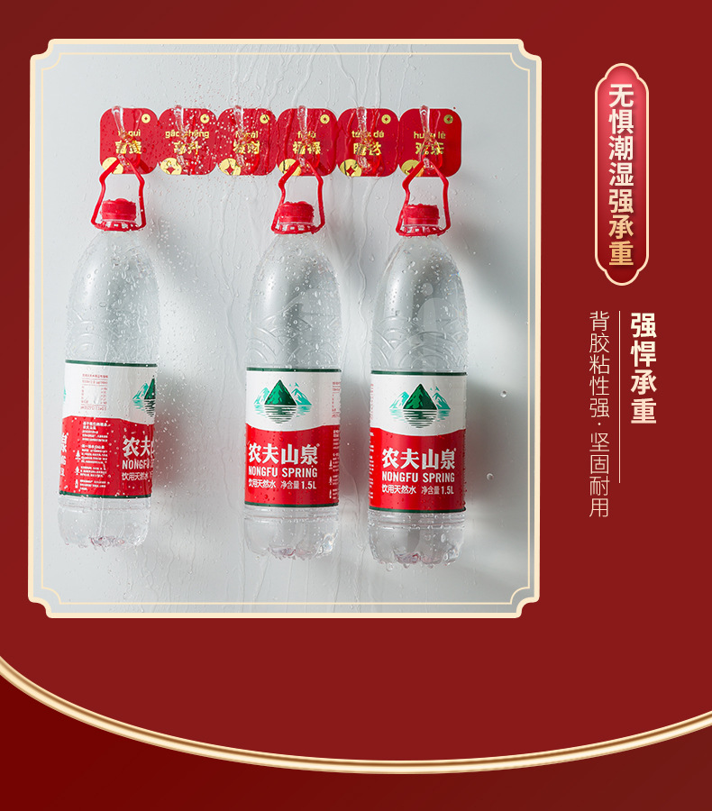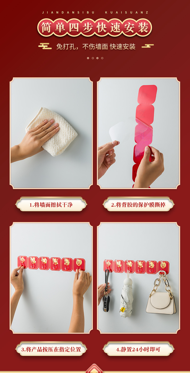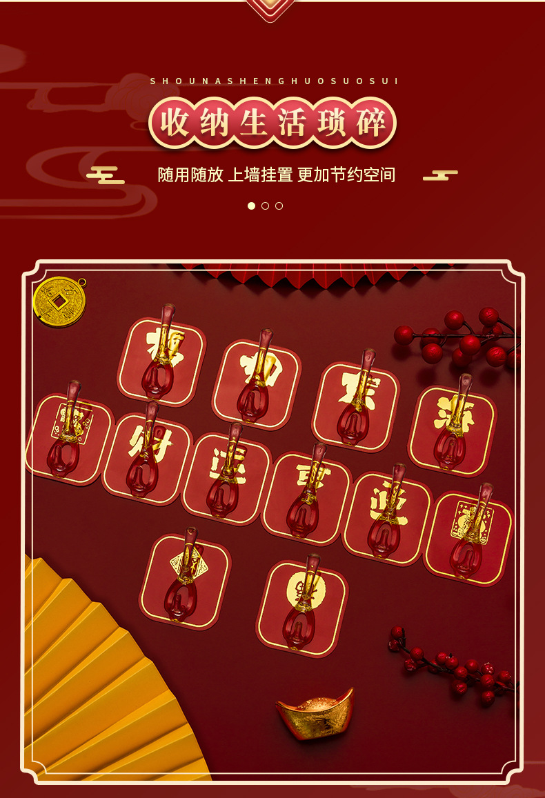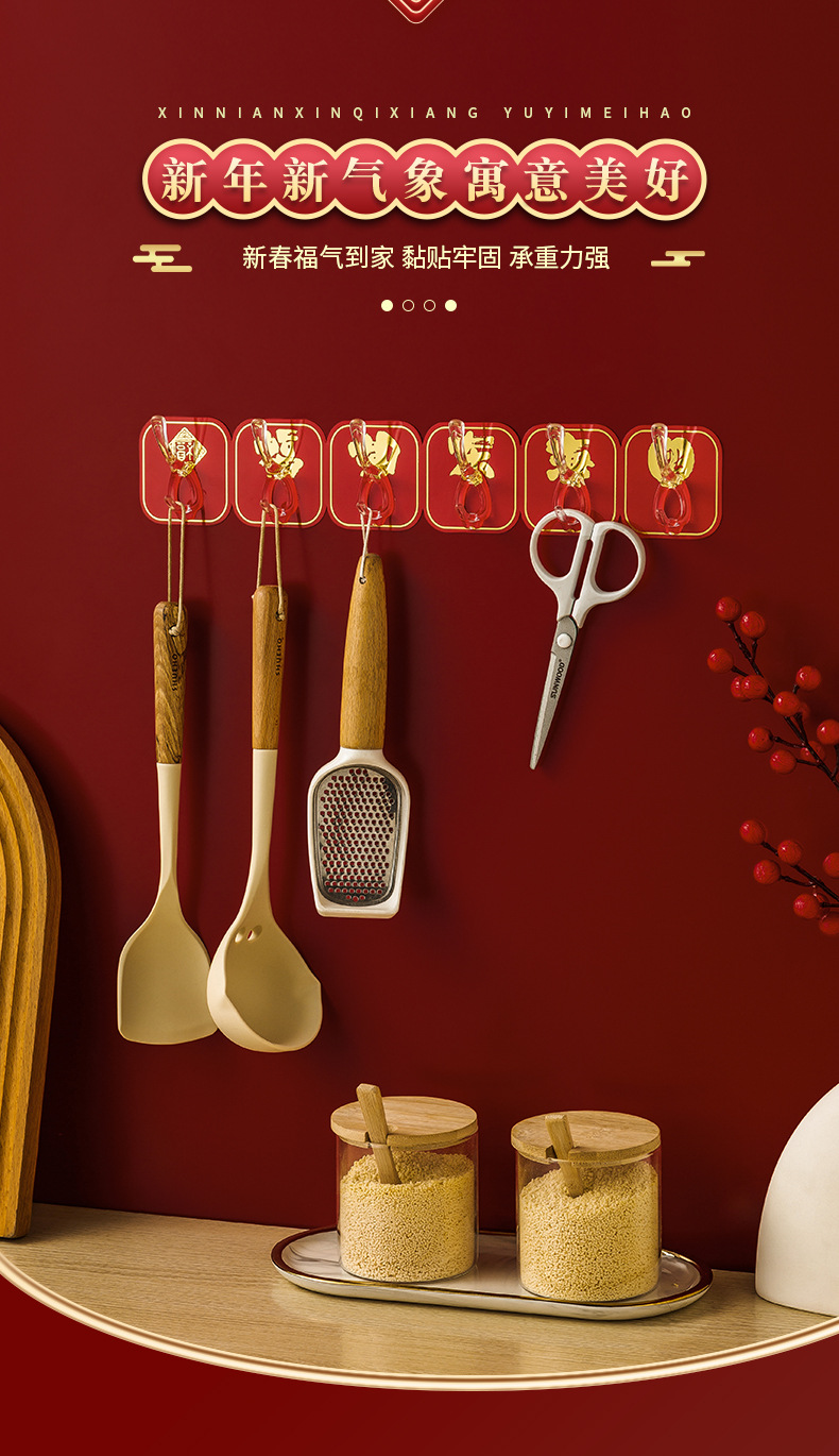 Seis ganchos festivos sin perforación, seis ganchos consecutivos, pegatinas de viscosa de carga fuerte, ganchos pegajosos rojos, ganchos festivos para aumentar los ganchos de bendición