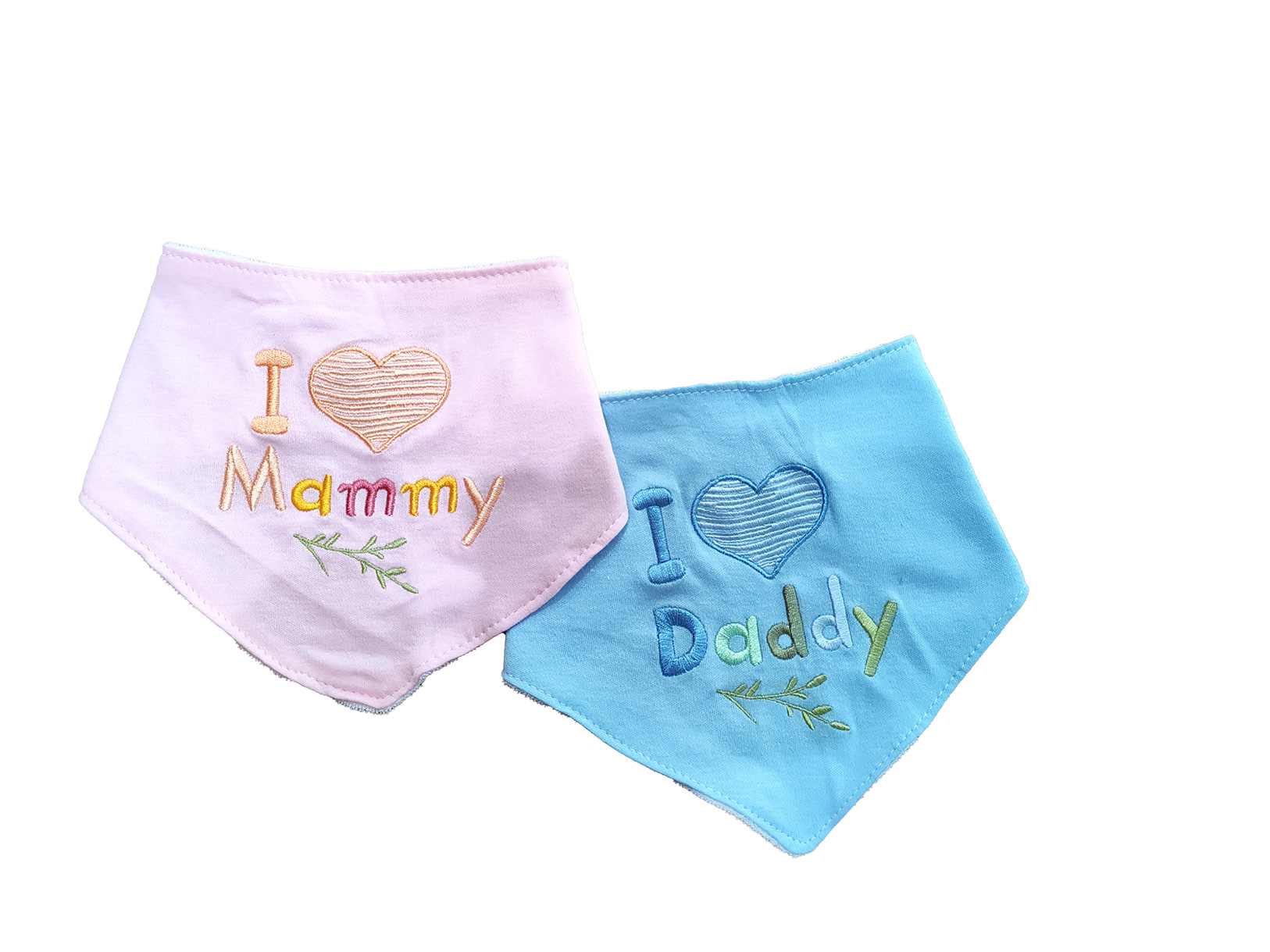 Pegatinas mágicas de babero de algodón para bebés y niños pequeños bordado de babero para bebés amo a mamá, amo a papá toallas triangulares dobles
