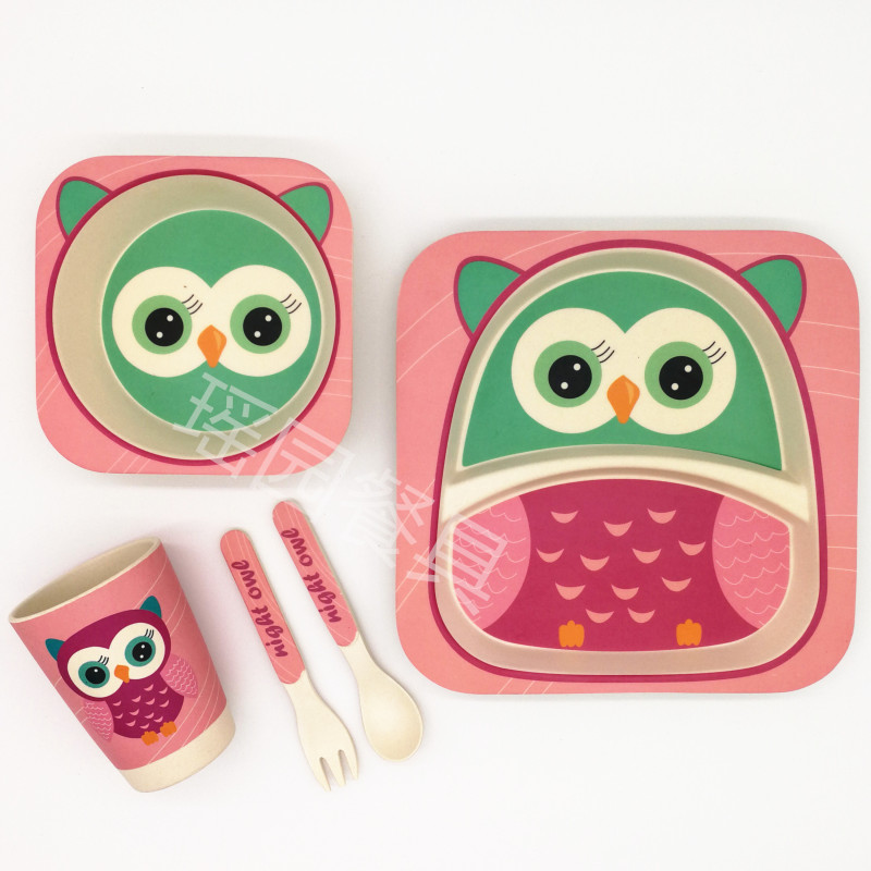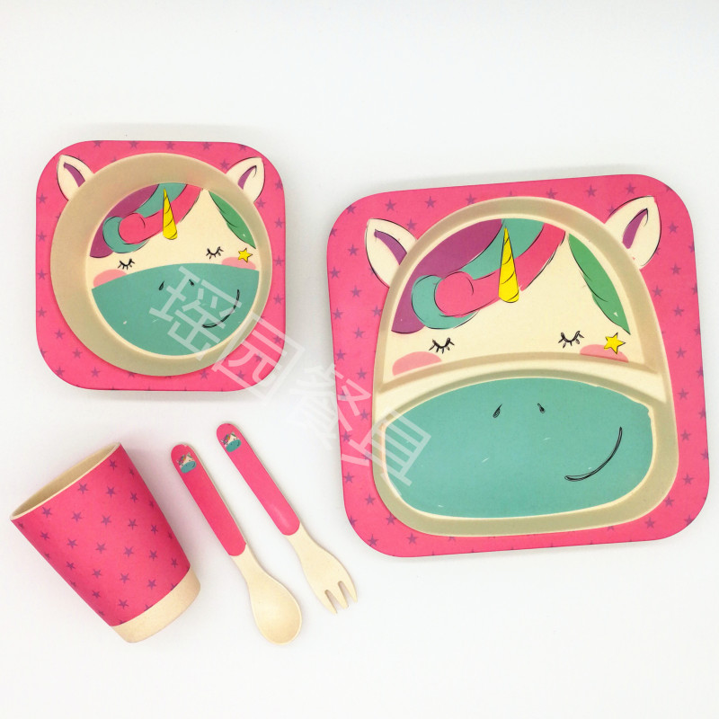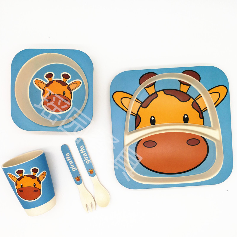 Protección del medio ambiente, fibra de bambú, melamina, dibujos animados para niños, cinco juegos de vajilla para bebés, platos, tazas, tenedores y cucharas regalos de caja de regalo