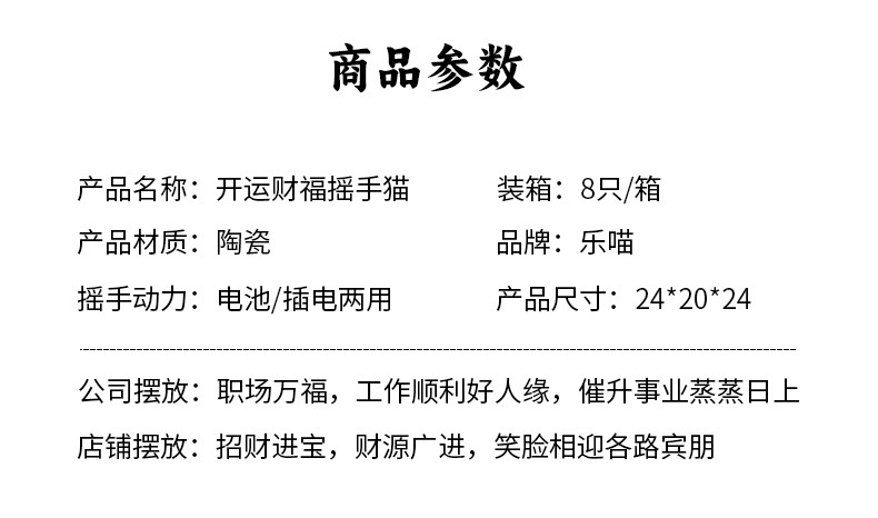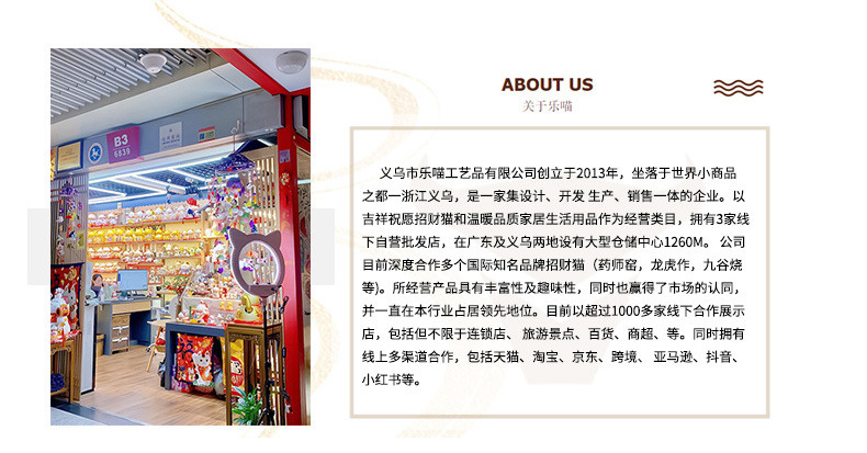 ![]() 产品信息 【品名】:LM22D09 财福电动摇手猫 【材质】:陶瓷 【装箱】:8只/箱 【尺寸】:24*20*24CM(纯手工测量,有1-2cm误差) 【包装】:精美彩印纸盒 【外箱尺寸】:62 X50X61CM 【重量】:17KG 【配套附件】:和风布垫一块,精美围脖一条 【适用范围】:家居饰品,乔迁新屋,庆生祝寿,公关礼品,广告促销,会议礼品,节庆送礼,商务送礼,开业典礼,员工福利,周年庆典,朋友馈赠等等 【产品说明】:陶瓷工艺品手工制品出现小气孔小凸点或是小凹点,个别有黑色小点,划痕,涂色不均匀不是瑕疵,均属于正常范畴,也不影响使用,请在接受情况下购买,追求完美者请慎拍! ![]() |