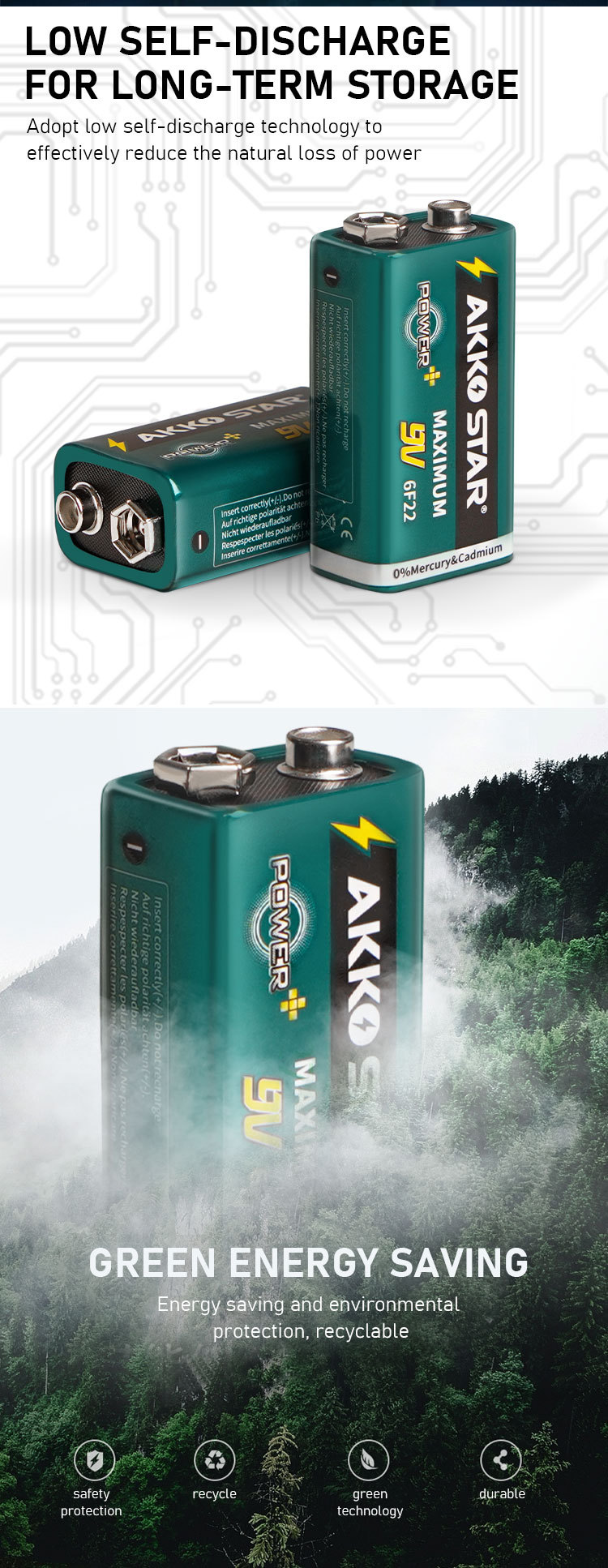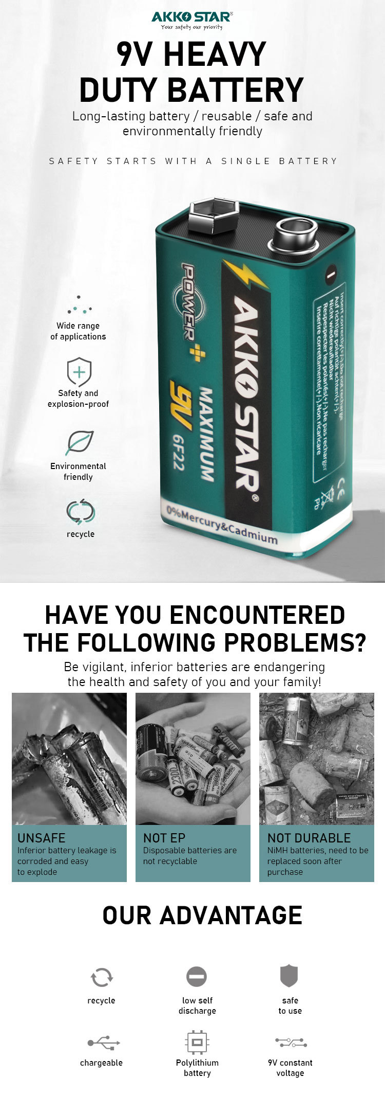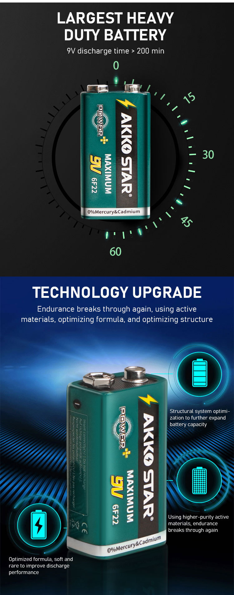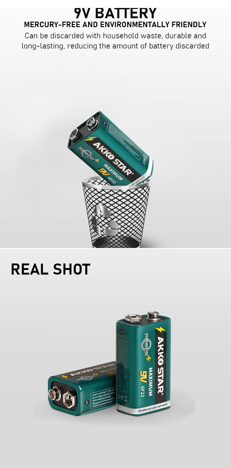 Akkostar 9V batería cuadrada desechable de larga duración a base de carbono batería cuadrada única y exquisita absorción de tarjetas