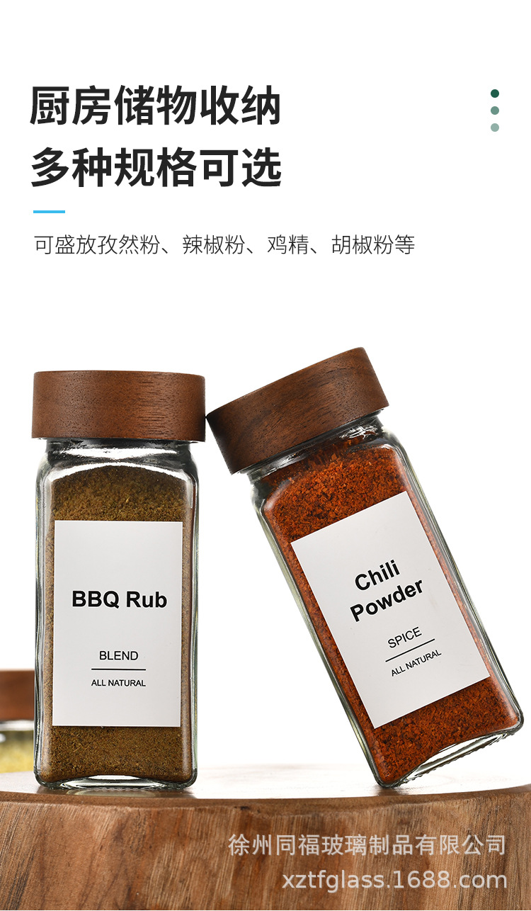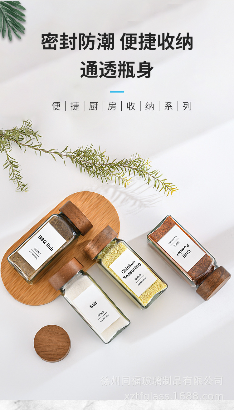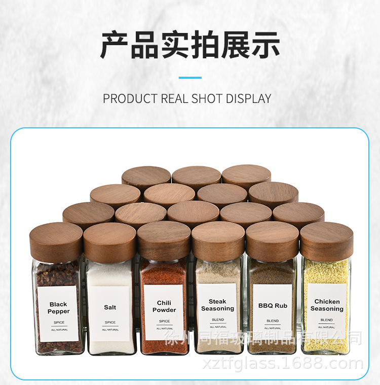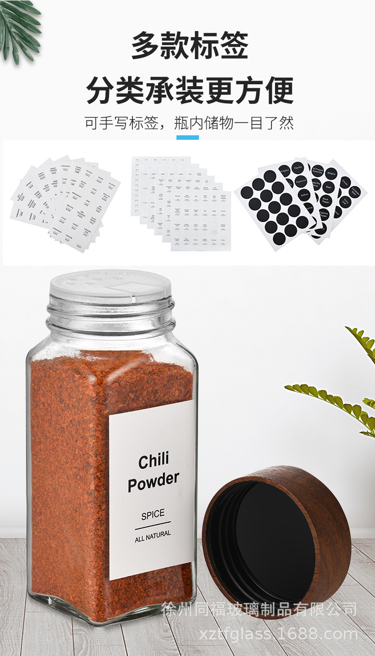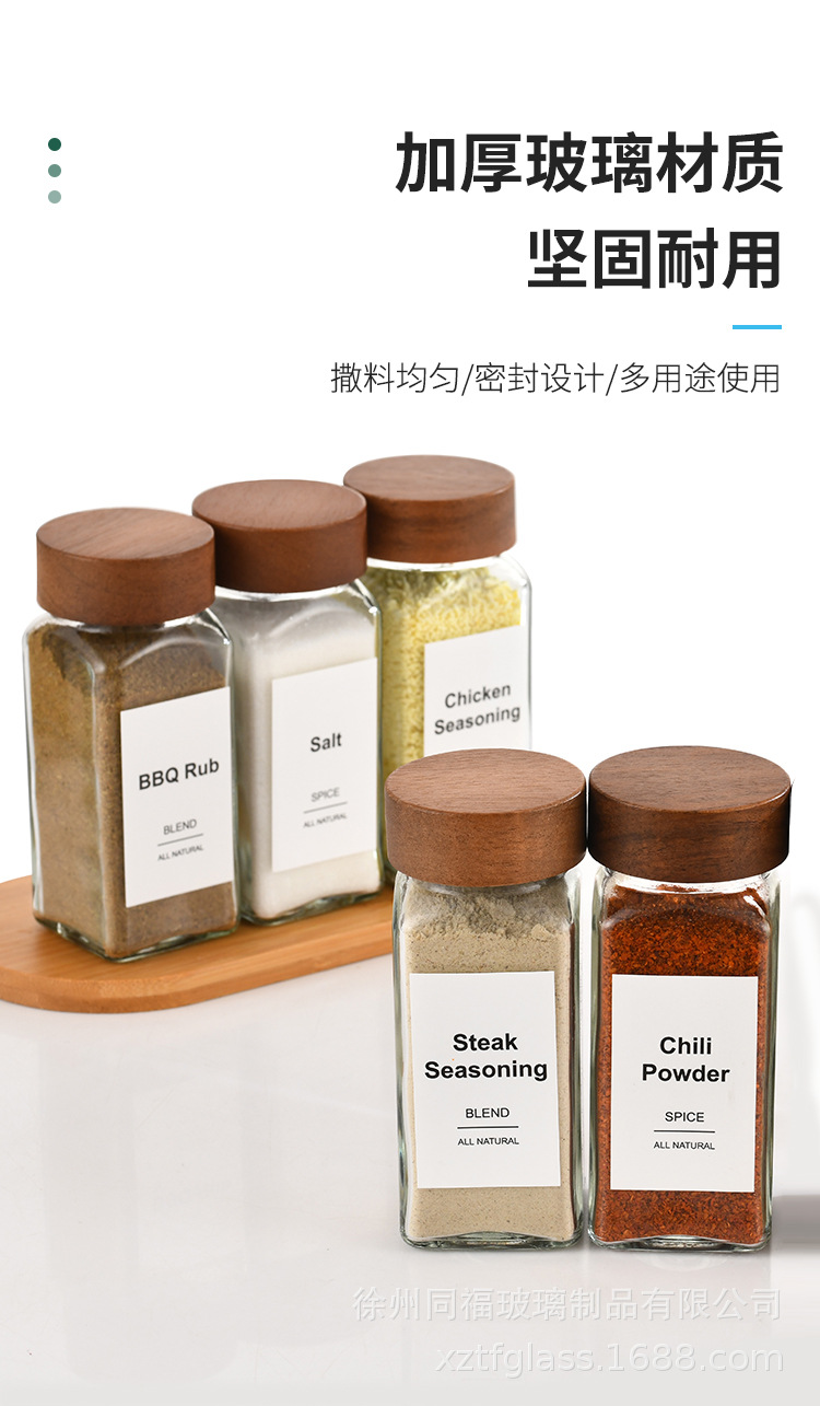 Botella de condimento con tapa de madera de acacia de 120 ml botella cuadrada de vidrio 4oz lata de condimento botella de especias Amazon con agujero botella de polvo