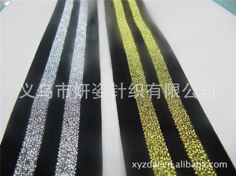 针织松紧带采用经编衬纬方法织成。经线在勾针或舌针的作用下,套结成编链,纬线衬于各编链之中,把分散的各根编链连接成带,橡胶丝由编链包覆,或由两组纬线夹持。针织松紧带能织出各种小型花纹、彩条和月牙边,质地疏松柔软,原料多数采用锦纶弹力丝,产品大多用于妇女胸罩和内裤。