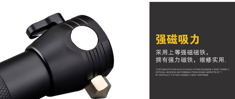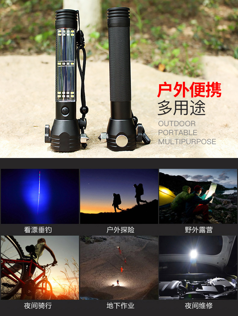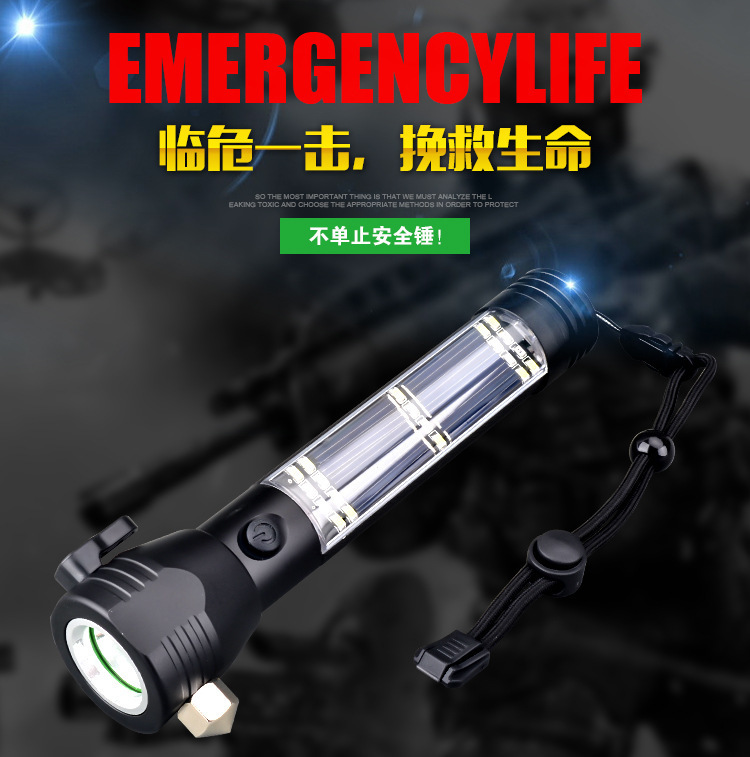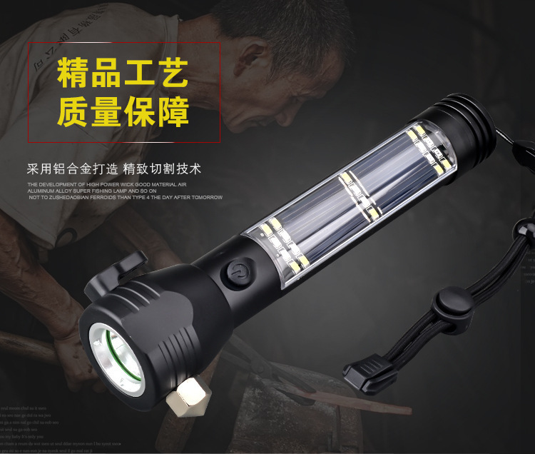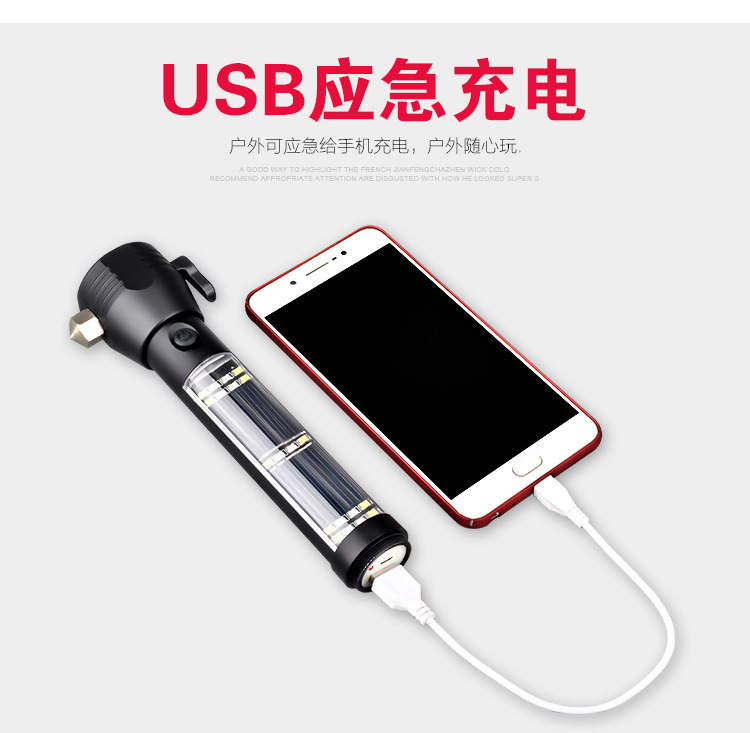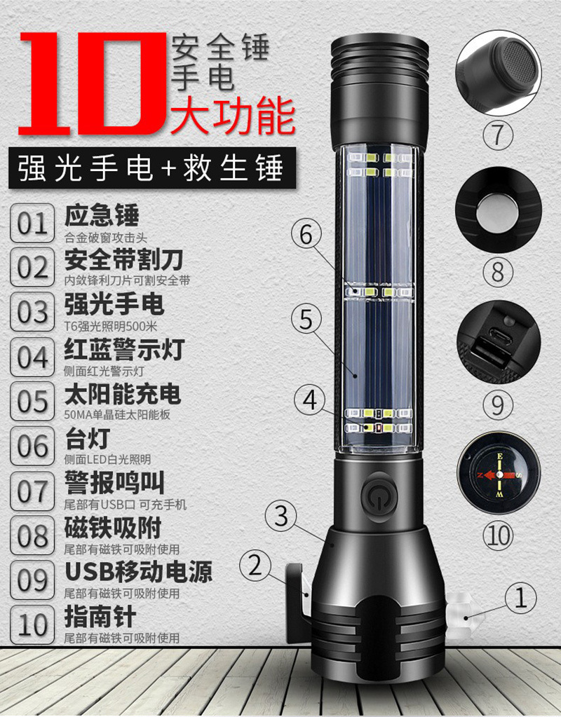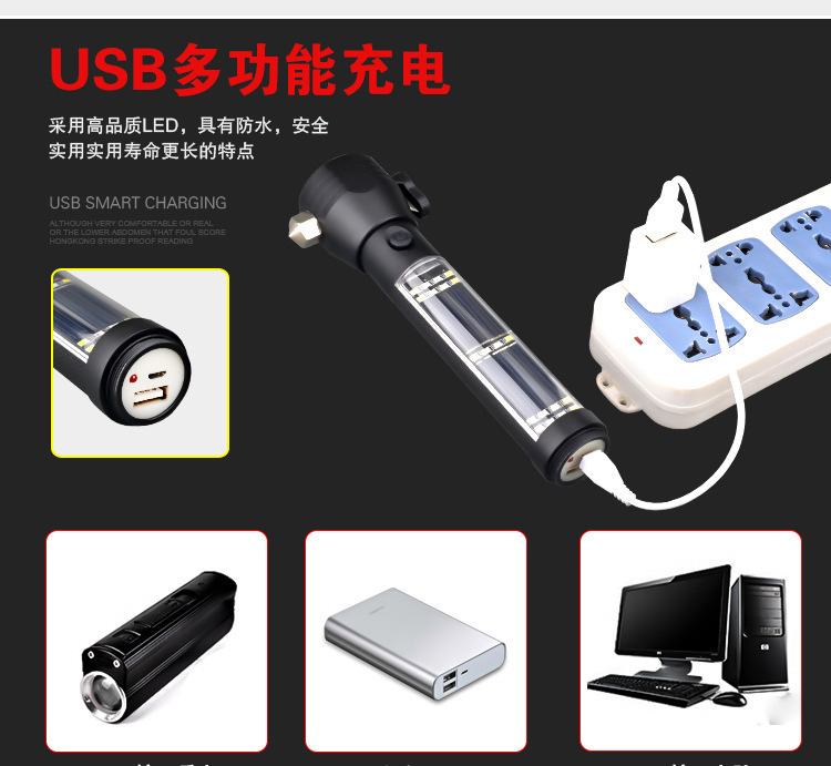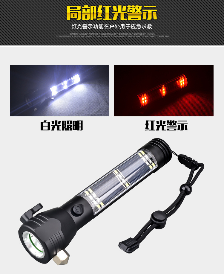 名称 多功能车载太阳能安全锤手电太阳能移动电源 ◎颜色:黑色 ◎材质:铝合金 ◎产品尺寸:头部45毫米*管身31毫米*尾部33毫米*总长197毫米 ◎重量;310克 规格参数 ◎功率/流明:3瓦前灯+白光2835*10+2835红光*10 ◎主要材料:铝合金 ◎包装方式:纸盒 ◎电池规格:内置2000MAH 18650电池 ◎照明距离:前灯200米 ◎照明时间:前灯(强光2-3小时.中光5-6小时。爆闪5-6小时) ,侧面白光(全亮3-4小时。半亮6-7小时)。侧面红光(快闪6-7小时,慢闪6-7小时) ◎具体功能及描述 1 前灯有全亮 ,半亮,爆闪模式,采用美国CREE XPE LED。聚光200米 2 侧面白光采用10颗2835贴片LED。单颗0.2W 10颗足2W(有全亮和半亮两个模式) 3.侧面红光采用10颗高亮2835贴片LED。波长620-625(有快闪和慢闪两个模式) 4.头部左边配有高硬度合金安全锤,可以轻松击碎车窗玻璃。 5.头部右边配有割刀器。在紧急情况下可以轻松割断安全带来逃生。 6.同时头部侧边配有强磁。可以轻松吸附在汽车外壳或者铁件上,方便使用。 7.中部配置5V 50MA单晶硅太阳能板。可以为电池充电。 8.尾部配有指南针,方便户外时使用。 9.旋开尾部底端有国际通用的安卓充电接口,可以为内置蓄电池充电。 10.同时手电具有USB输出功能,外出时可以为手机等数码设备充电。 ![]() ![]() ![]() ![]() ![]() ![]() ![]() ![]() ![]() ![]() ![]() ![]() ![]() ![]() ![]() ![]() ![]() ![]() ![]() ![]() ![]() ![]() ![]() ![]() ![]() ![]() ![]() |
