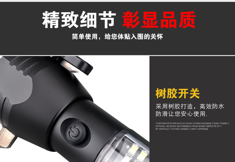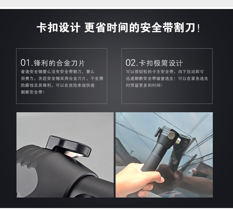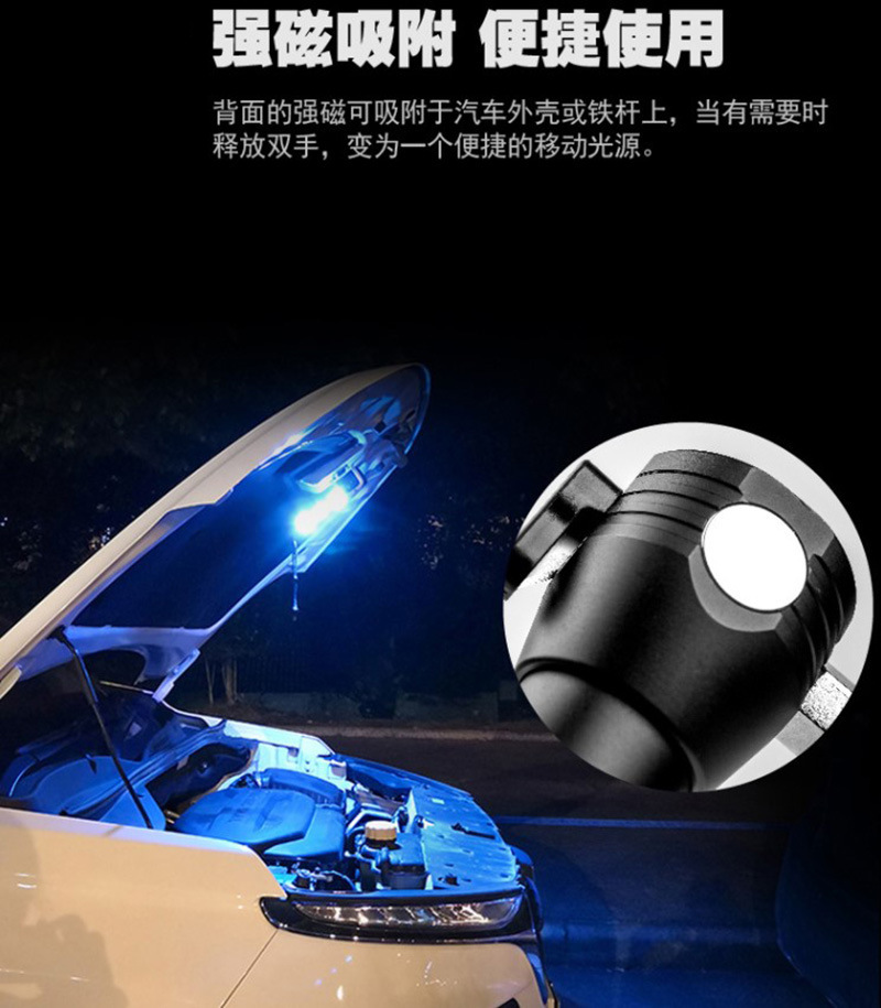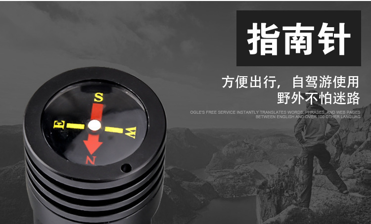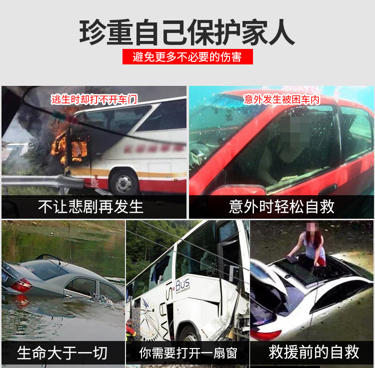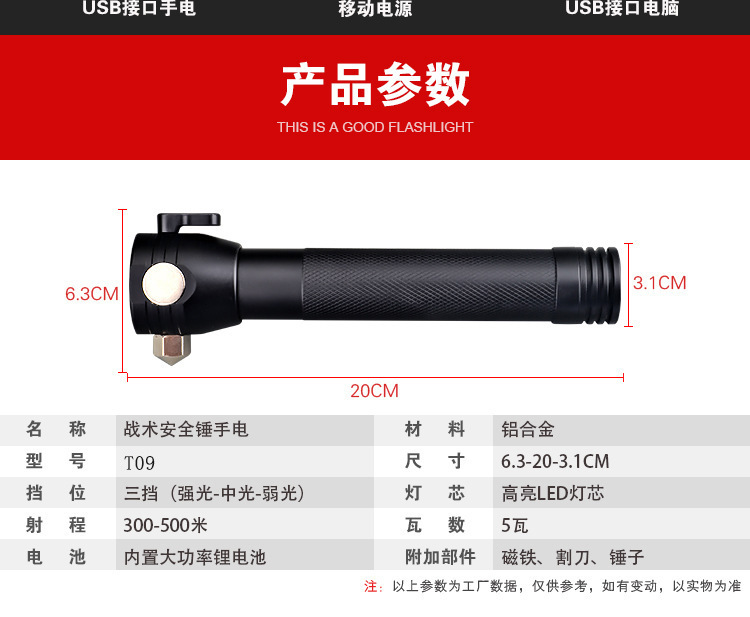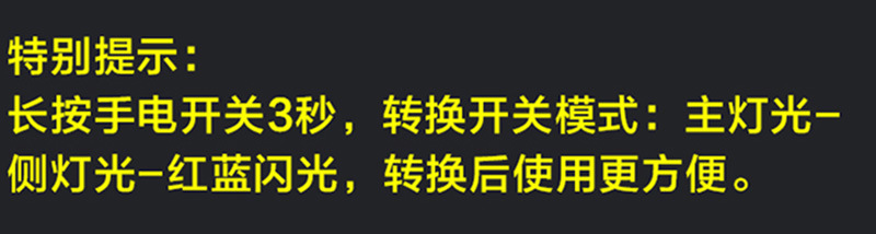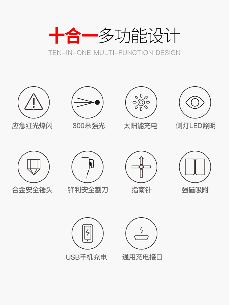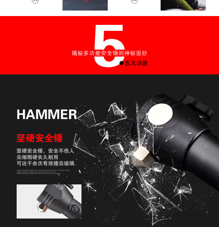 名称 多功能车载太阳能安全锤手电太阳能移动电源 ◎颜色:黑色 ◎材质:铝合金 ◎产品尺寸:头部45毫米*管身31毫米*尾部33毫米*总长197毫米 ◎重量;310克 规格参数 ◎功率/流明:3瓦前灯+白光2835*10+2835红光*10 ◎主要材料:铝合金 ◎包装方式:纸盒 ◎电池规格:内置2000MAH 18650电池 ◎照明距离:前灯200米 ◎照明时间:前灯(强光2-3小时.中光5-6小时。爆闪5-6小时) ,侧面白光(全亮3-4小时。半亮6-7小时)。侧面红光(快闪6-7小时,慢闪6-7小时) ◎具体功能及描述 1 前灯有全亮 ,半亮,爆闪模式,采用美国CREE XPE LED。聚光200米 2 侧面白光采用10颗2835贴片LED。单颗0.2W 10颗足2W(有全亮和半亮两个模式) 3.侧面红光采用10颗高亮2835贴片LED。波长620-625(有快闪和慢闪两个模式) 4.头部左边配有高硬度合金安全锤,可以轻松击碎车窗玻璃。 5.头部右边配有割刀器。在紧急情况下可以轻松割断安全带来逃生。 6.同时头部侧边配有强磁。可以轻松吸附在汽车外壳或者铁件上,方便使用。 7.中部配置5V 50MA单晶硅太阳能板。可以为电池充电。 8.尾部配有指南针,方便户外时使用。 9.旋开尾部底端有国际通用的安卓充电接口,可以为内置蓄电池充电。 10.同时手电具有USB输出功能,外出时可以为手机等数码设备充电。 ![]() ![]() ![]() ![]() ![]() ![]() ![]() ![]() ![]() ![]() ![]() ![]() ![]() ![]() ![]() ![]() ![]() ![]() ![]() ![]() ![]() ![]() ![]() ![]() ![]() ![]() ![]() |