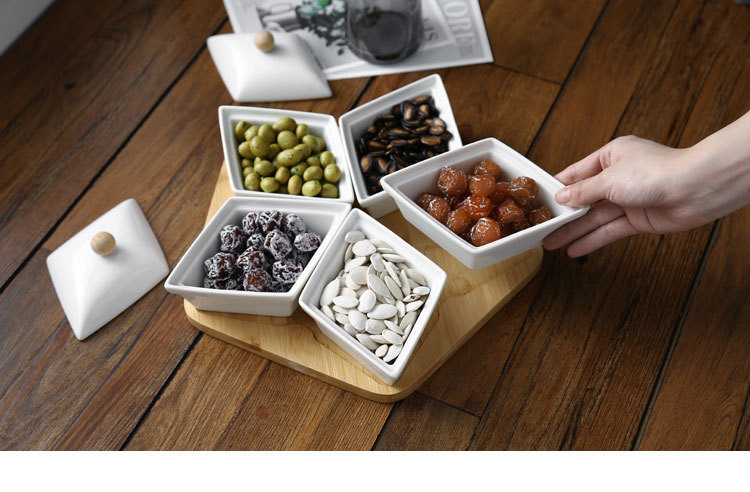 Bandeja de cerámica Europea con tapa, bocadillos creativos en la Sala de estar, bocadillos de frutas secas divididos en celosías, dulces, cajas de frutas blancas puras