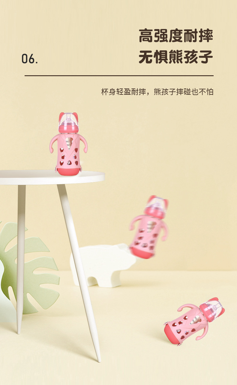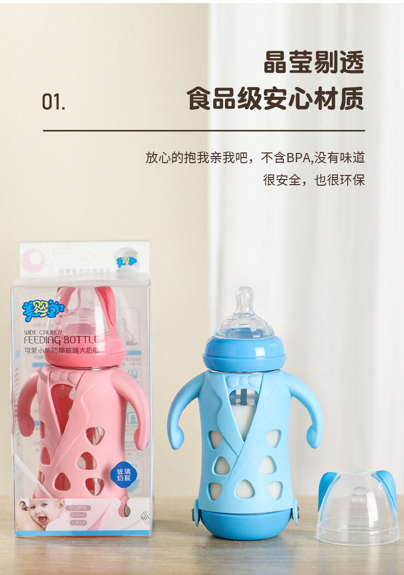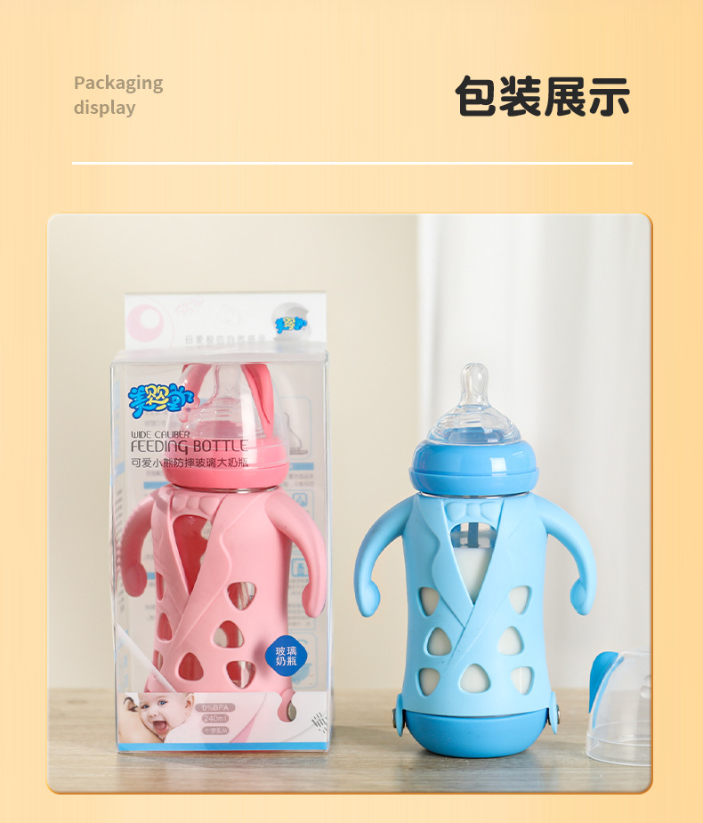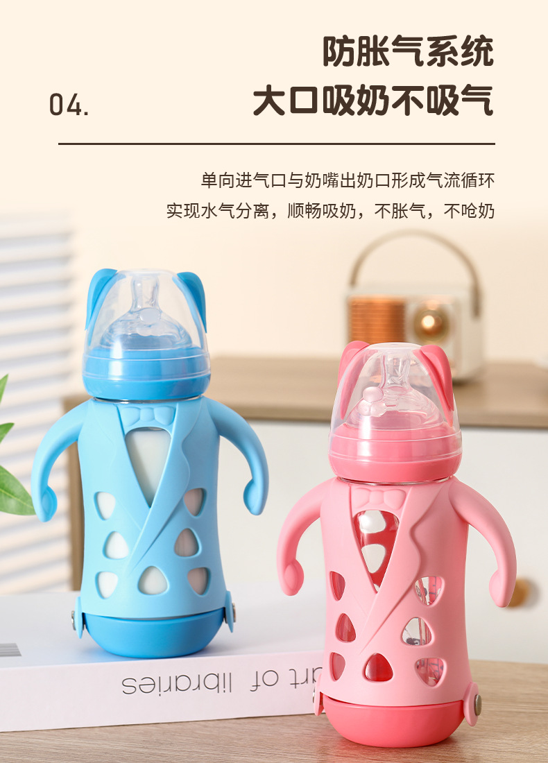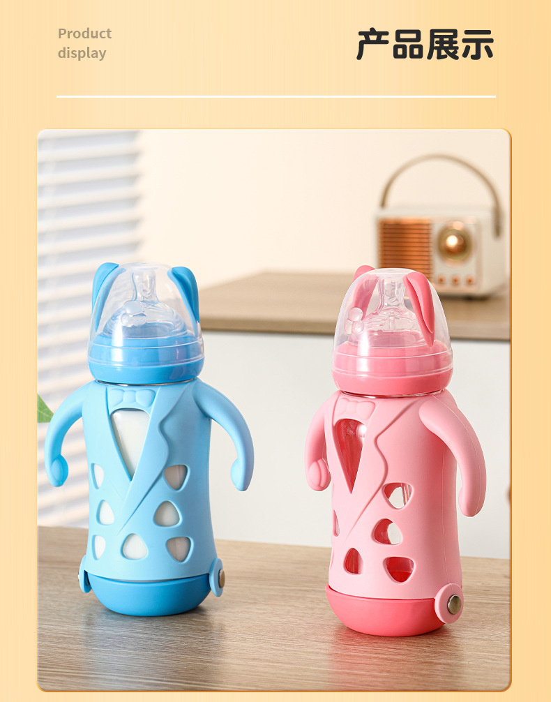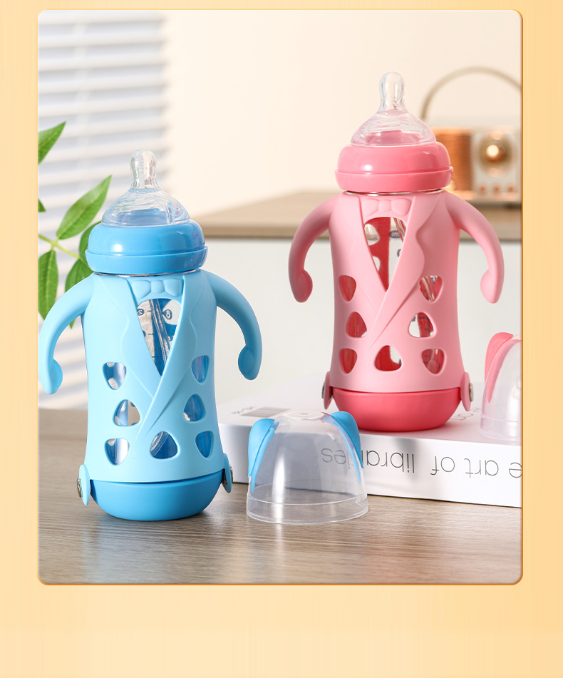 Biberón grande de boca ancha de vidrio antideslizante 240ml biberón de leche para bebés taza de pajita de leche para bebés con mango para aislamiento térmico y biberón antiflatulencia