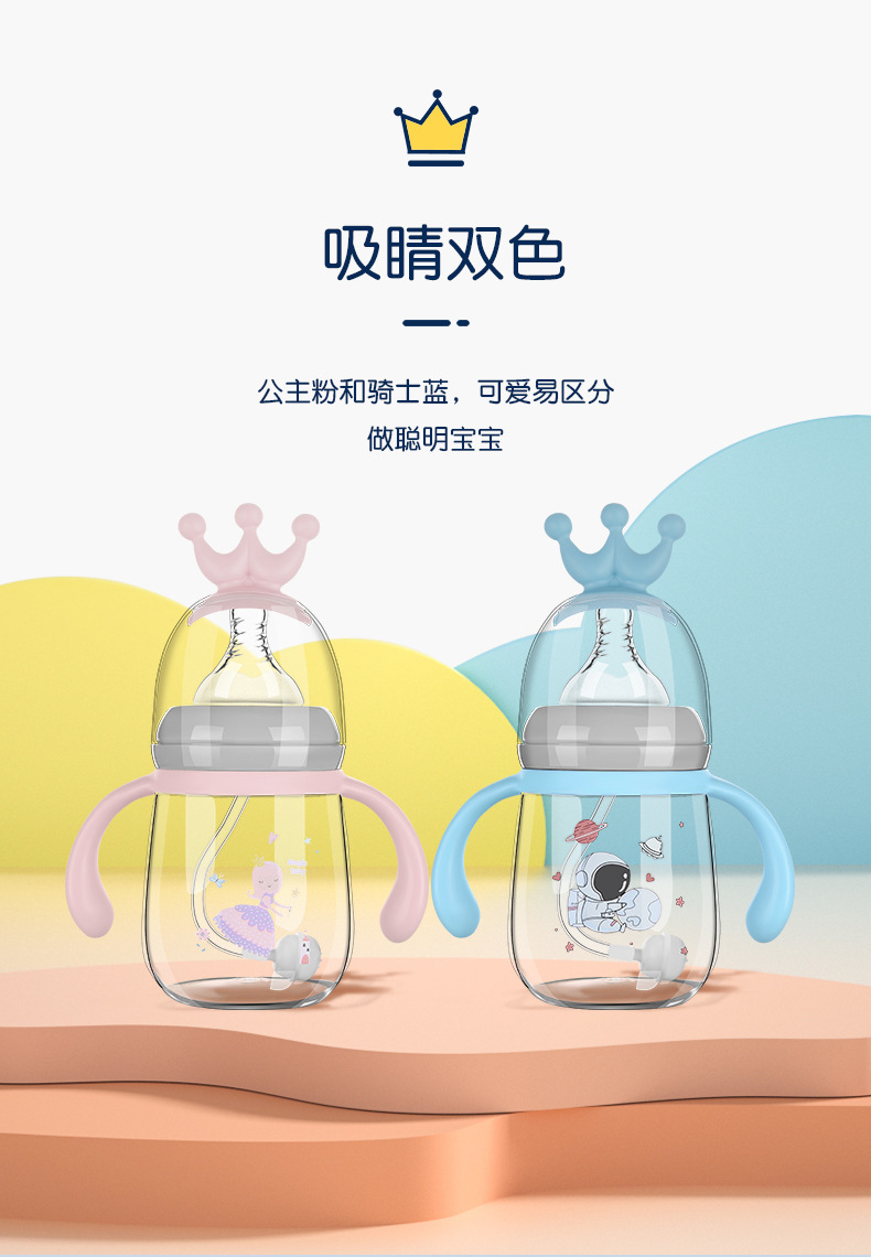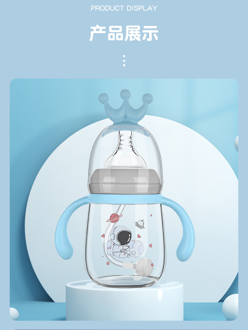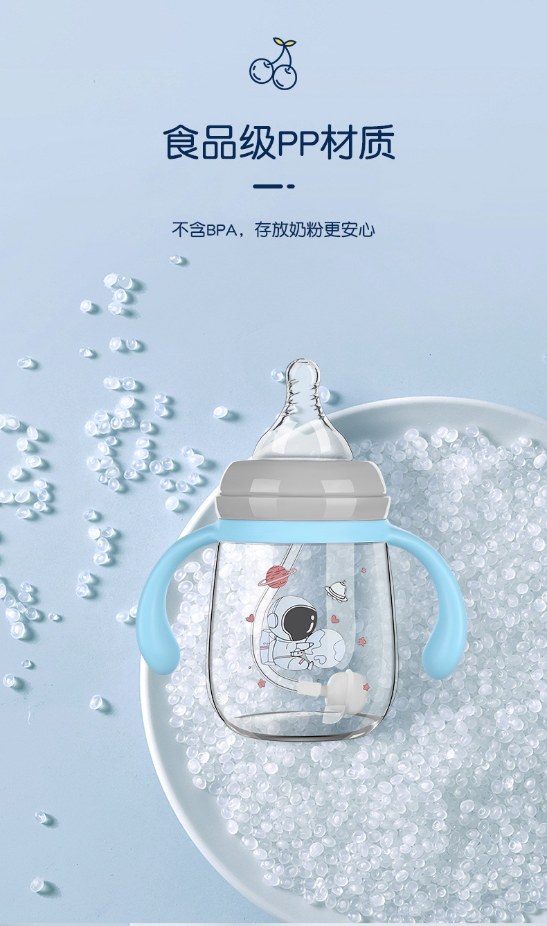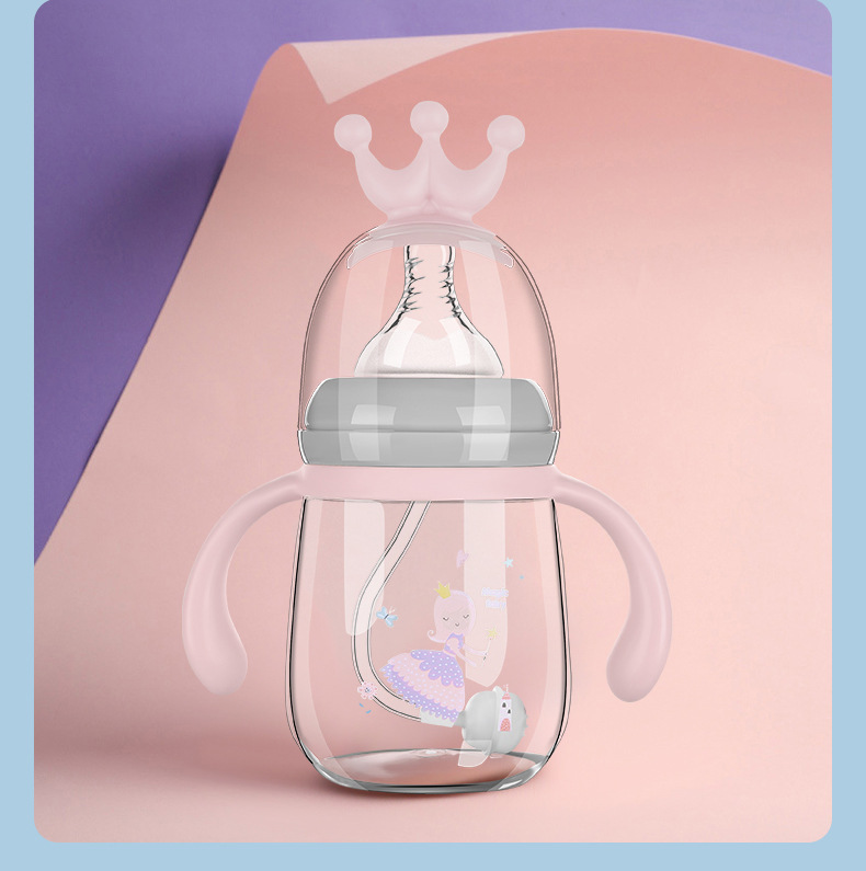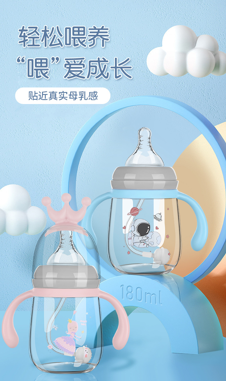 Fabricante mayorista de bebés con mango biberón de plástico de aislamiento térmico 180ml biberón de boca ancha antiflatulencia y resistencia a la caída taza de pajita