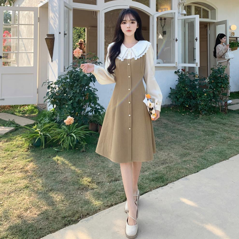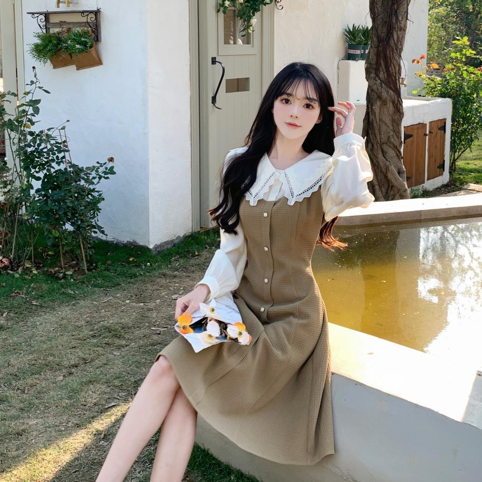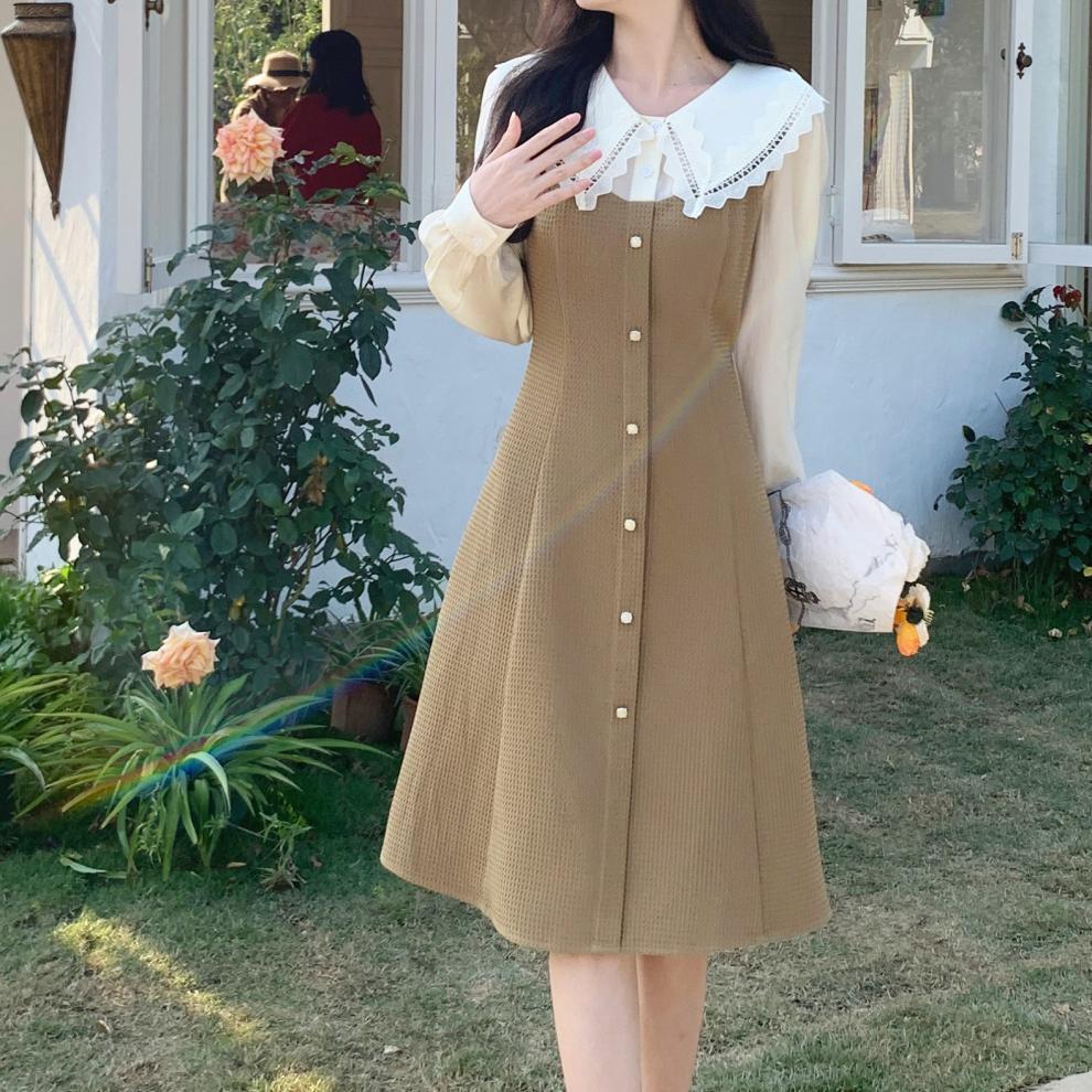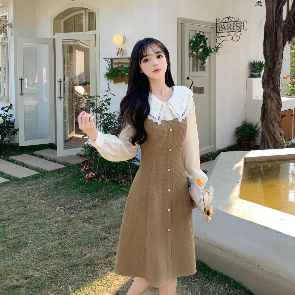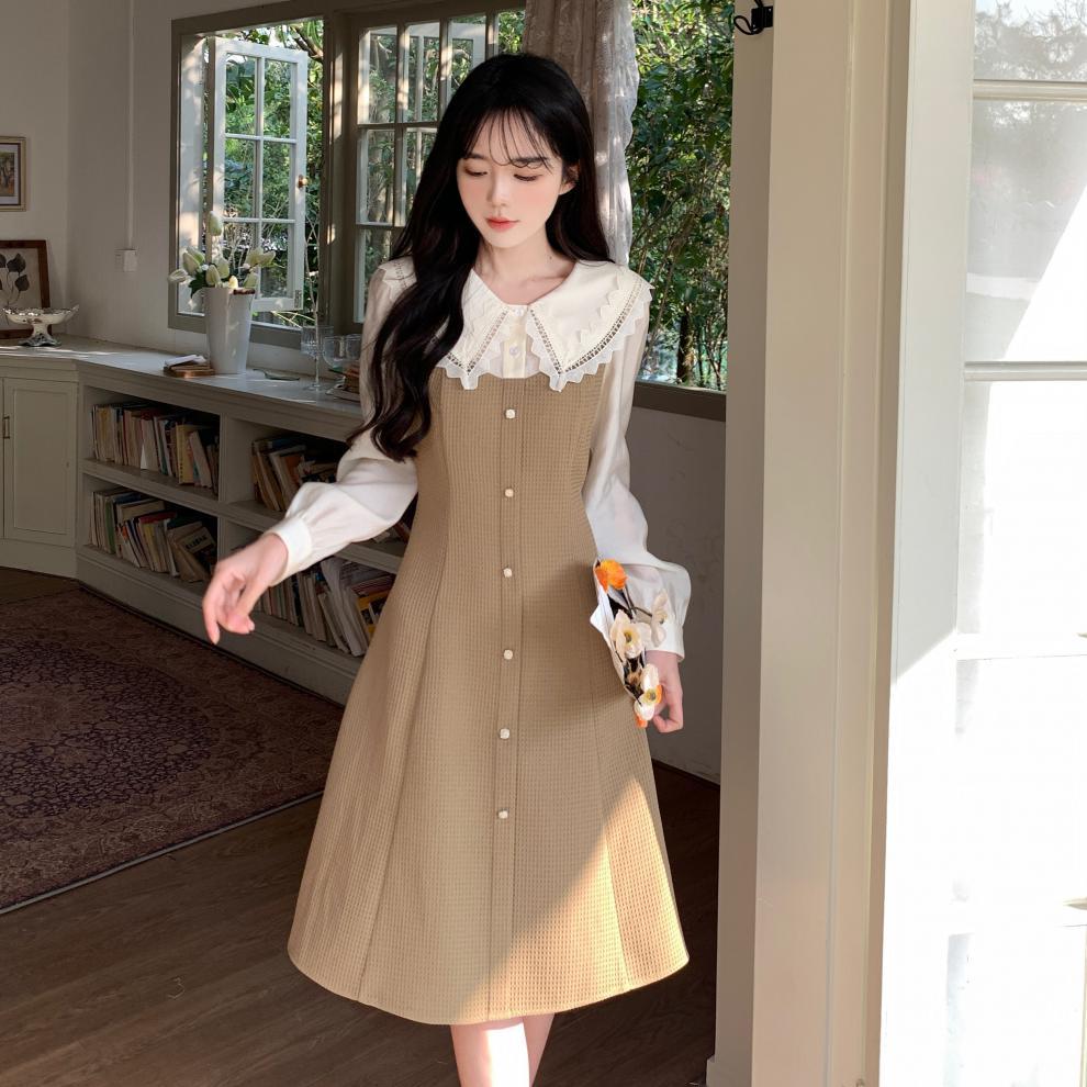 Fotografía real de ropa de mujer de gran talla 2024 a descanso de té muñeca francesa collar temperamento encaje empalme dos vestidos falsos