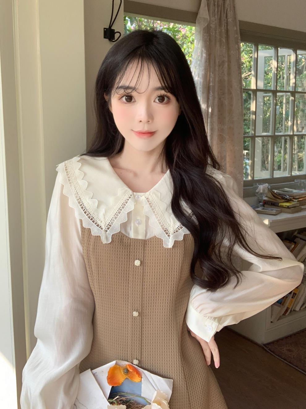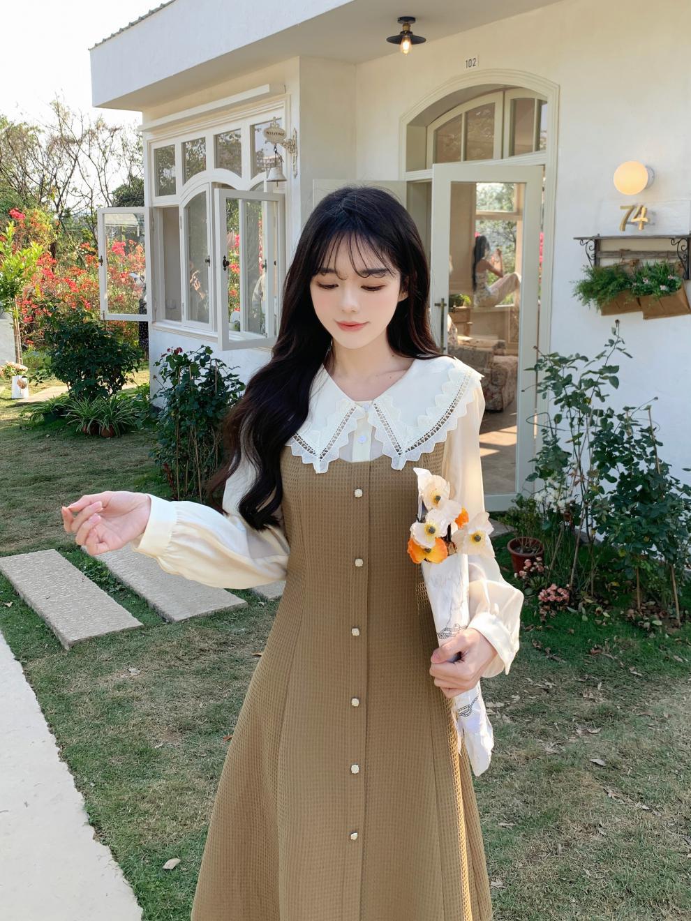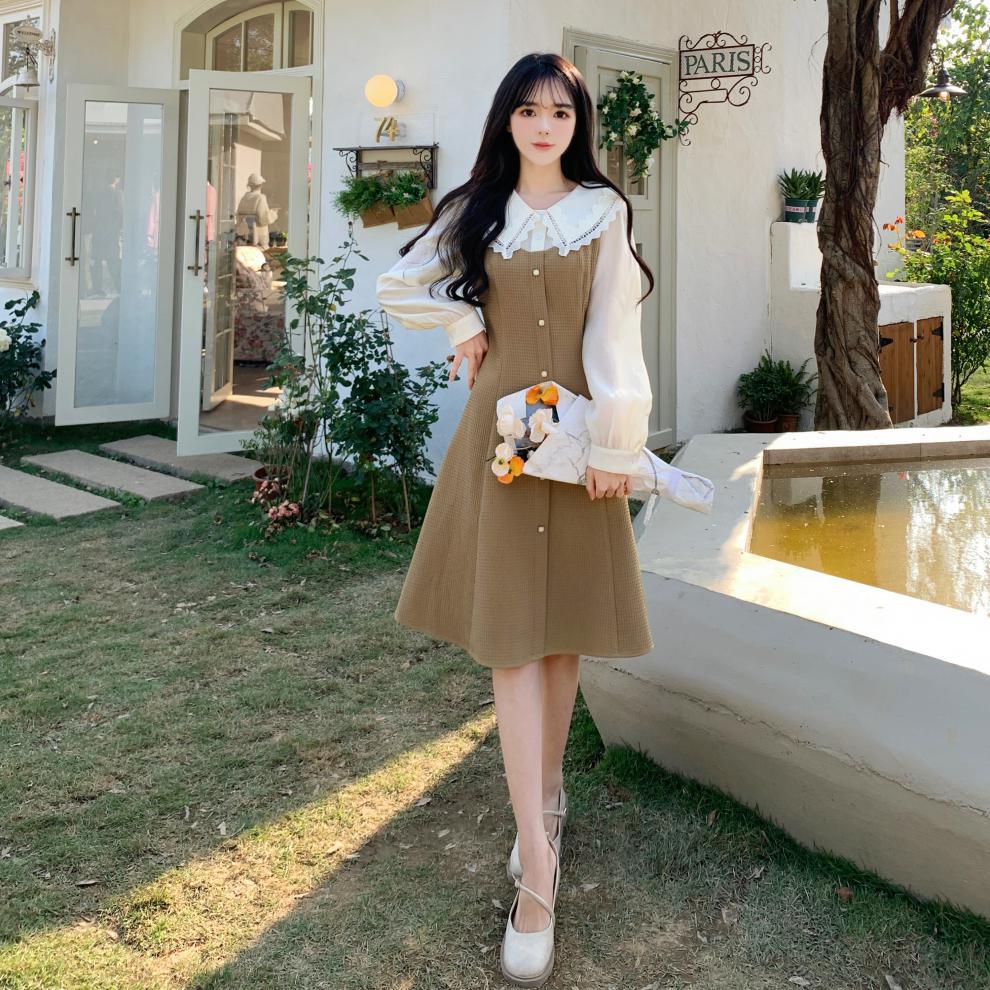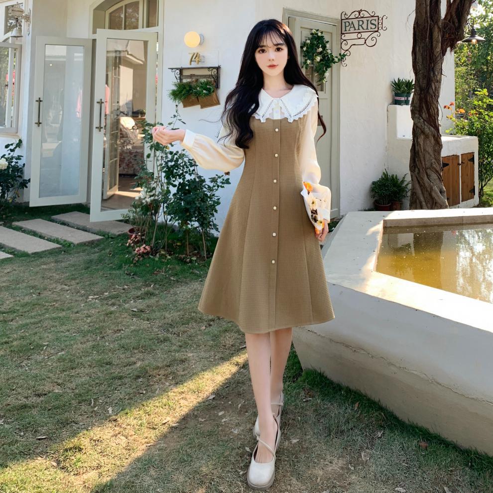 Fotografía real de ropa de mujer de gran talla 2024 a descanso de té muñeca francesa collar temperamento encaje empalme dos vestidos falsos