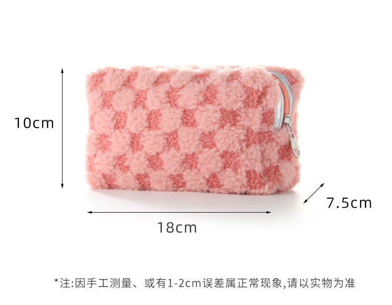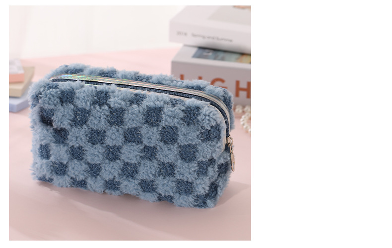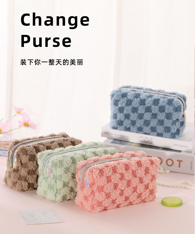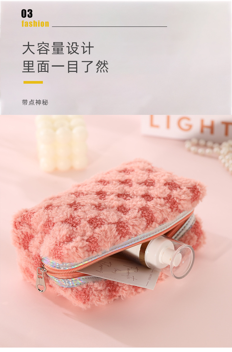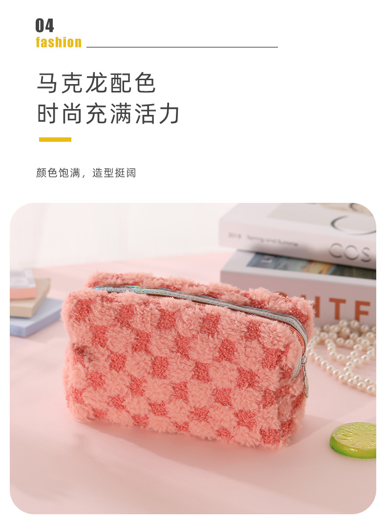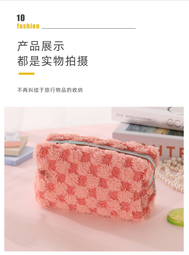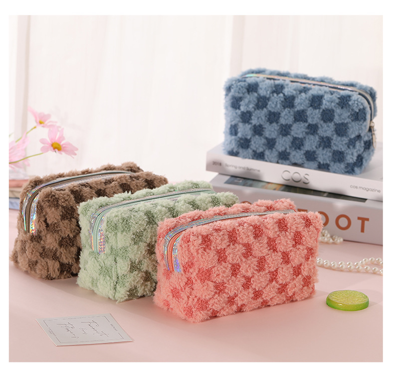 Nuevo paquete de maquillaje de peluche bicolor europeo y americano transfronterizo con patrón de tablero de ajedrez, paquete de lavado de celosía bicolor de gran capacidad