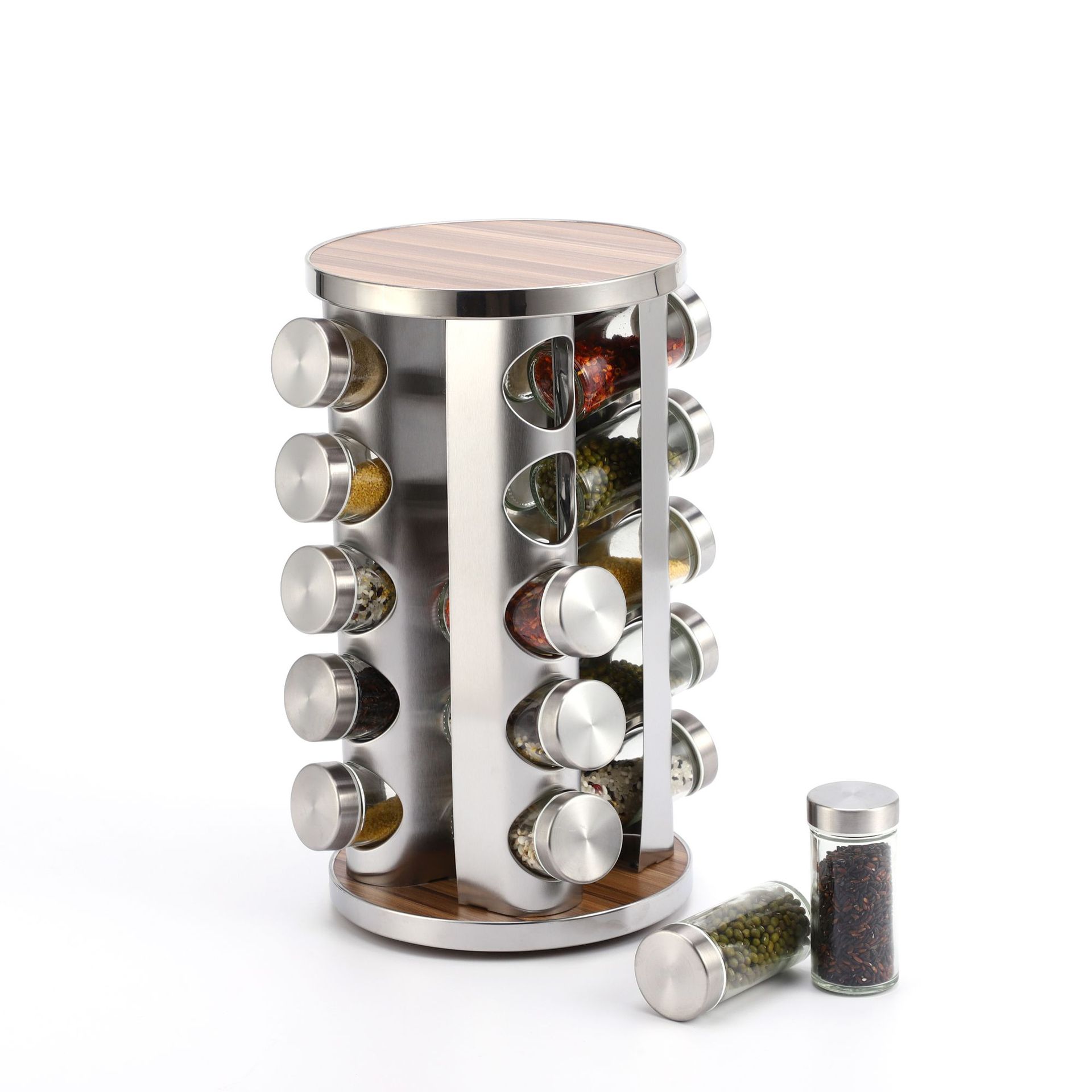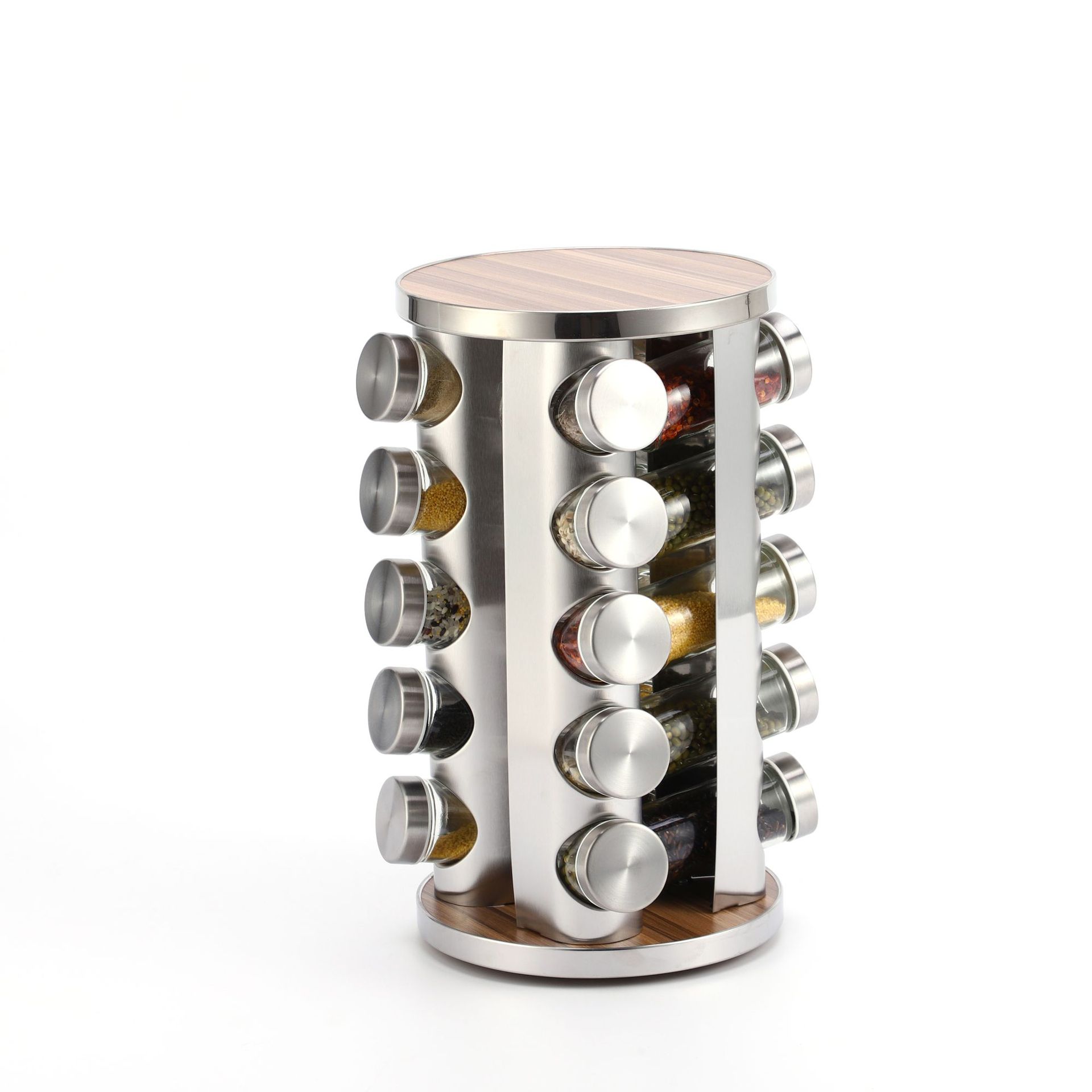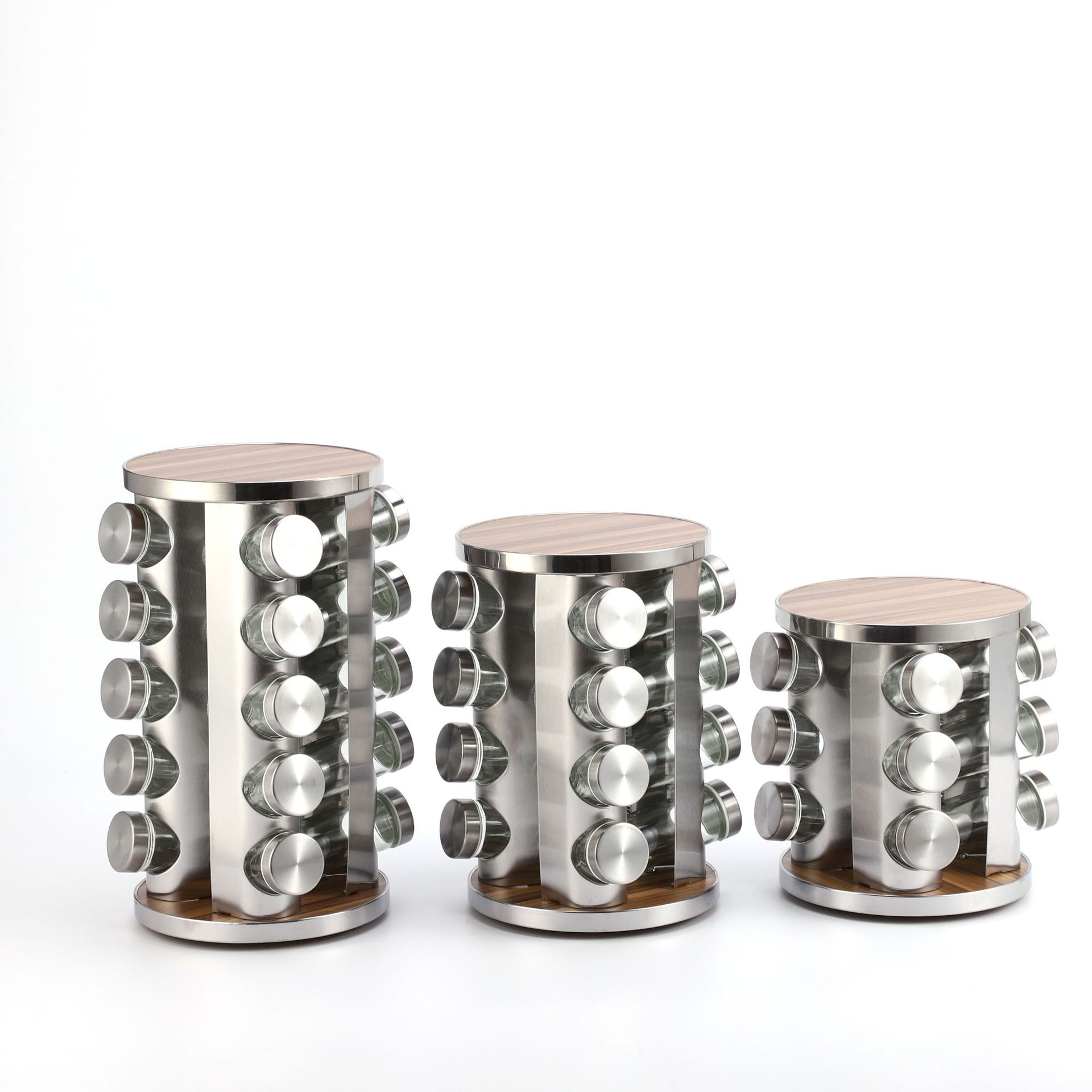 Juego de botellas de condimento de base redonda de madera transfronteriza con tapa redonda de 20 cabezas de acero inoxidable con estante giratorio tanque de especias de cocina