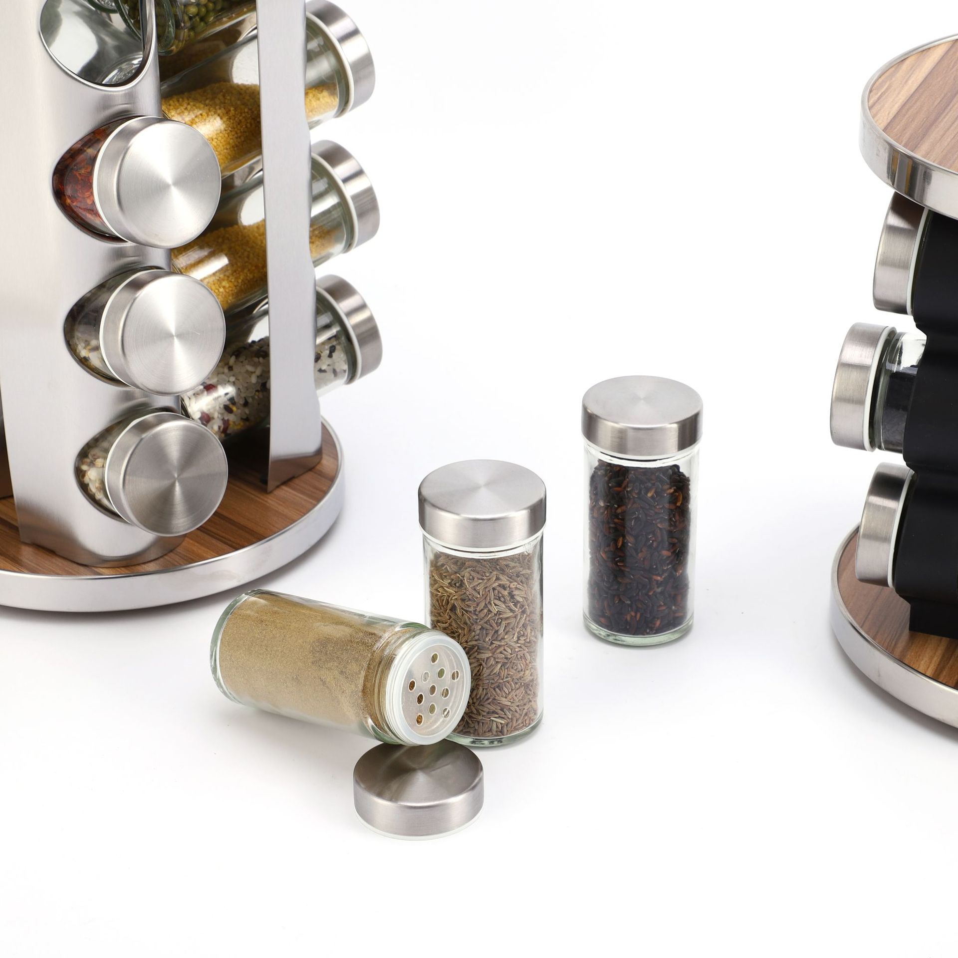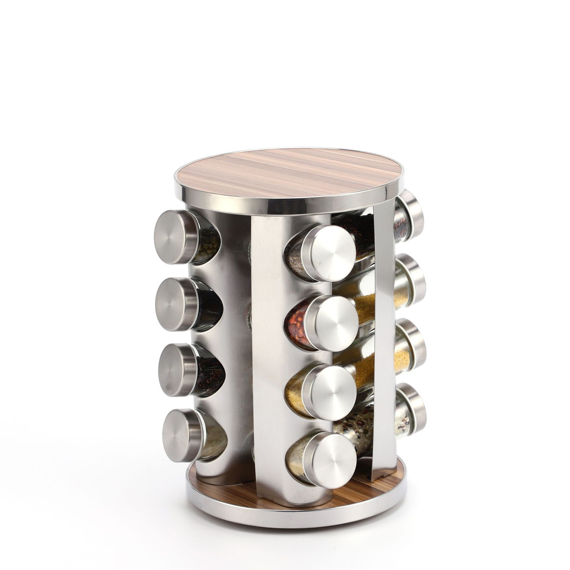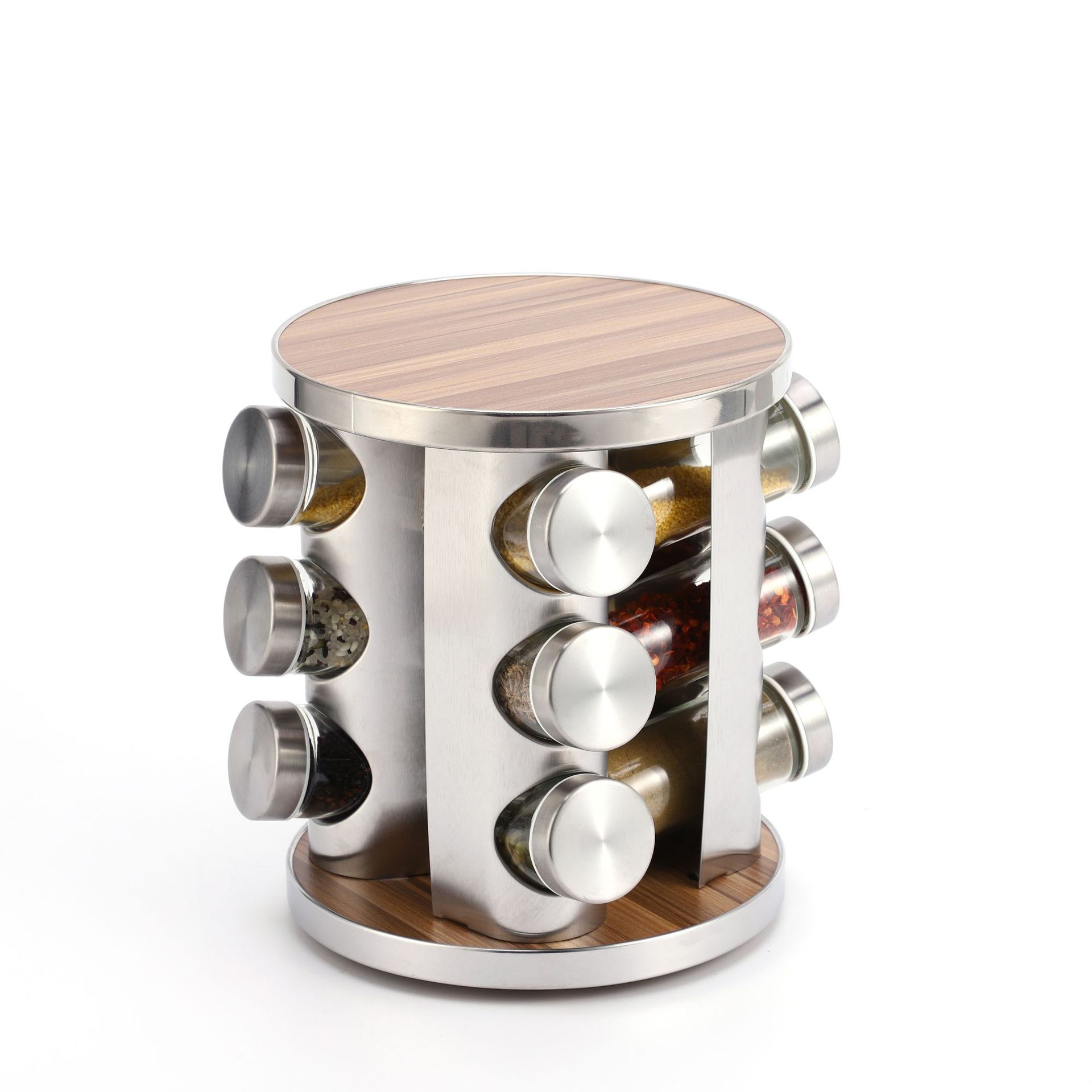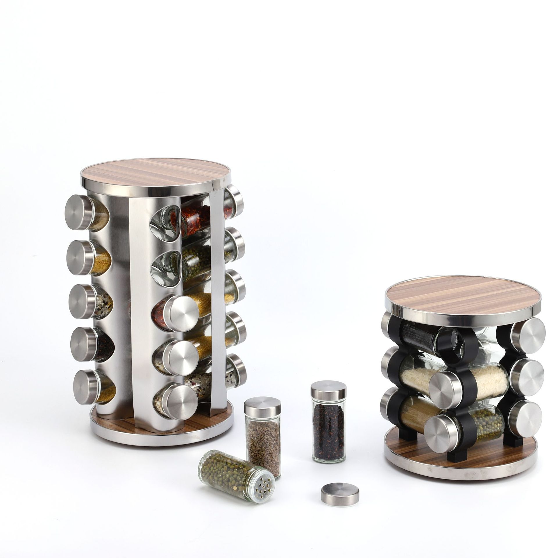 Juego de botellas de condimento de base redonda de madera transfronteriza con tapa redonda de 20 cabezas de acero inoxidable con estante giratorio tanque de especias de cocina