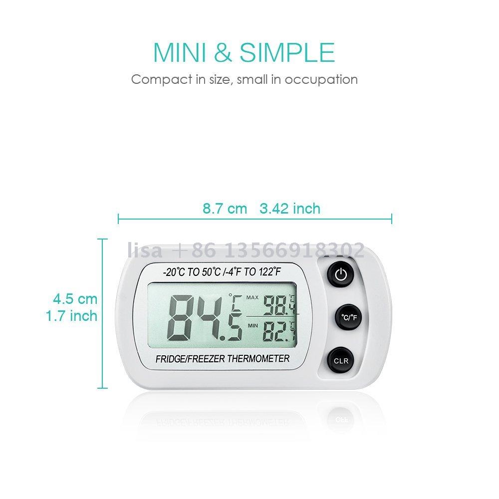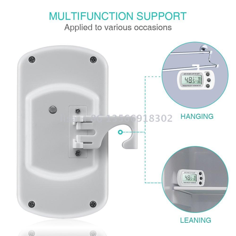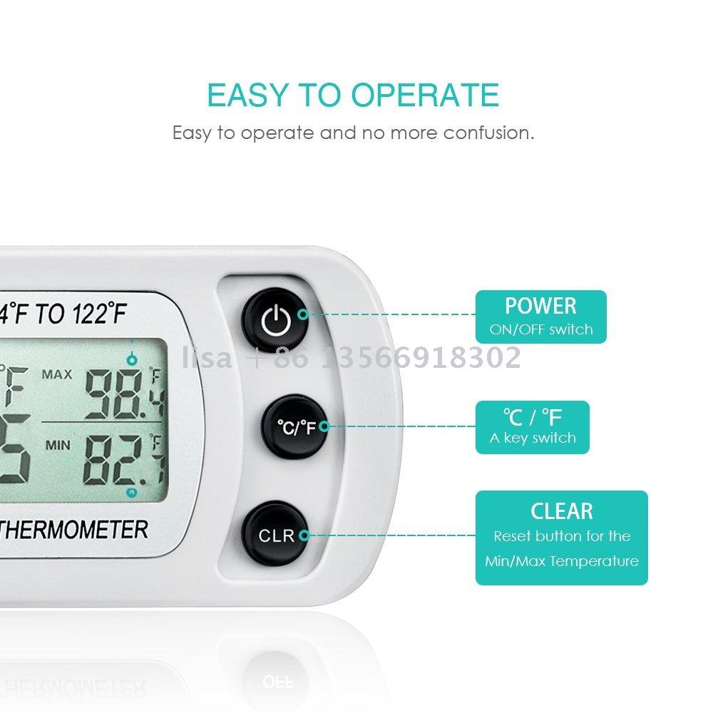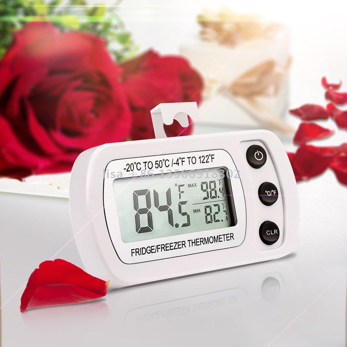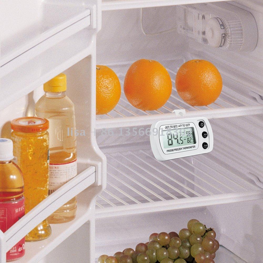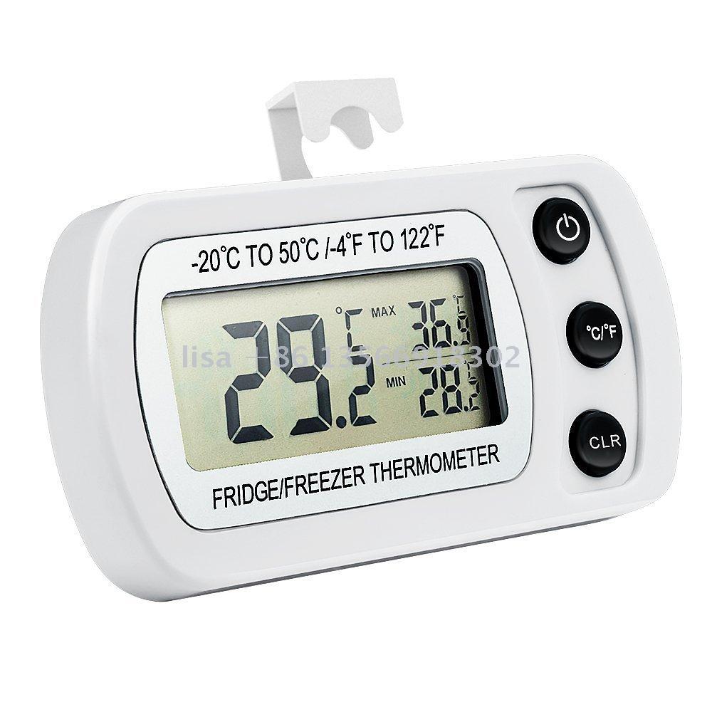 El termómetro del congelador del refrigerador mide la temperatura y registra la temperatura de los alimentos. el termómetro electrónico digital muestra el termómetro fresco del supermercado.