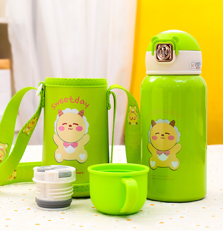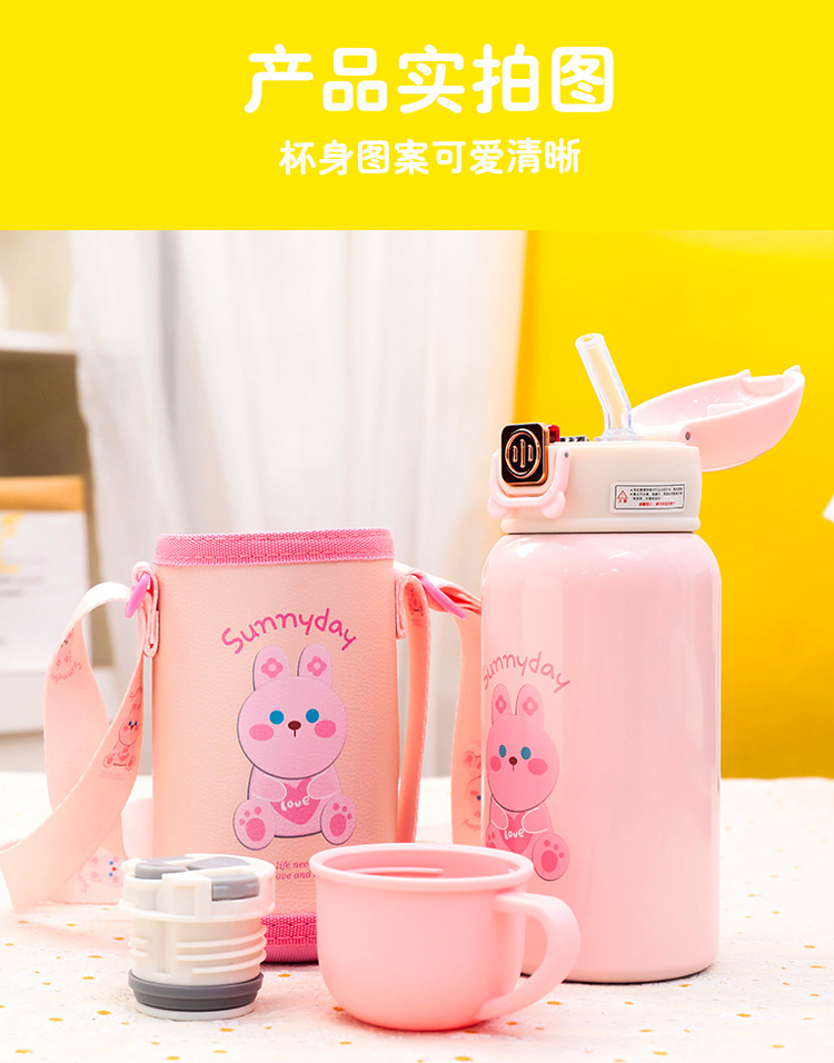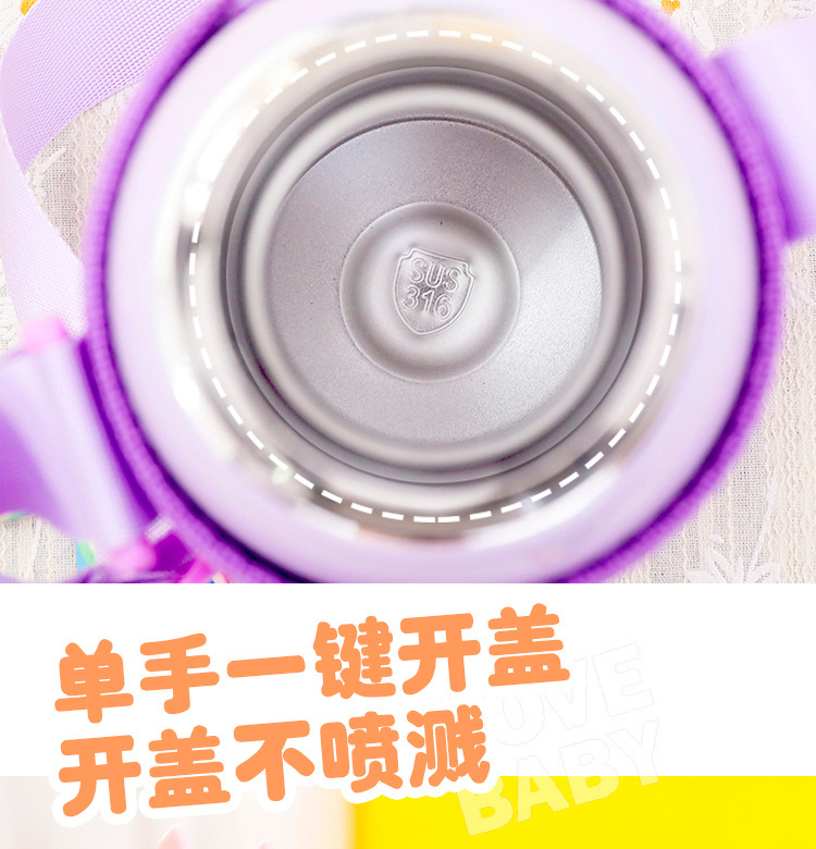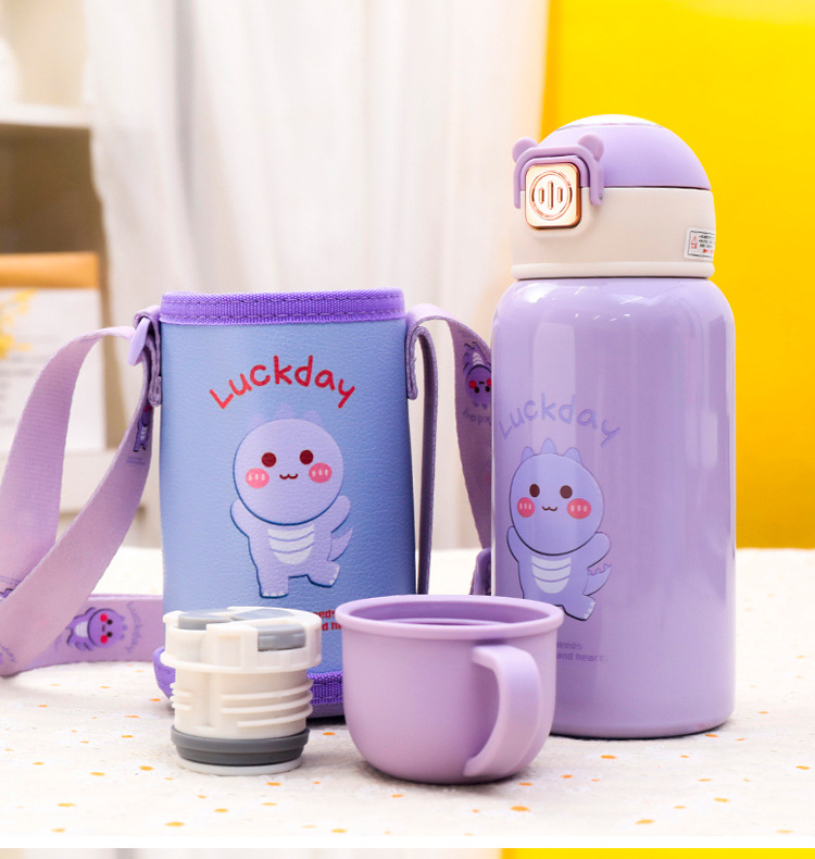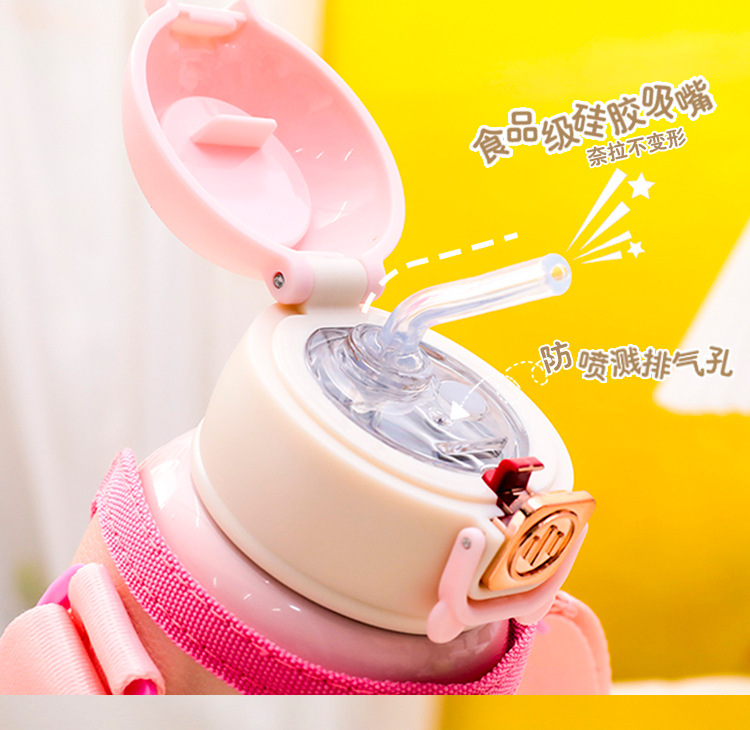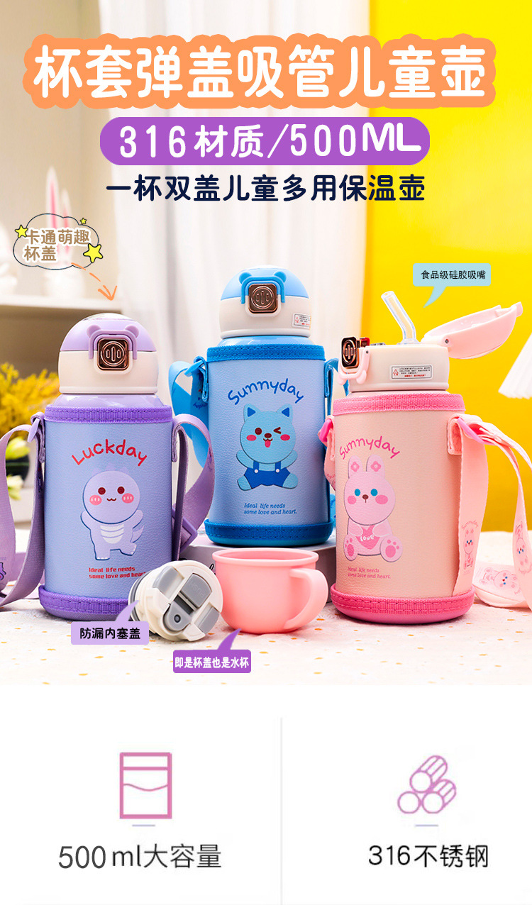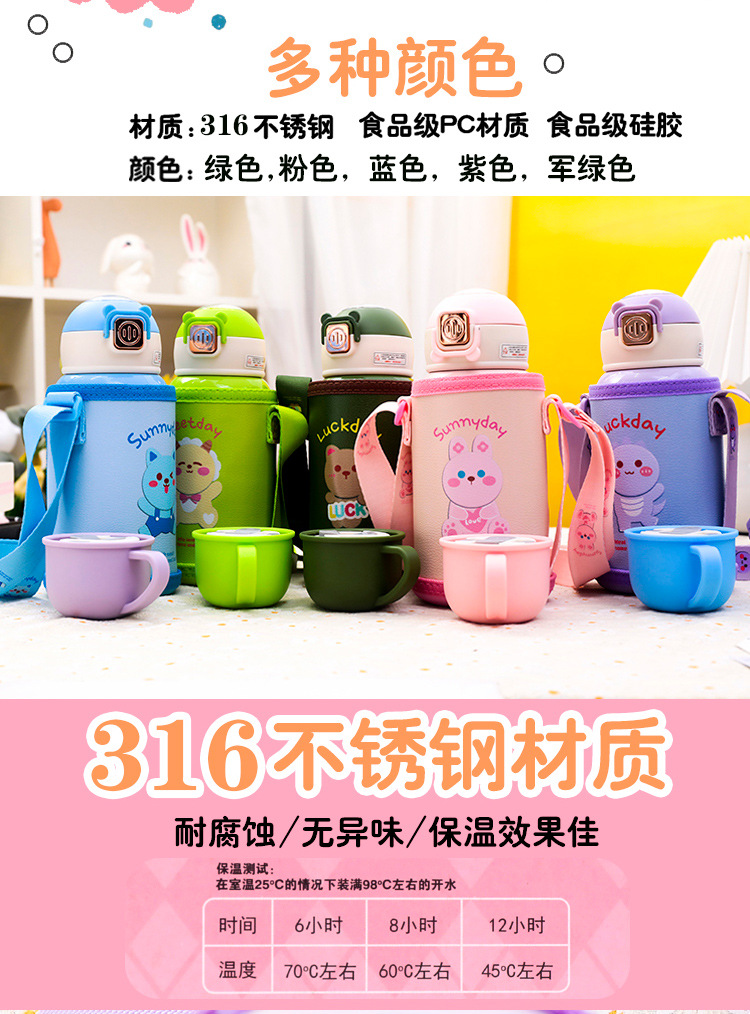El bebé lleva una tetera 316 taza térmica de acero inoxidable, taza de agua de dibujos animados, doble tapa, taza térmica de pajita de doble uso