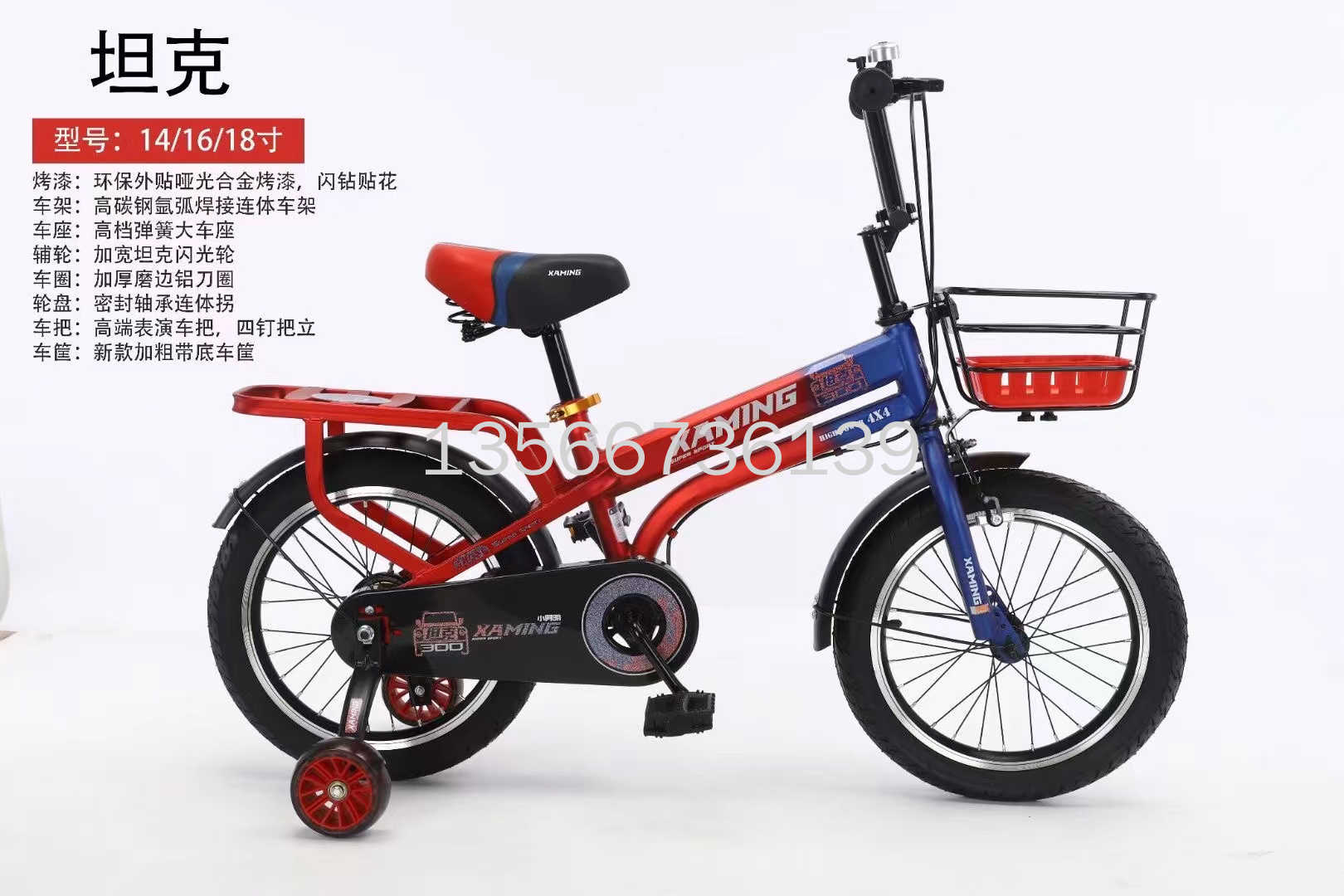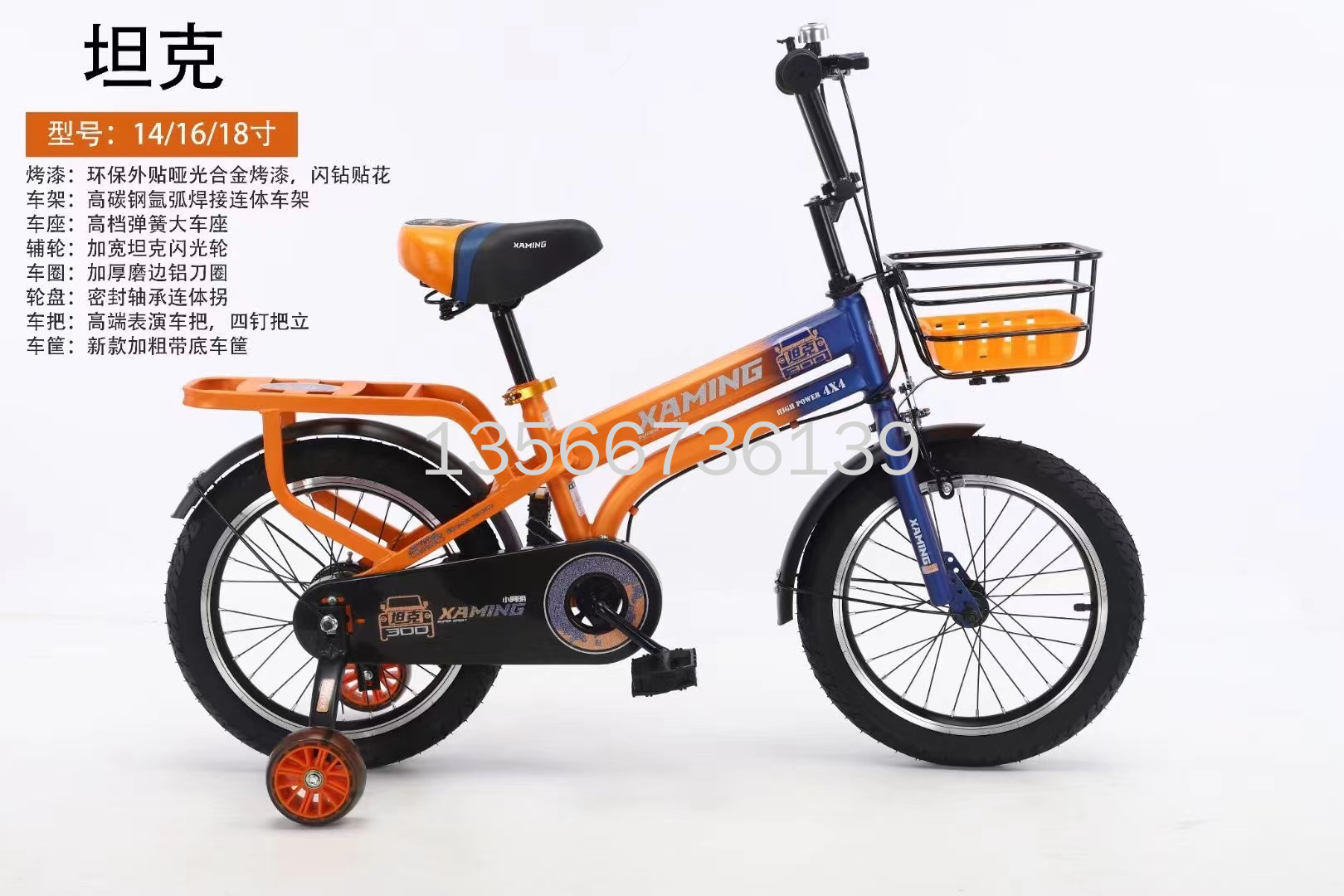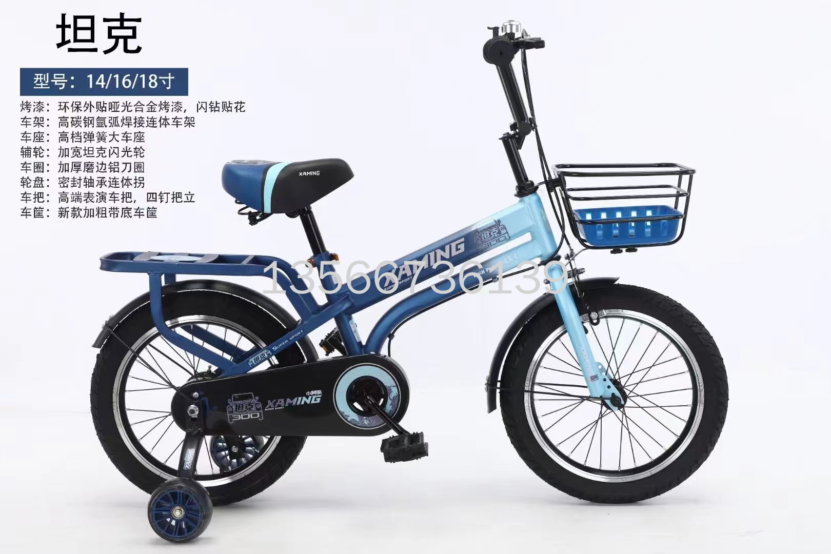 2022新款儿童自行车,坦克,轻便,带车筐带后座,闪钻贴画,14/16/18寸,儿童自行车。本店不支持七天无理由退换货。