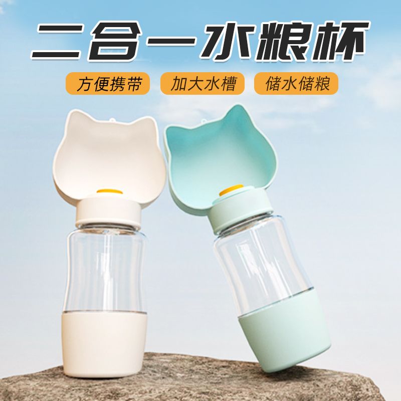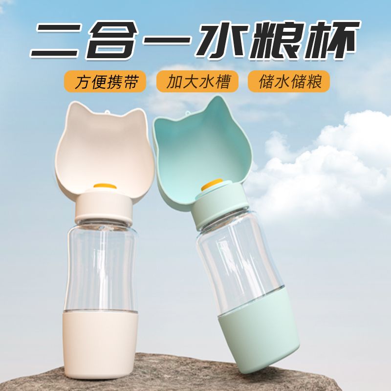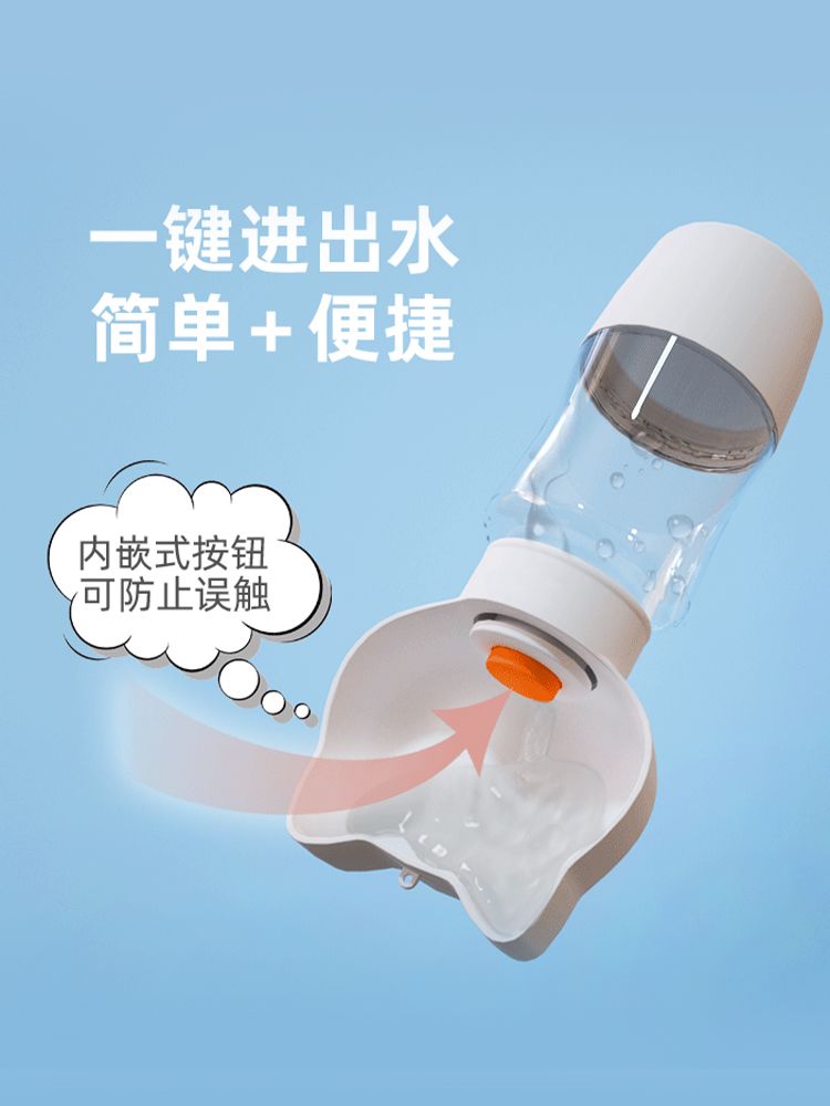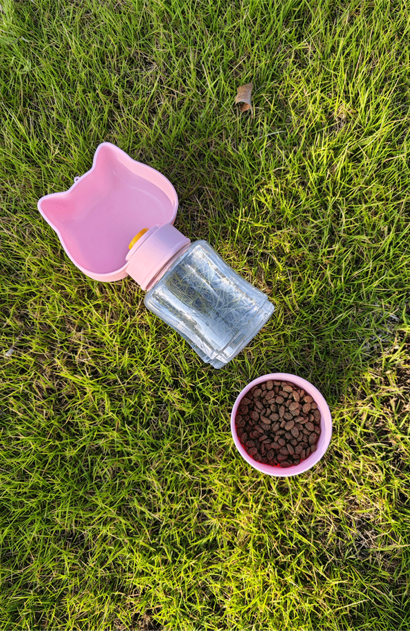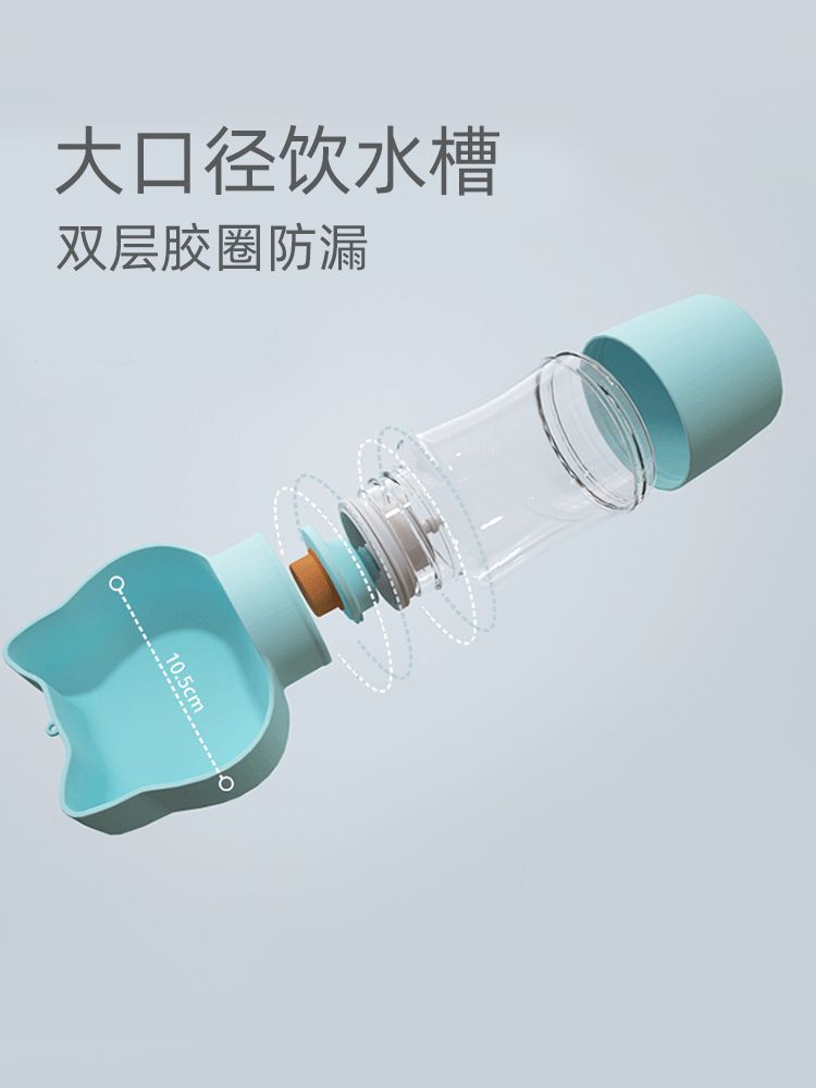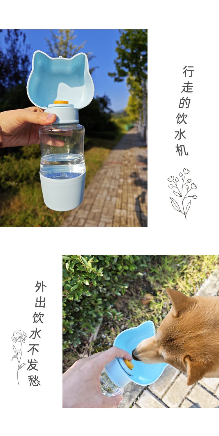 El perro sale del vaso de agua, el dispensador de agua portátil, el hervidor de agua del perro, la mascota acompaña el vaso, el cachorro bebe agua al aire libre y sale a alimentar el agua.