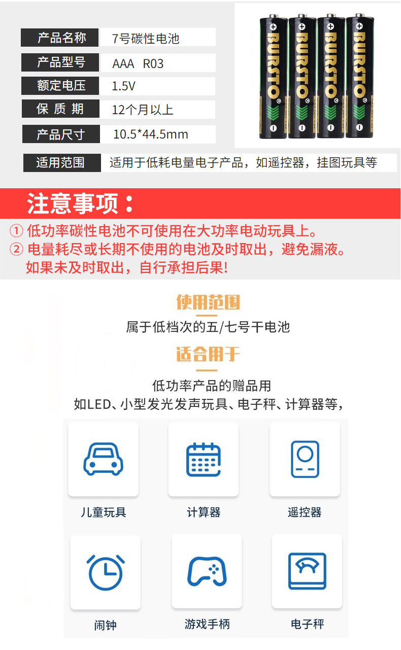 【产品说明】本款为7号1.5V AAA R03普通型低功率碳性电池,只适用于耗电量低的产品(比如遥控器,有声挂图,发光小玩具等)做赠品赠送或产品试机使用,下单前可免费拿样测试,大货质量以样品为准!大功率电子产品请选择7号高功率碳性电池或碱性电池,详情请咨询客服! 【发货说明】5点半前拍下的订单均可当天发货,节假日可能延迟发货!