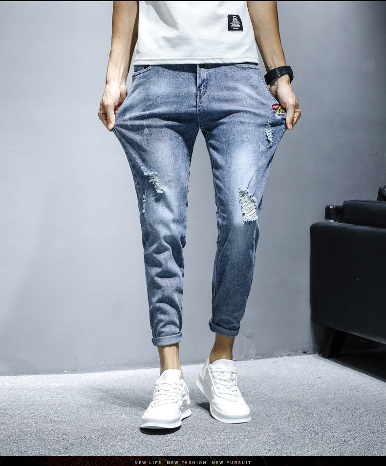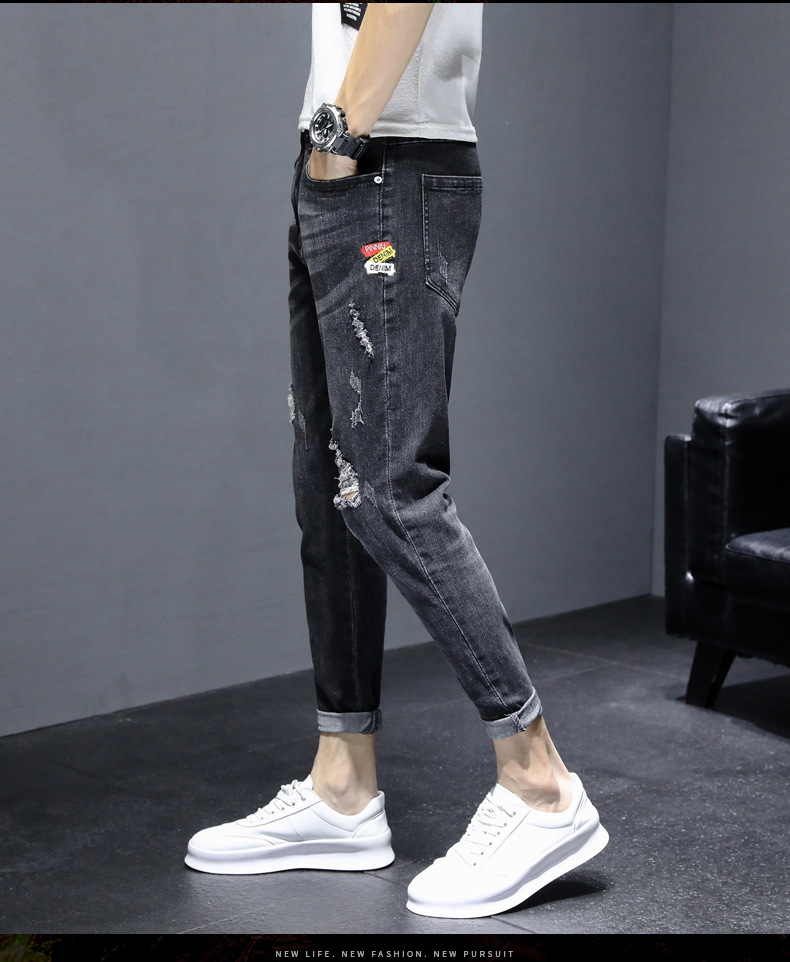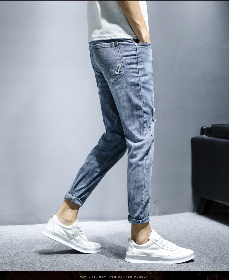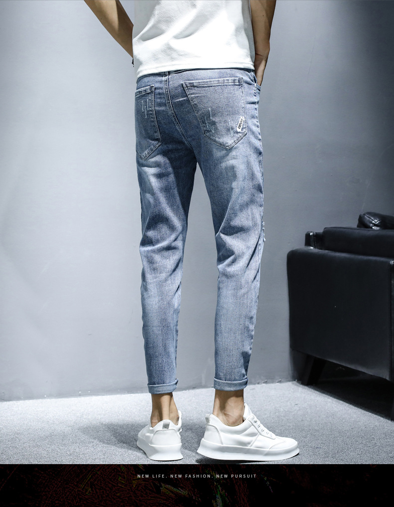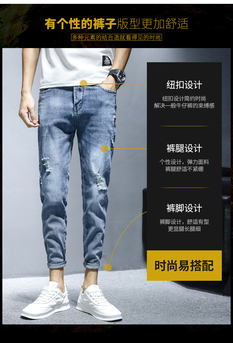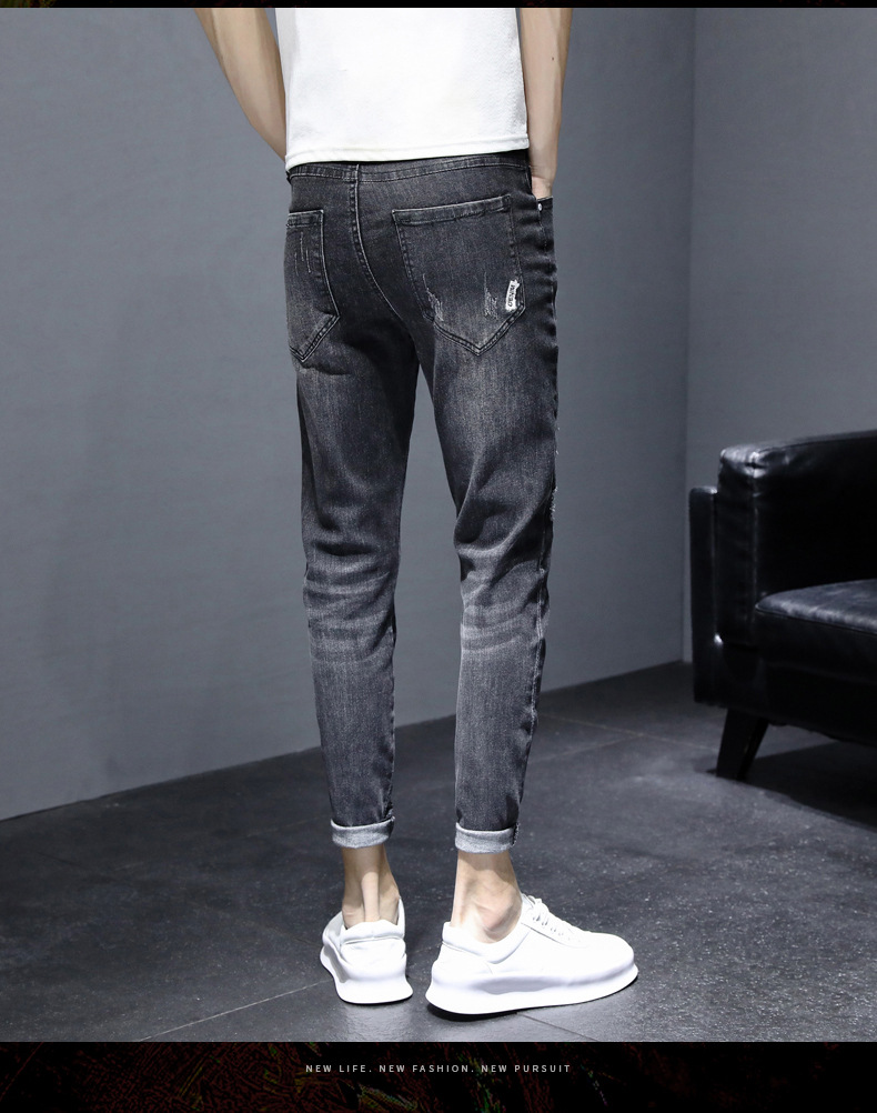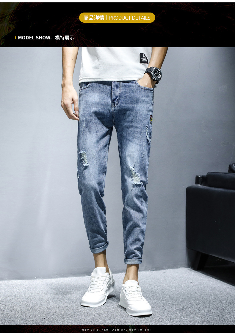 Jeans para hombres, marca de moda de primavera y otoño, versión coreana de moda, verano delgado, agujeros rotos, pies pequeños, pantalones de otoño de nueve puntos