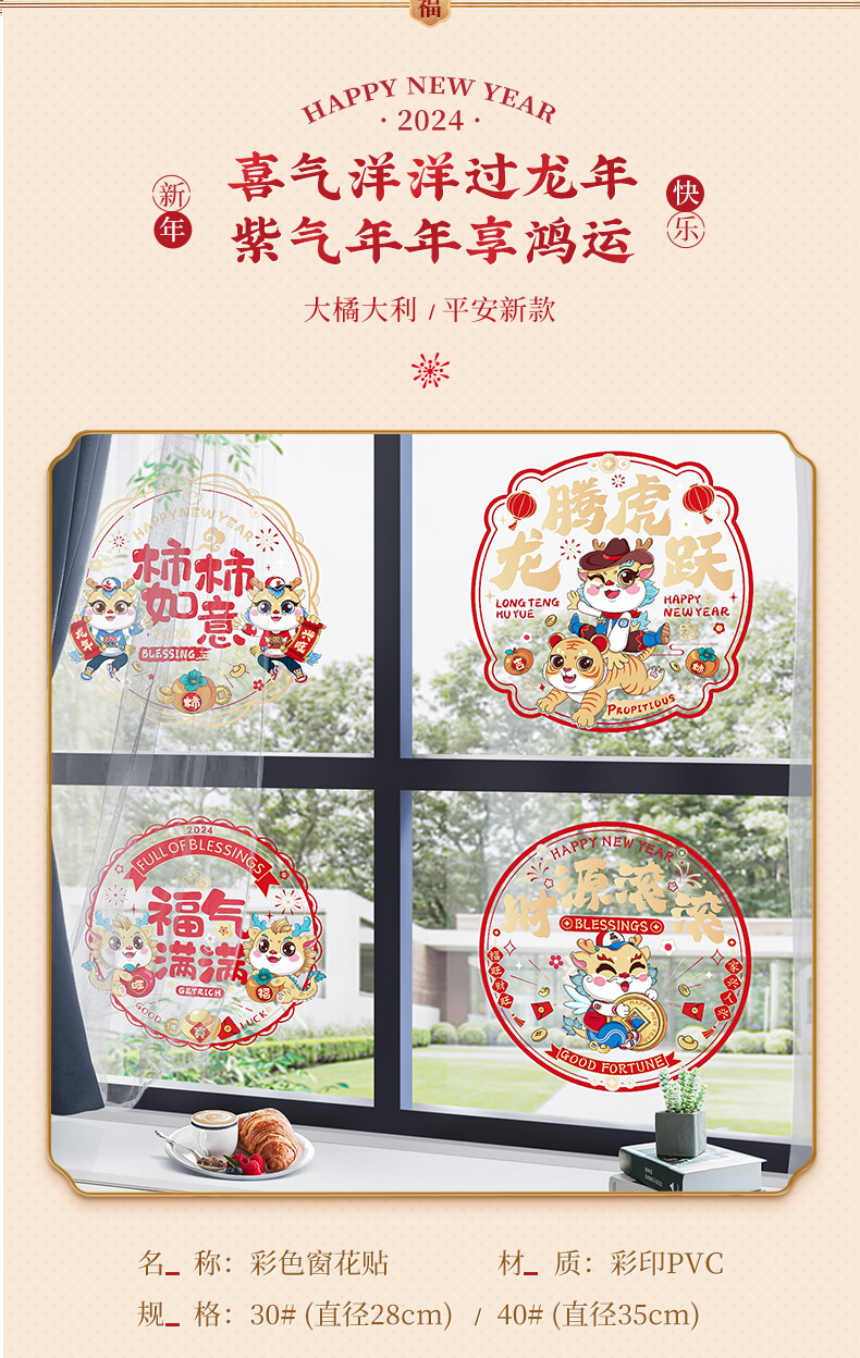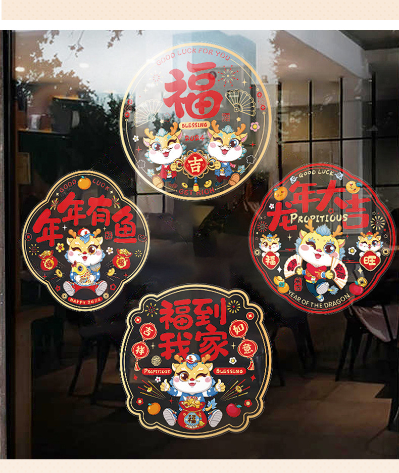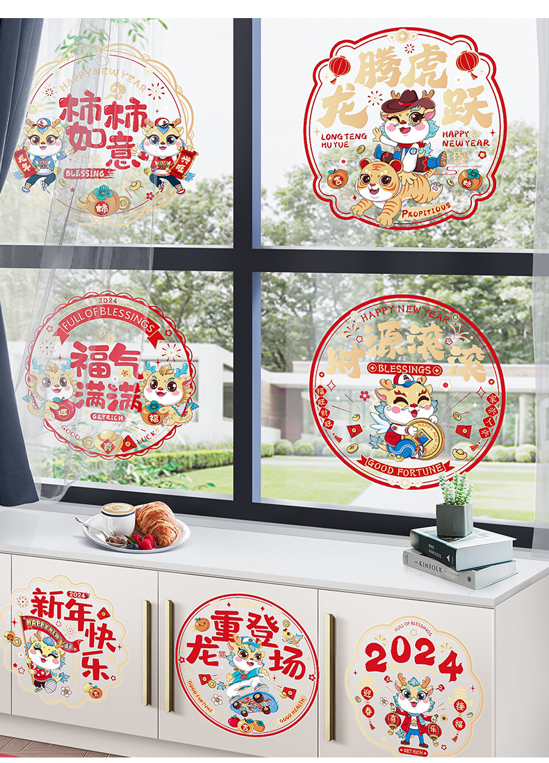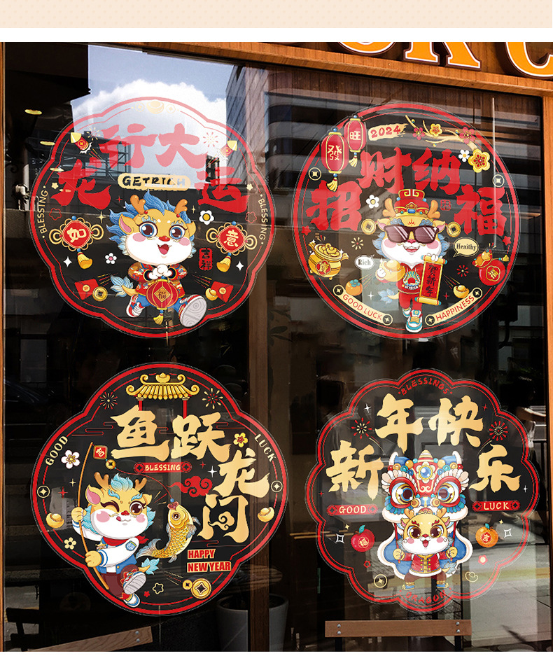 Flores de ventana de color del año nuevo del dragón 2024 pegatinas estáticas del Zodiaco del Festival de primavera pegatinas decorativas del año nuevo pegatinas de ventanas de dibujos animados del año nuevo