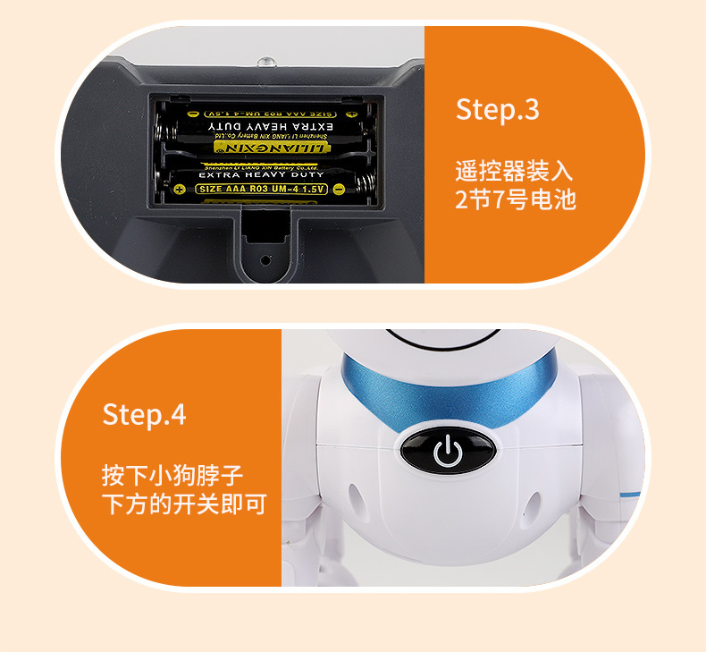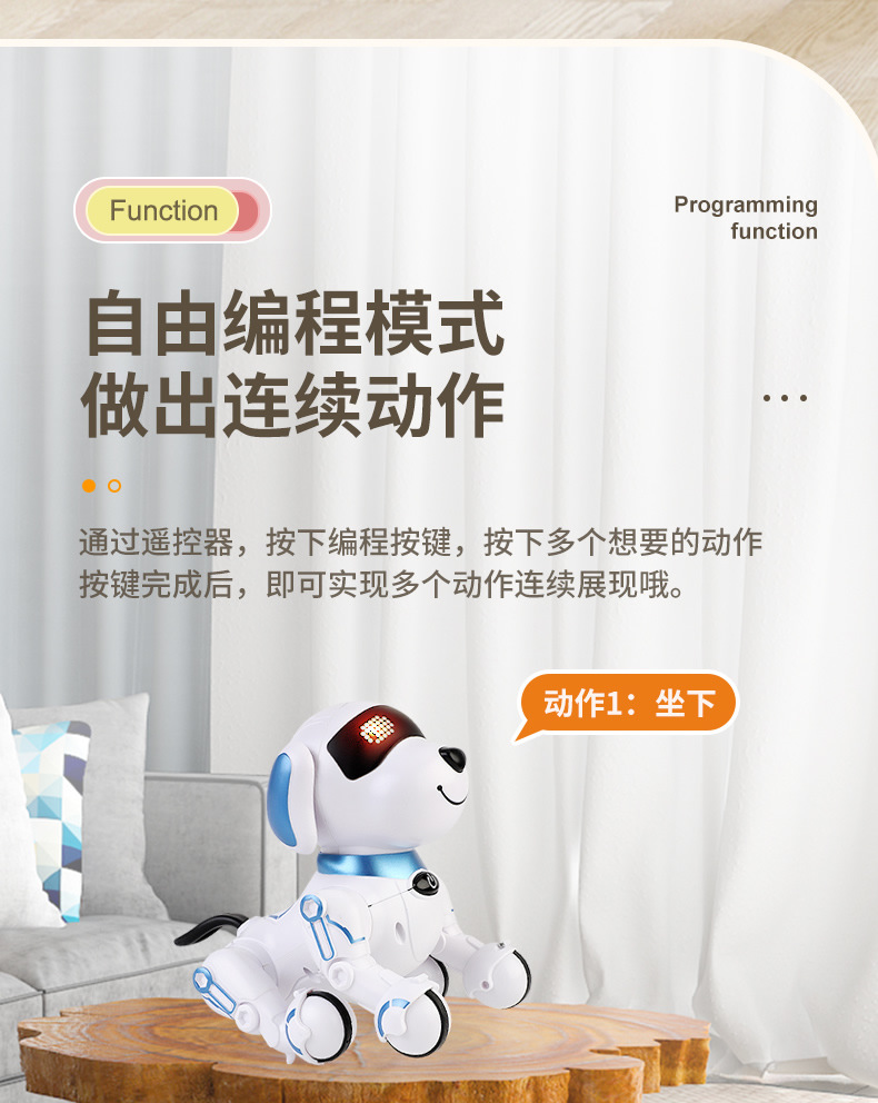 产品货号:878C中文(Y878英文) 产品名称:红外线遥控编程智能机器狗(中文/英文/俄文) 产品颜色:蓝色/橙色 产品重量:580g(含彩盒包装) 产品尺寸:21.5*13.1*18CM 彩盒尺寸:19*14.5*22CM 外箱尺寸:60*39.5*46CM; 60*59*46CM 装箱数量:16PCS; 24PCS 毛净重: 11/9.5KG; 16.5/14.5KG 遥控时间:40分钟 充电时间:90分钟(500毫安锂电池) 产品为中文、英文彩盒包装,适合国内外电商平台销售有以下认证证书: FCC/BSEN71/EN62115+灯/10P/ASTM F963/HR4040/CE/CPC/内销3C 产品英文图片、视频、认证证书资料请咨询客服领取 Phone/微信:13267767533 QQ:3684489
