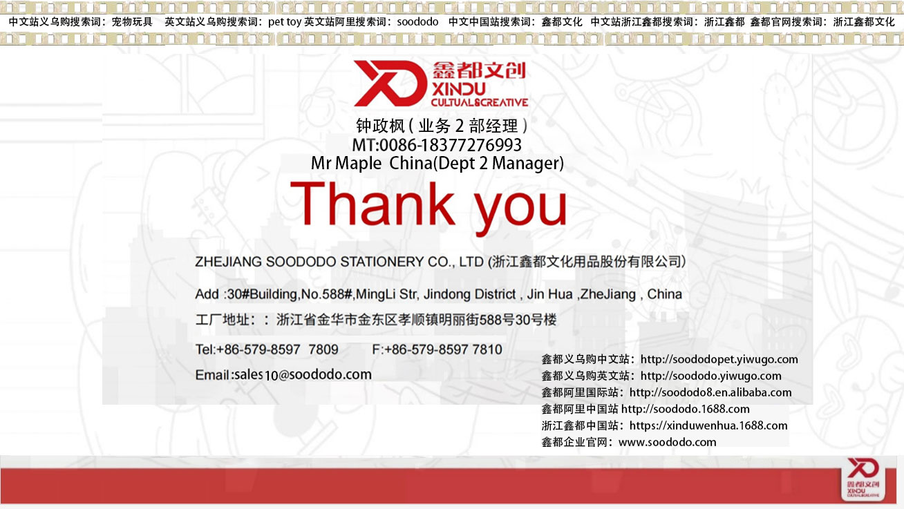 浙江鑫都文创出品宠物玩具 宠物产品 宠物运动器材 宠物工具等商品通过迪士尼 沃尔玛 bsci 等国际产品认证 产品热销欧洲宠物市场 美国宠物产品市场 澳大利亚宠物产品市场 加拿大宠物产品市场 中东宠物用品市场 亚洲宠物展览商品市场 soododo公司成立于2010,宠物产品有2000多个sku。 本公司拥有65台塑料机械,有2800套成型模具。鑫都宠物产品设计新颖,每年都有大量新产品投放宠物出口市场。鑫都拥有专业的产品研发团队和模具间。办公室服务人员有30多名。为客户第一时间解决销售业务问题。鑫都公司拥有文创产品设计生产,造型橡皮擦生产,宠物用品生产车间,硅胶产品生产车间 奖杯奖牌生产车间,浙江鑫都文创是中国一流文创教育办公玩具一条龙生产企业。欢迎各界国内外朋友光临指导工作