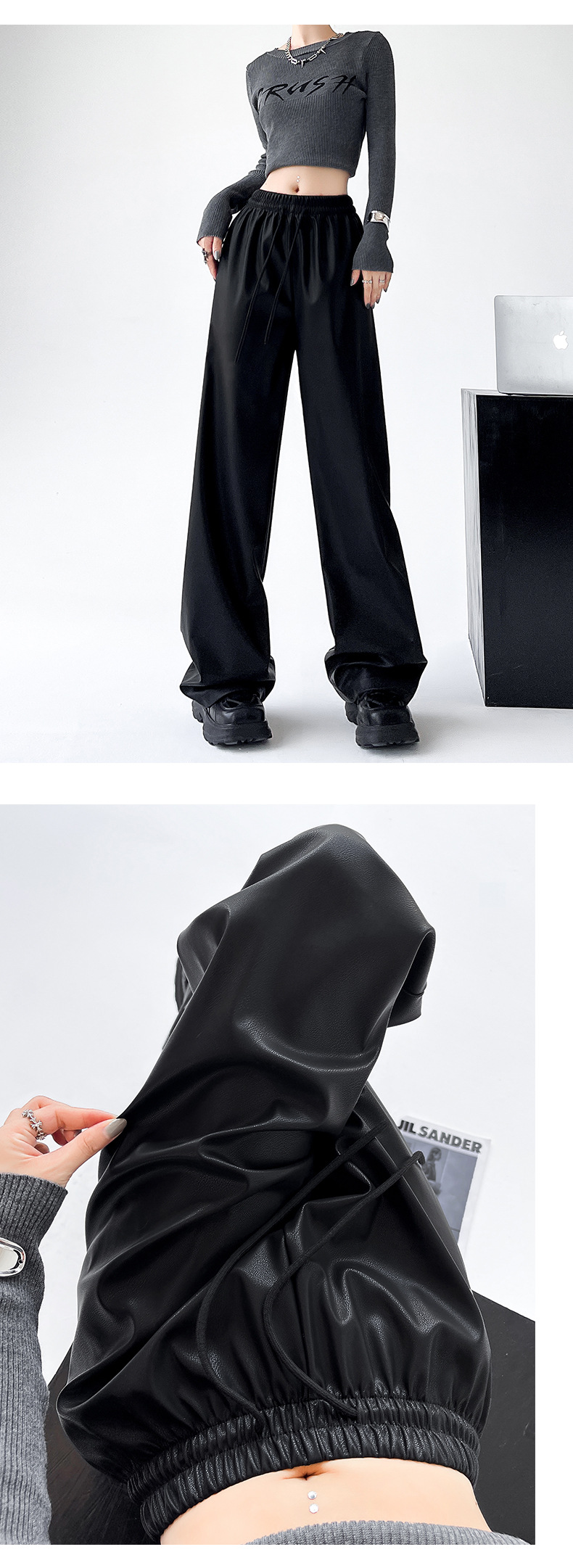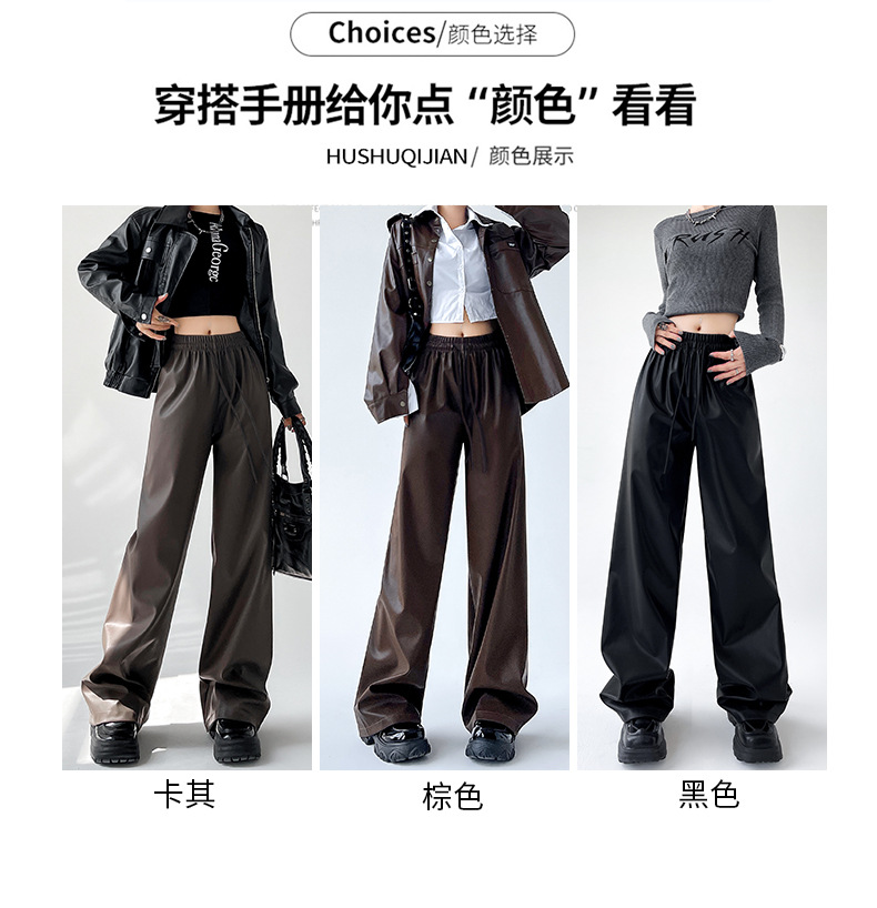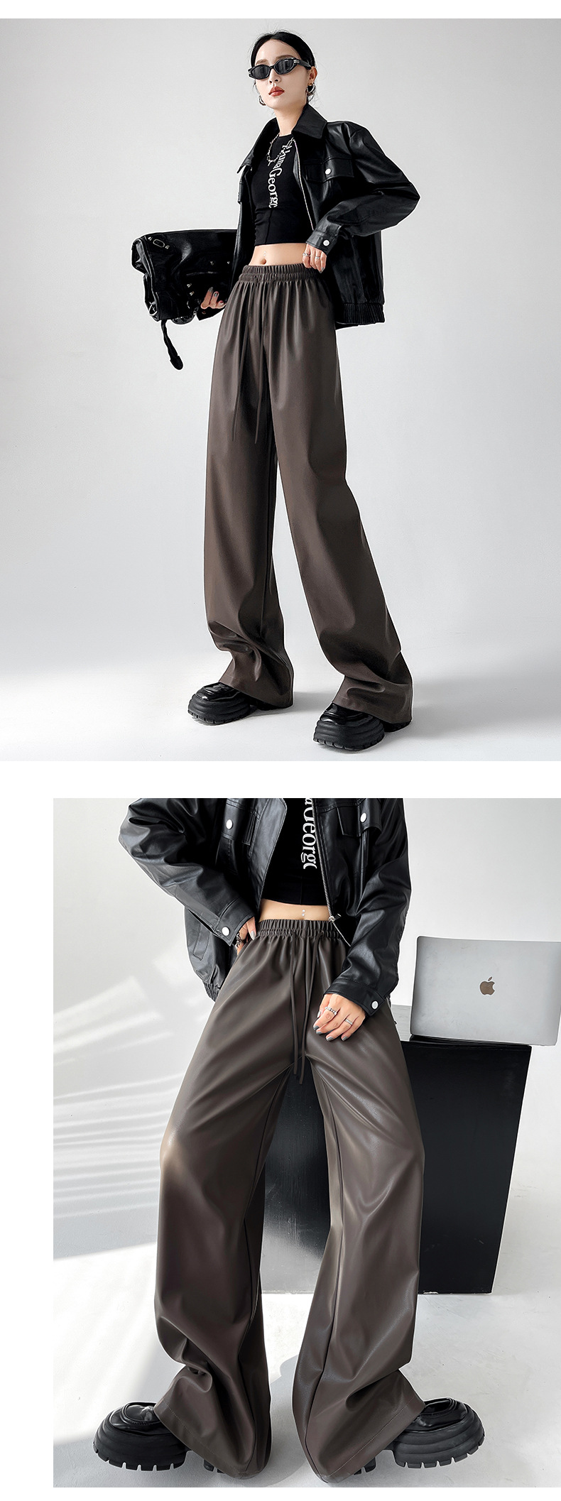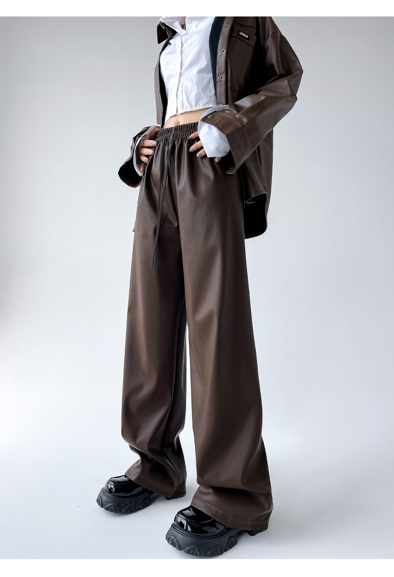 Pantalones de cuero estadounidenses, pantalones colgantes, pantalones de primavera, mujeres 2024, nuevos pantalones casuales rectos y delgados, pantalones suaves, de piel de pu, cintura alta y piernas anchas.