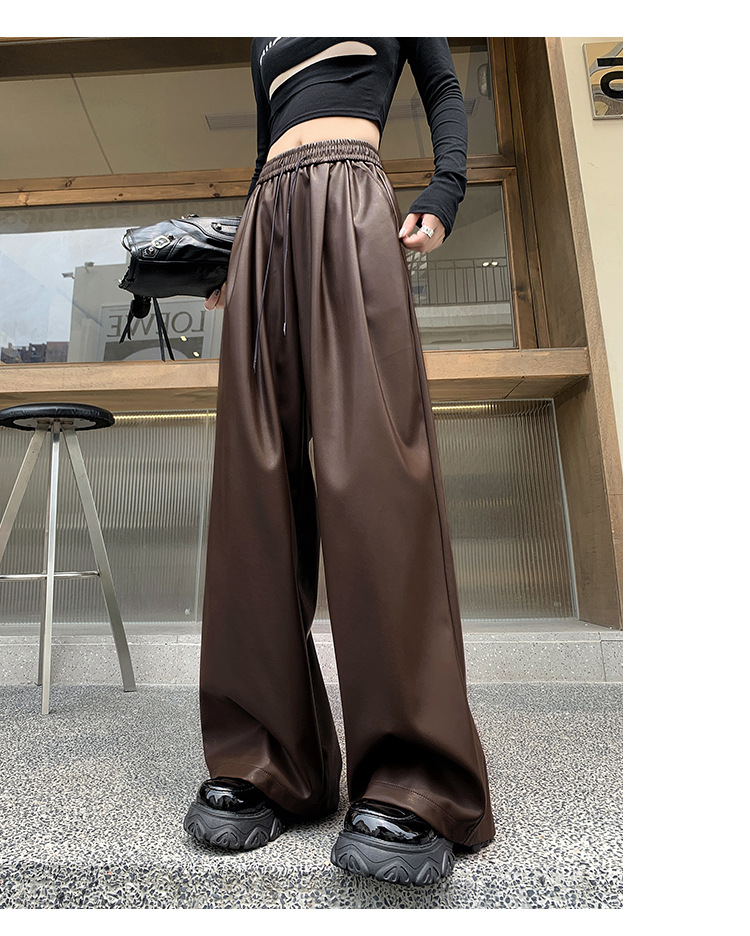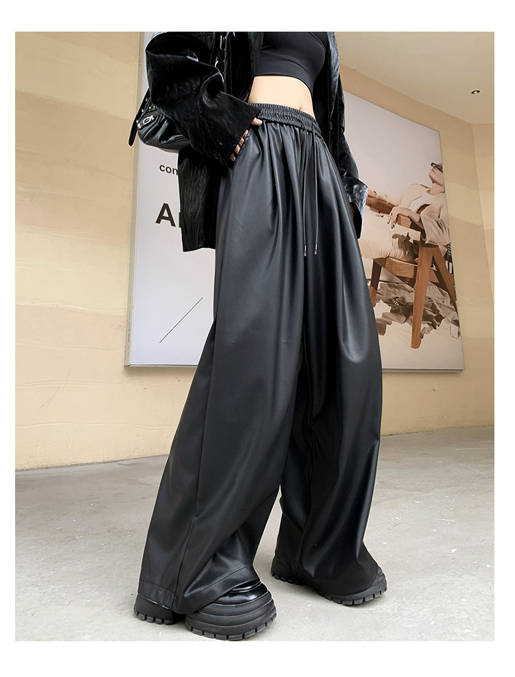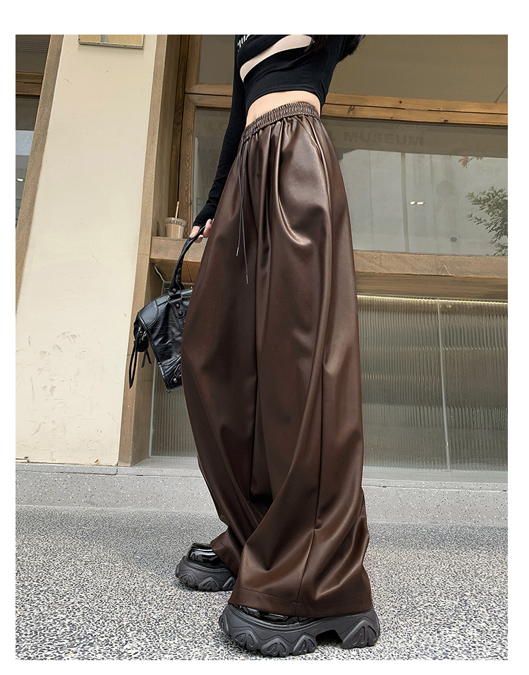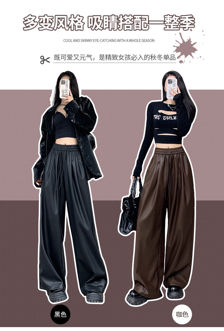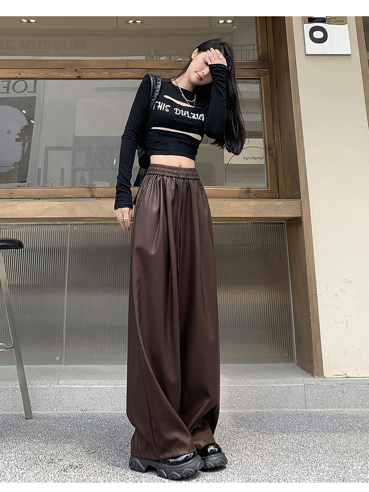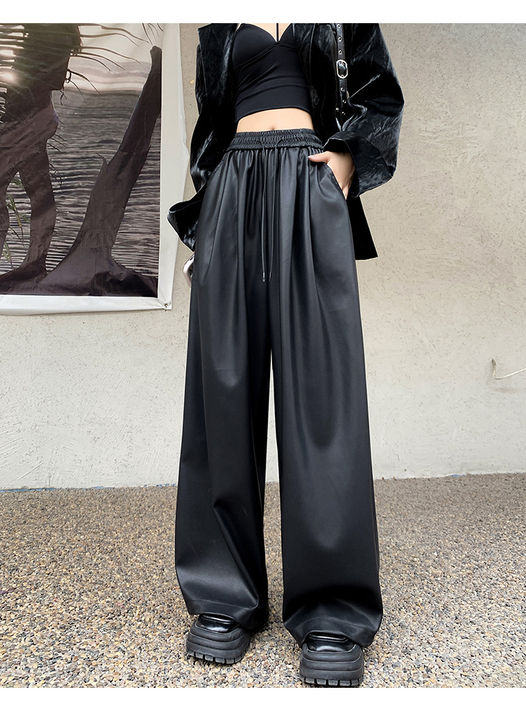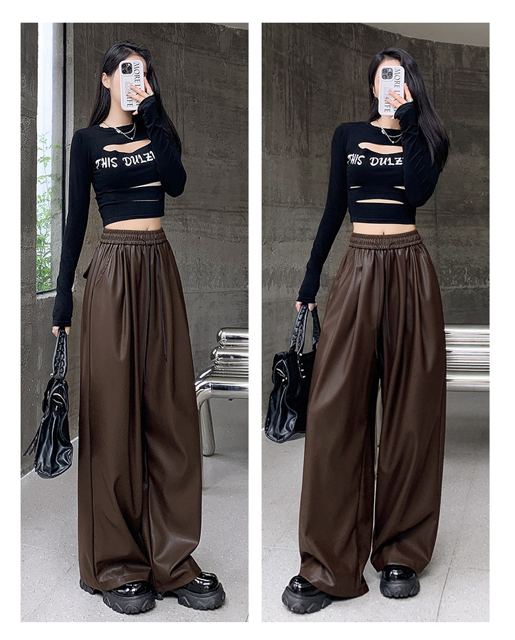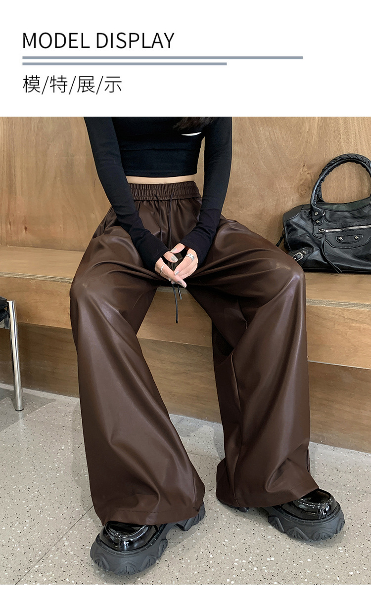 2023 pantalones de cuero estadounidenses retro mujeres otoño e invierno pantalones casuales relajados y delgados tirantes de cuerda mate Pu piernas anchas trapeadores de moda