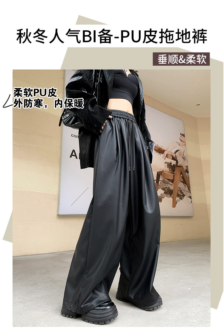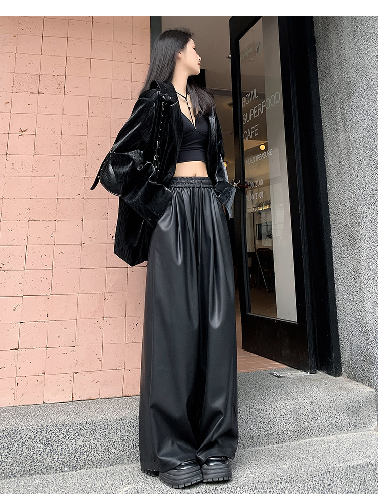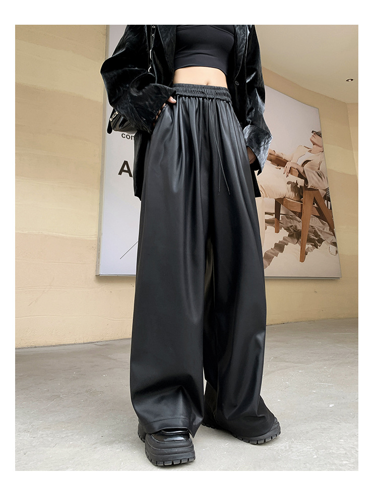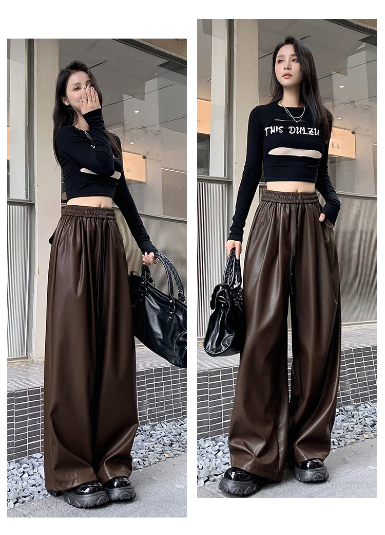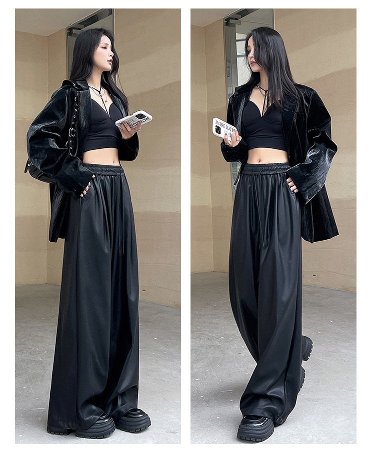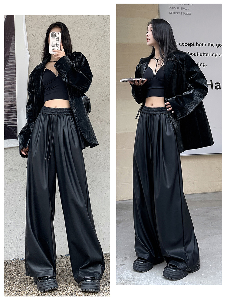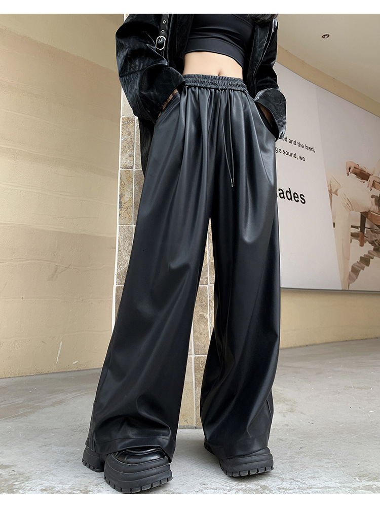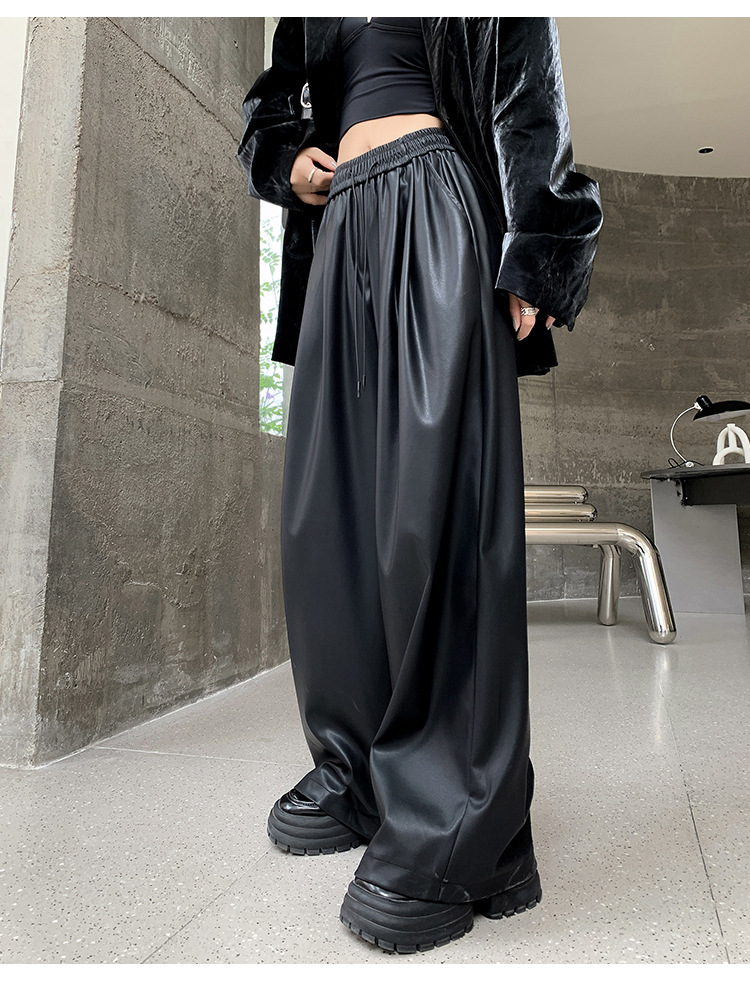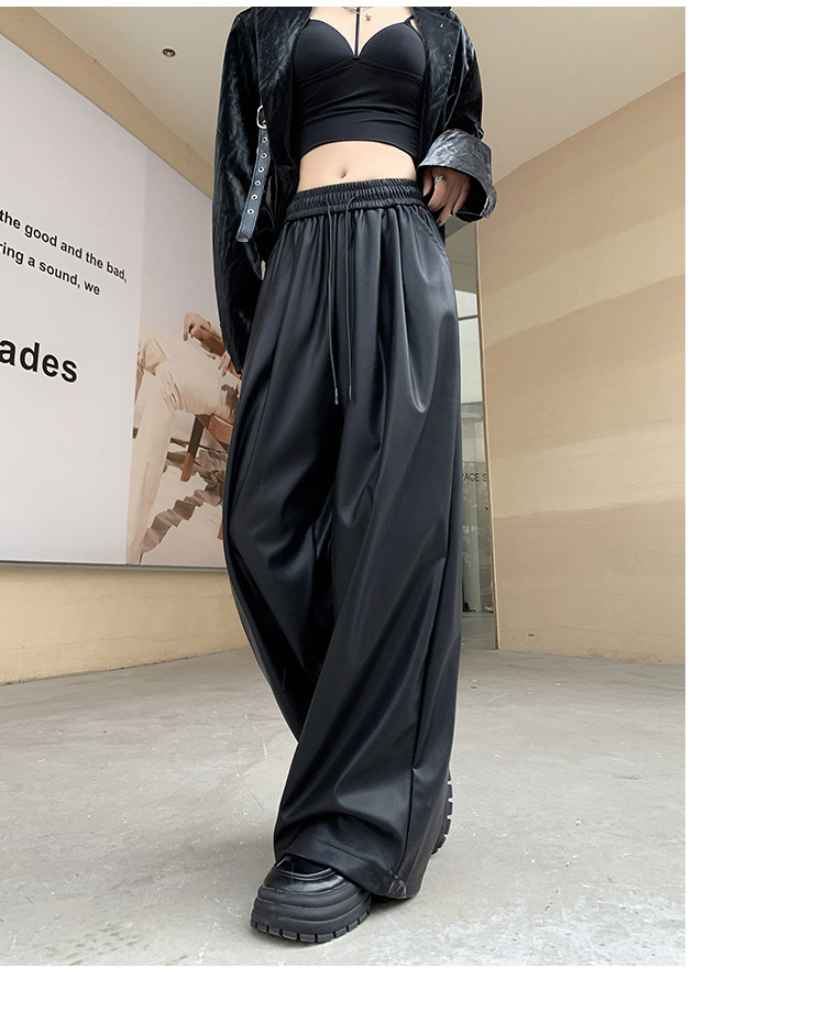 2023 pantalones de cuero estadounidenses retro mujeres otoño e invierno pantalones casuales relajados y delgados tirantes de cuerda mate Pu piernas anchas trapeadores de moda