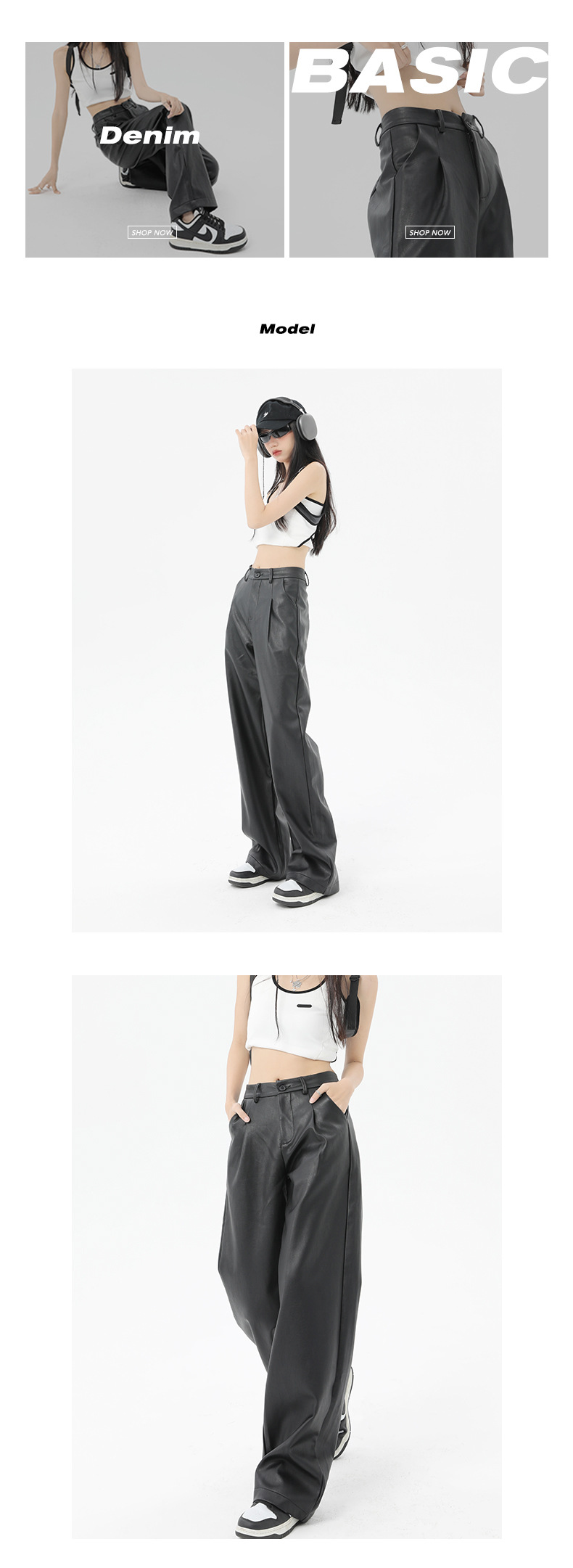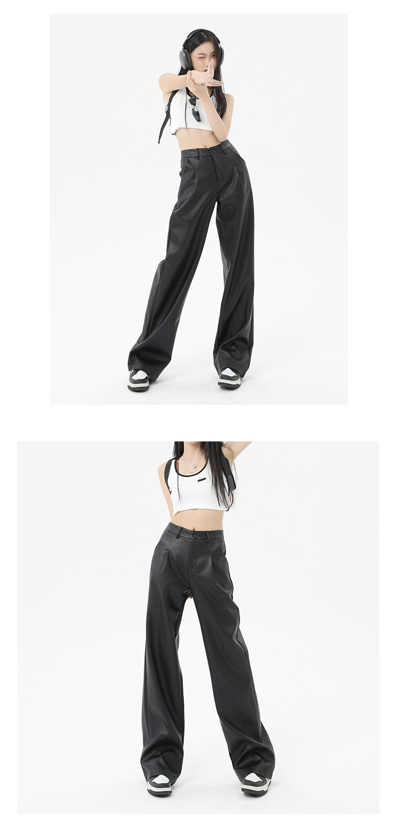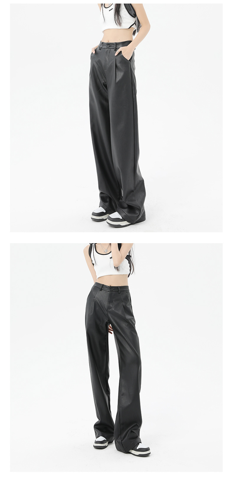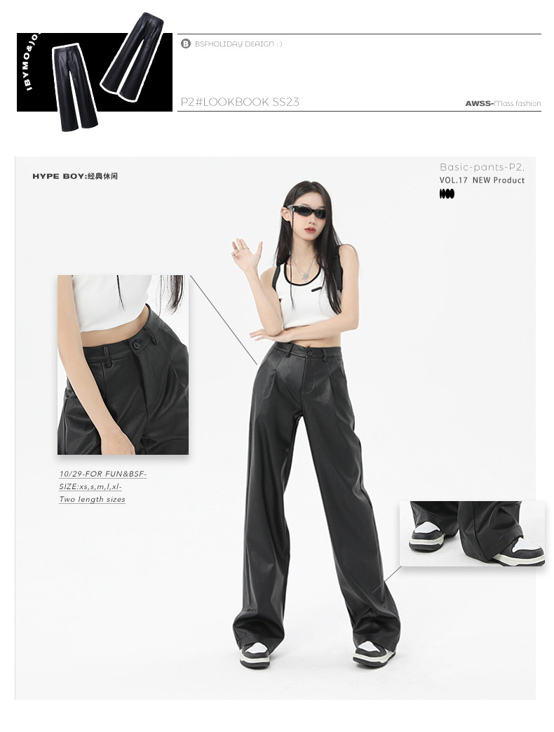Nuevos pantalones casuales personalizados de piel de Pu negra femenina en primavera y verano 2024 pantalones de cuero de cintura alta, delgados, relajados, piernas anchas y tubos rectos estadounidenses
