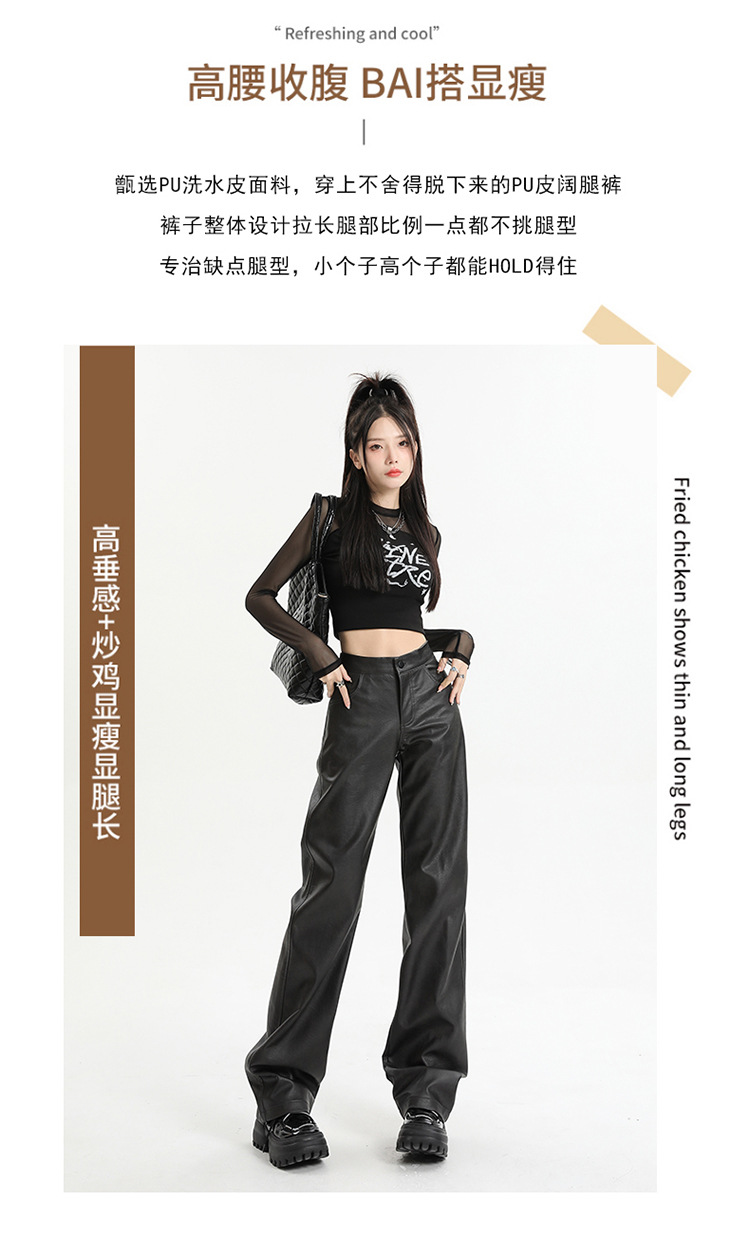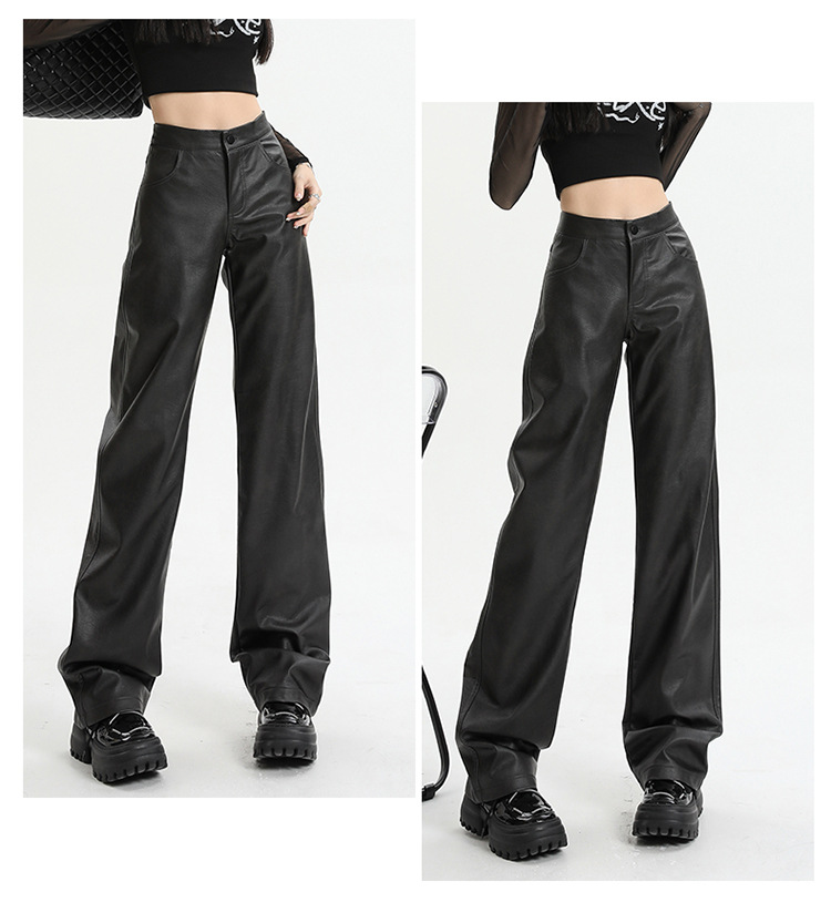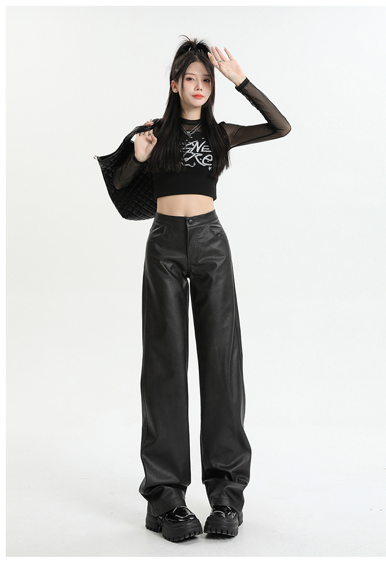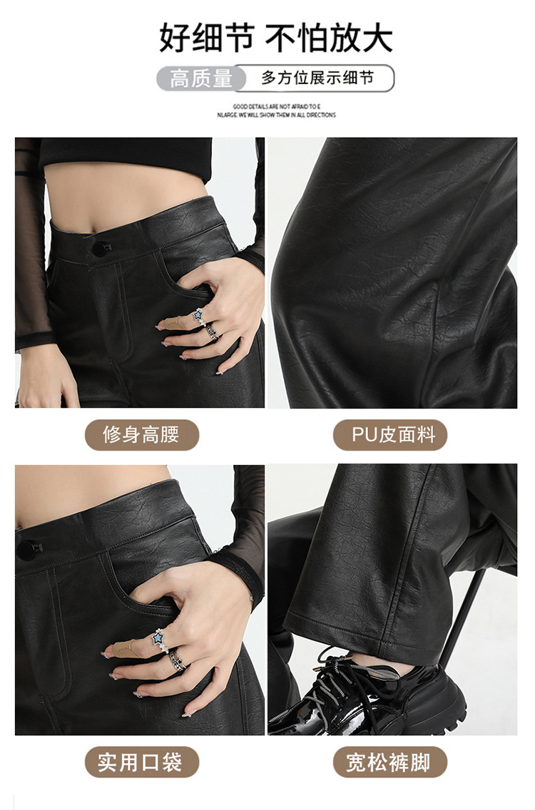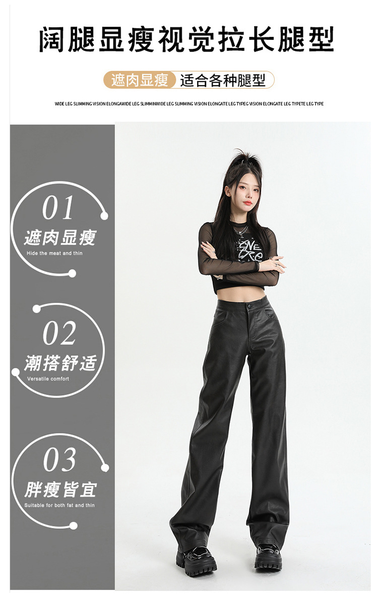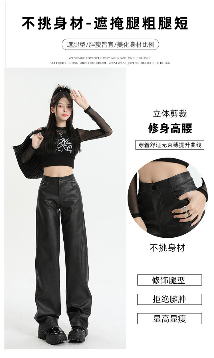 Pantalones rectos engrosados negros nuevos pantalones de cuero en otoño e invierno de 2023, cintura alta y cintura delgada, pantalones largos colgantes y pantalones de trapeador