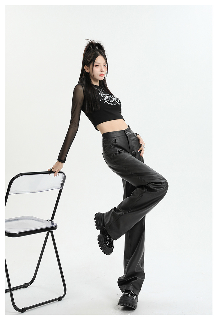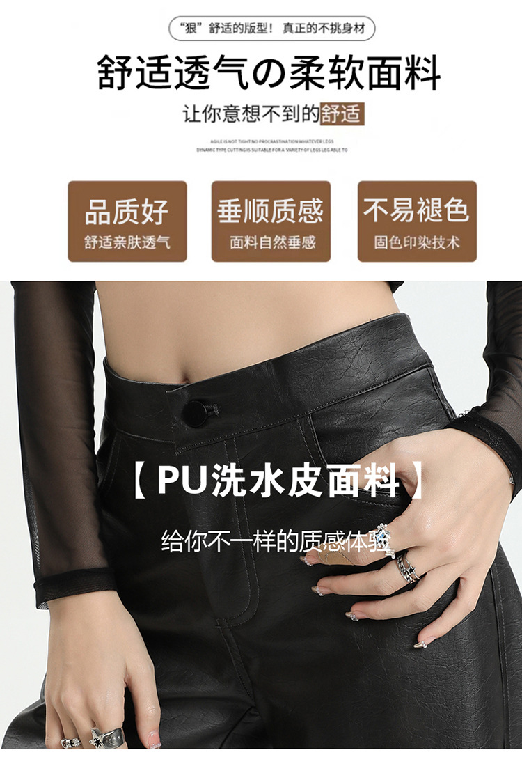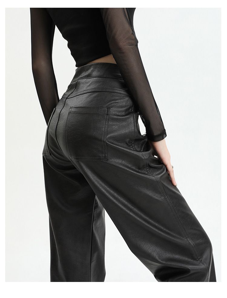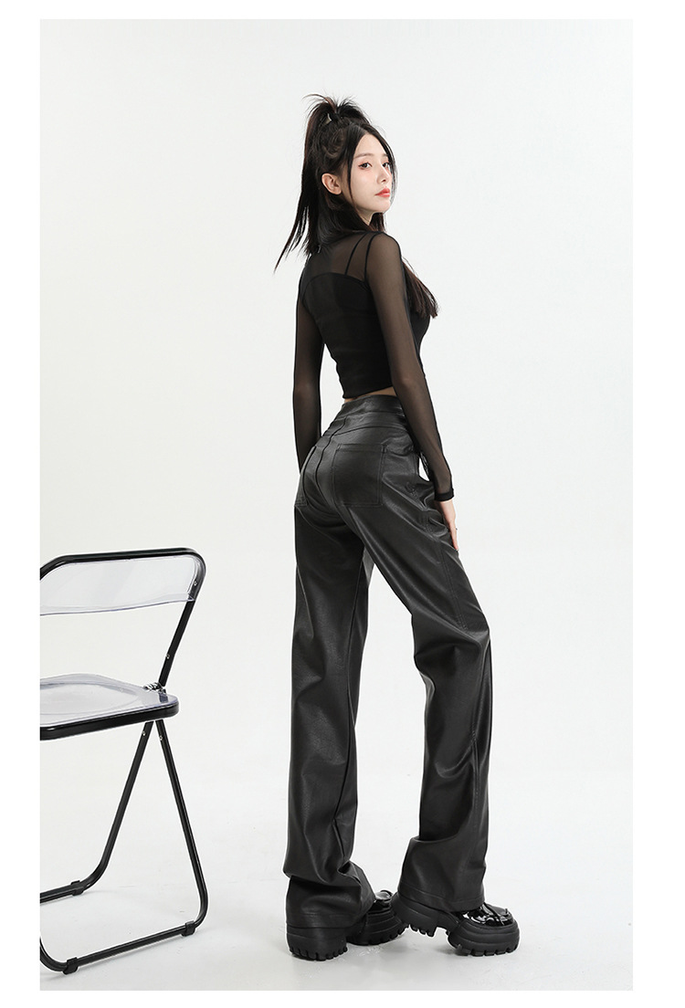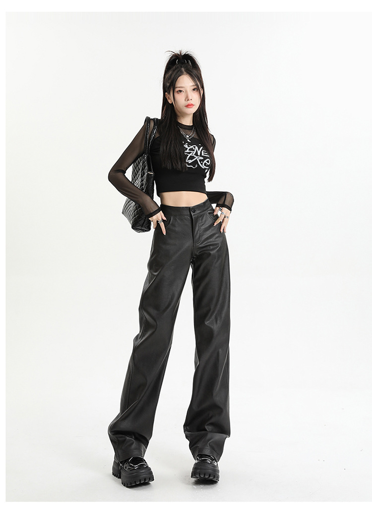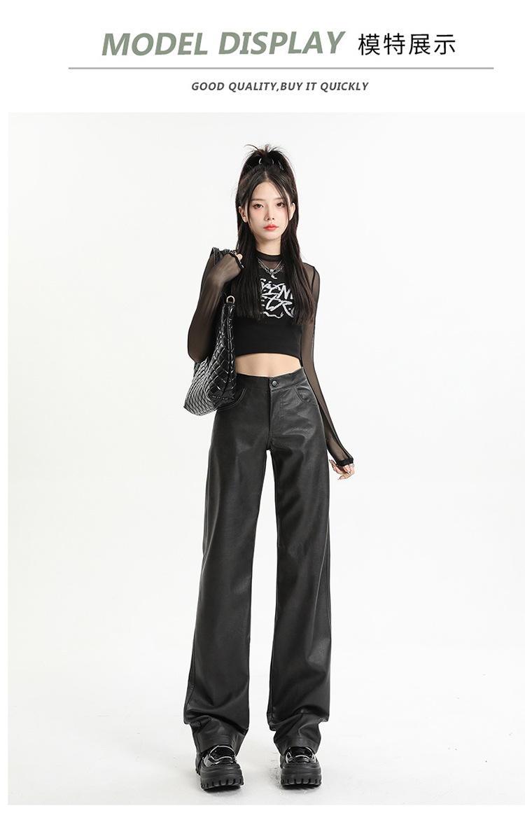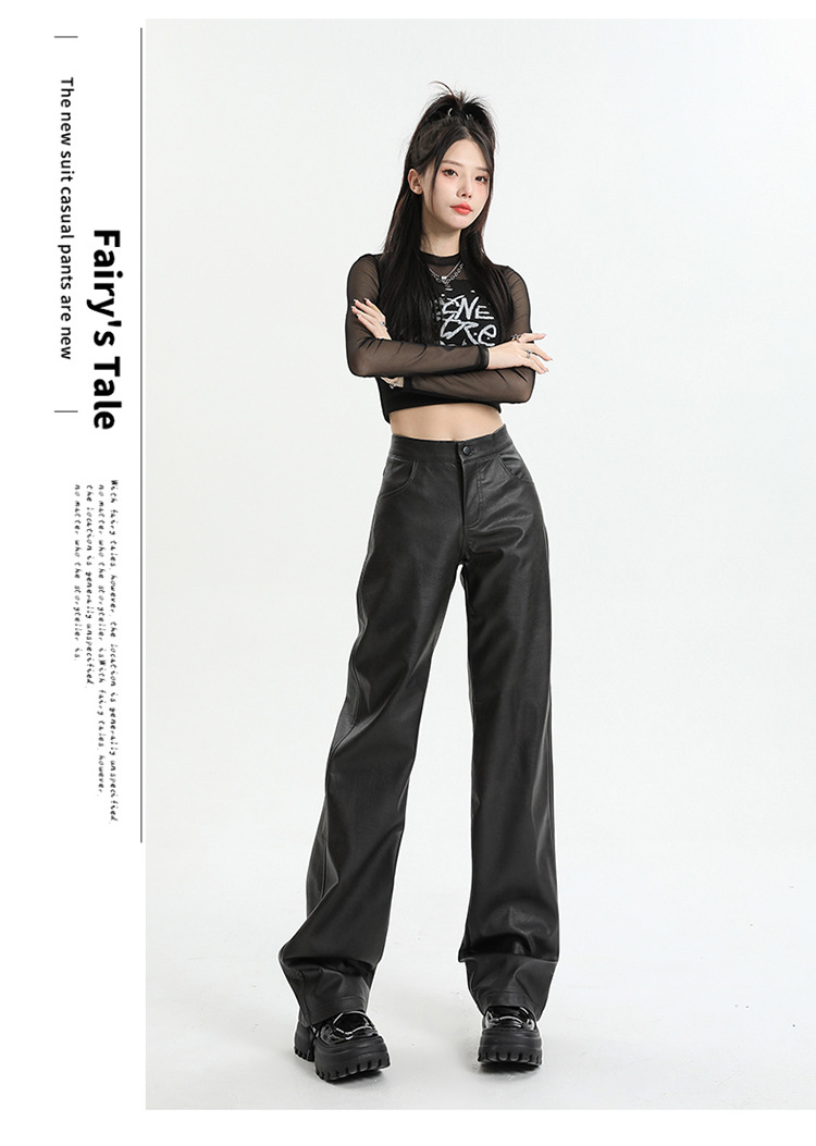 Pantalones rectos engrosados negros nuevos pantalones de cuero en otoño e invierno de 2023, cintura alta y cintura delgada, pantalones largos colgantes y pantalones de trapeador