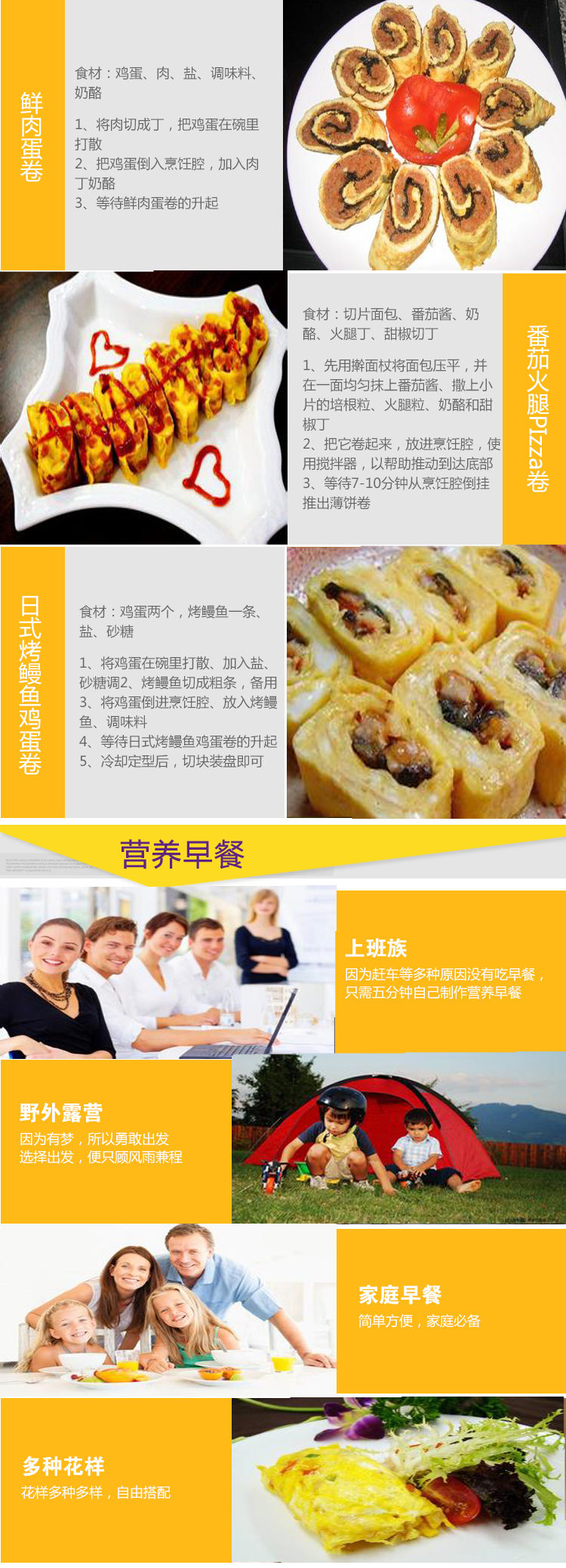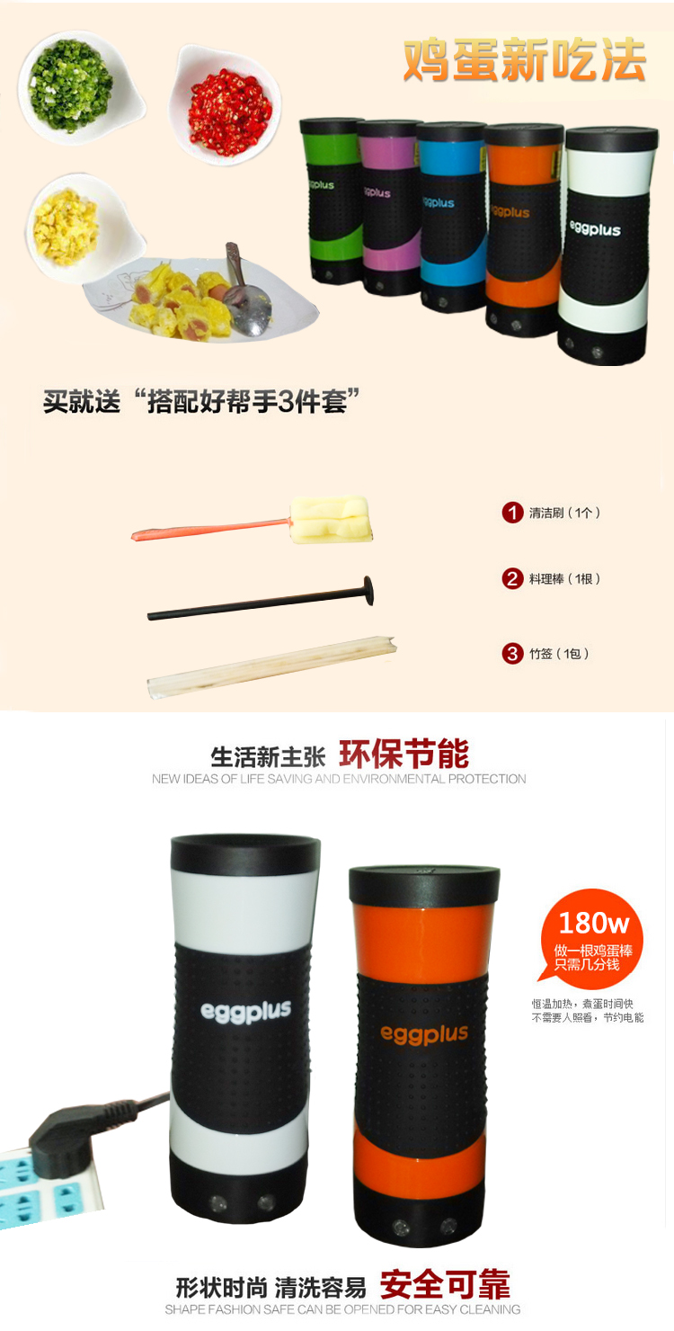 很多客人担心不会用,这个的使用方法很简单的,保证你拿到手自己就会用了的,但是还是大概看一下 使用方法说明书及保养 请放在平面上使用, 插上电源后, 红灯亮起 · 预热后会亮起绿灯《使用过程会冒烟属于正常现象》 · 放入食用油,一定要少放。。用黑色杆上下涂抹均匀内胆 · 打入1-2个鸡蛋《不要超过2个鸡蛋,混合材料时只放1个鸡蛋即可》 2个鸡蛋的话一定不要打散打入太多空气 膨胀太快 很容易不熟就弹出 PS 2个鸡蛋的话上面接触空气部分有一点点不熟 正是正常的 温度不够。。亲可以压下去在加热一次看看 · 等到完全熟透6-8分往上弹出 鸡蛋杯的清洗方法 · 使用后拨出插头,等机器完全散热后,机器外观只需要抹布擦拭即可 · 内胆用刷子沾点洗洁精洗刷即可,装水冲刷 · 外观底部,不要清泡在水里 · 请不要用钢丝刷哦! (一)基本做法 材料 : 鸡蛋两个 1. 初次产品接入电源,约1分钟后指示灯变成绿色时迅速打开 两个鸡蛋放入。 (放入鸡蛋请不要把蛋黄绞碎)