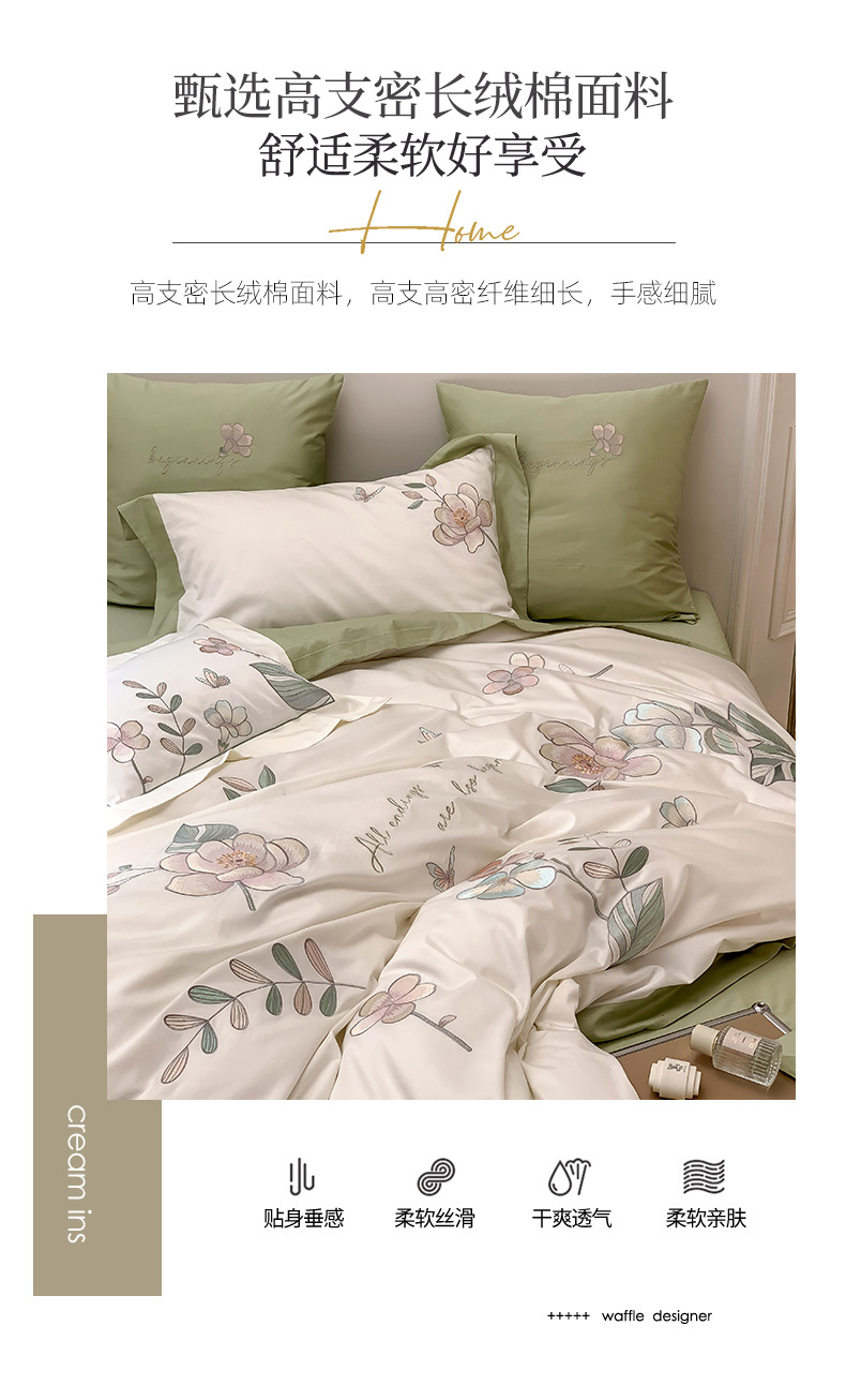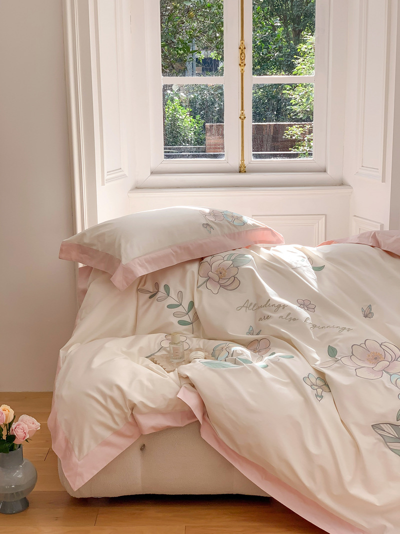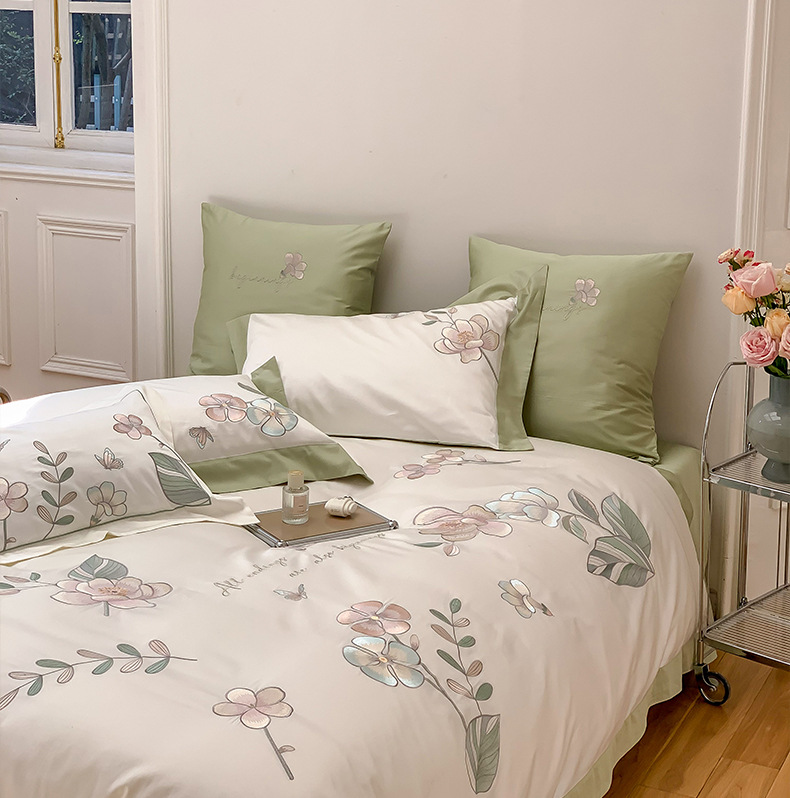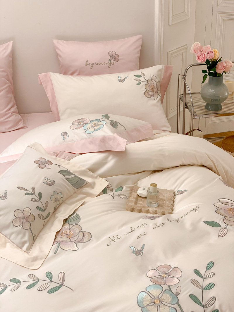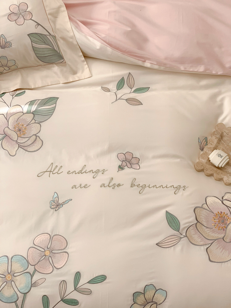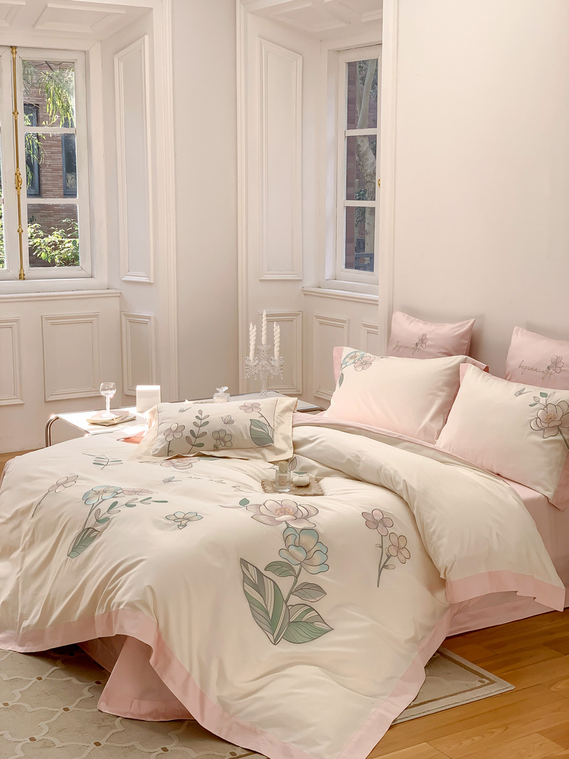Estilo Pastoral de alta gama 100 algodón de lana larga juego de cuatro piezas algodón puro bordado flores edredones sábanas y ropa de cama