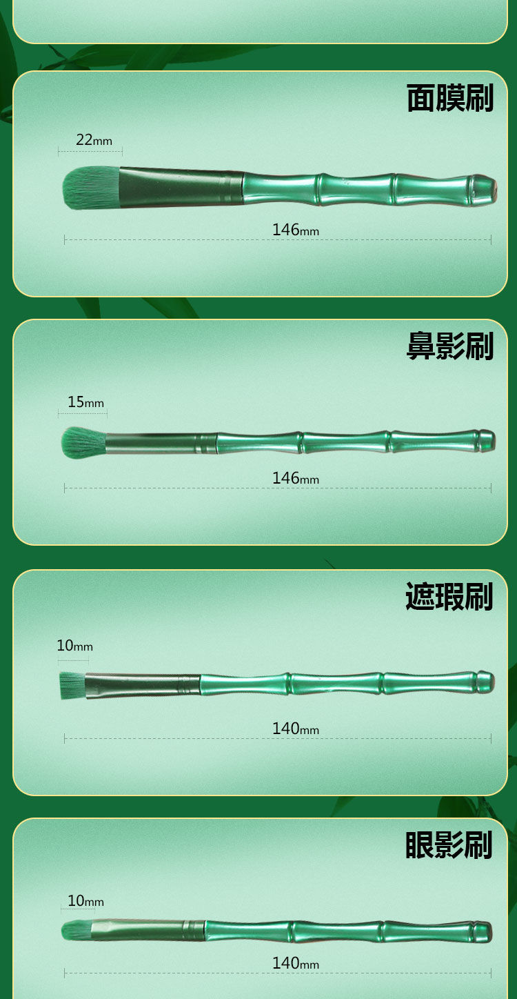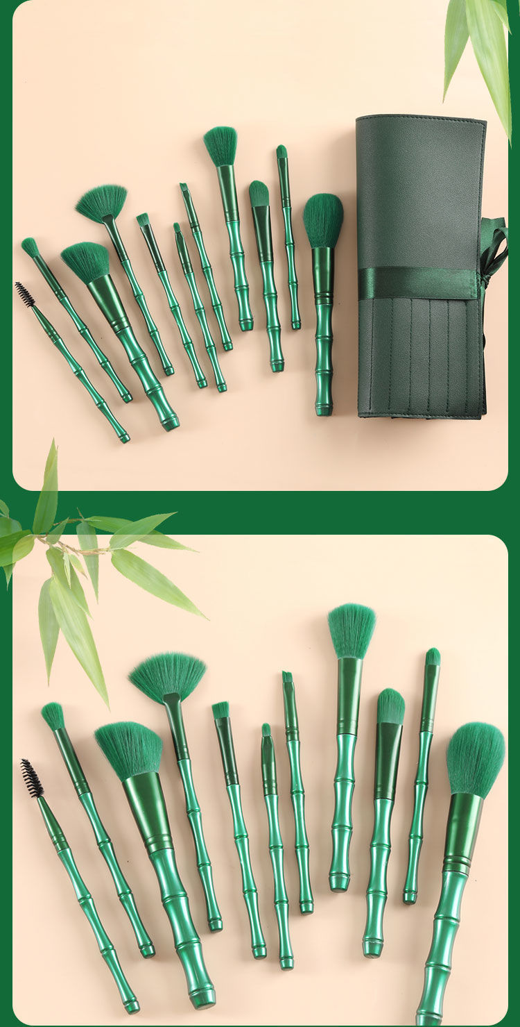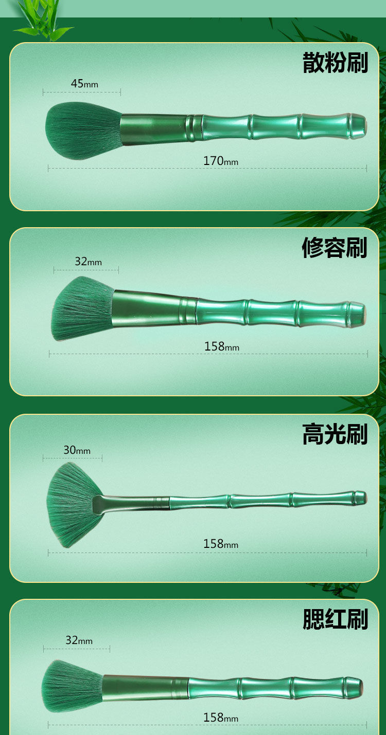 Cepillo de maquillaje, poste de bambú, cepillo de maquillaje, 11 cepillos verdes con mejillas, sombras de ojos, cepillo de cabeza redonda, maquillaje suave