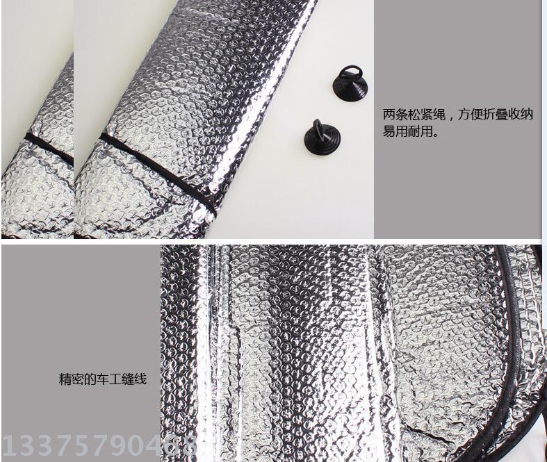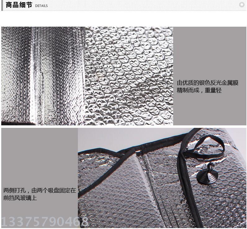 <【宝贝名称】:高质铝箔遮阳挡/太阳挡/前挡 【宝贝尺寸】:70*140cm 【产品克重】:约120克 【宝贝材质】:泡铝箔 【宝贝装箱】:100套/件 随着夏季的来临,火辣的阳光强烈的照射着您的爱车!首当其冲的就是仪表台.相信大家都有这样的经历,车停在外面,等会儿回到车内,简直不敢进去,温度太高了,仪表台极为烫手,严重的缩短了内饰件的寿命,而且要开空调很久才能把车内温度降下来,即要多耗油也不环保,还耽误您宝贵的时间.影响快乐的心情! 前挡为泡泡铝特殊反光材料所制成,具有100%抵挡紫外线的效果,中间制作为泡泡型,具有极好的隔热效果!这款超级可爱迪士尼乐园米奇前挡可以完全百分百的挡住紫外线及热量,让您的爱车免受阳光的煎熬. 【方法】 用所附的吸盘固定于玻璃上,如果吸盘因包装而变形,可以放在开水中烫一下,即可恢复原状。 【商品说明】 1、夏日的光照使停泊的车内室温急剧升高,如同火热的蒸笼,几乎令人不堪忍受! 2、网纱侧档双装,随时置于玻璃两侧,有效反射及隔绝热能的传导,大大降低车内温度。 3、产品附有吸盘牢牢吸附与玻璃内侧,让这个夏天不再热。 【使用说明】 1、产品外圈内包弹性钢丝,可保证产品的自由折叠及展开,拆开包装打开产品时请缓慢展开,不要任其自然弹开,以免弹飞吸盘。 2、夏季高温或长时间吸附,吸盘若出现脱落现象,请稍微在吸盘一圈涂水,可加固吸附牢度img src="https://img.ladincloud.com/imgto.php?url=i004/2018/03/06/01/1eacda48a316fafe0a013c21466b9936.JPG" alt="" />
