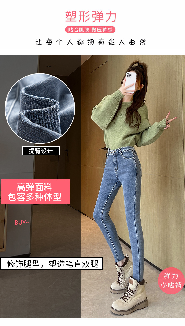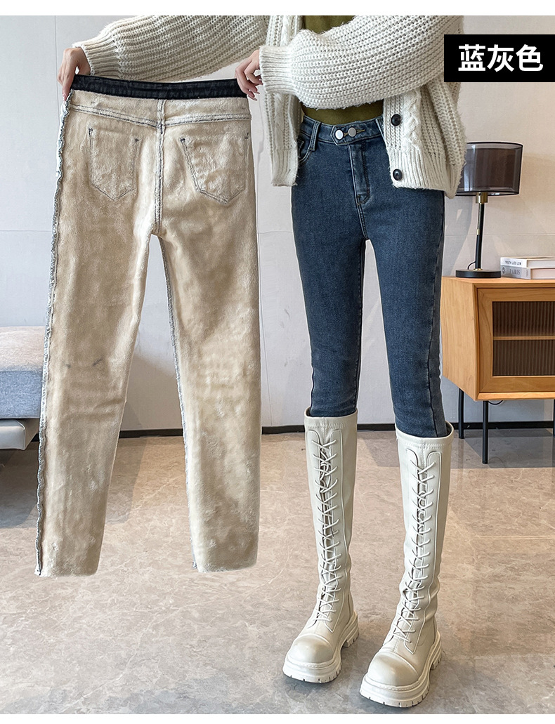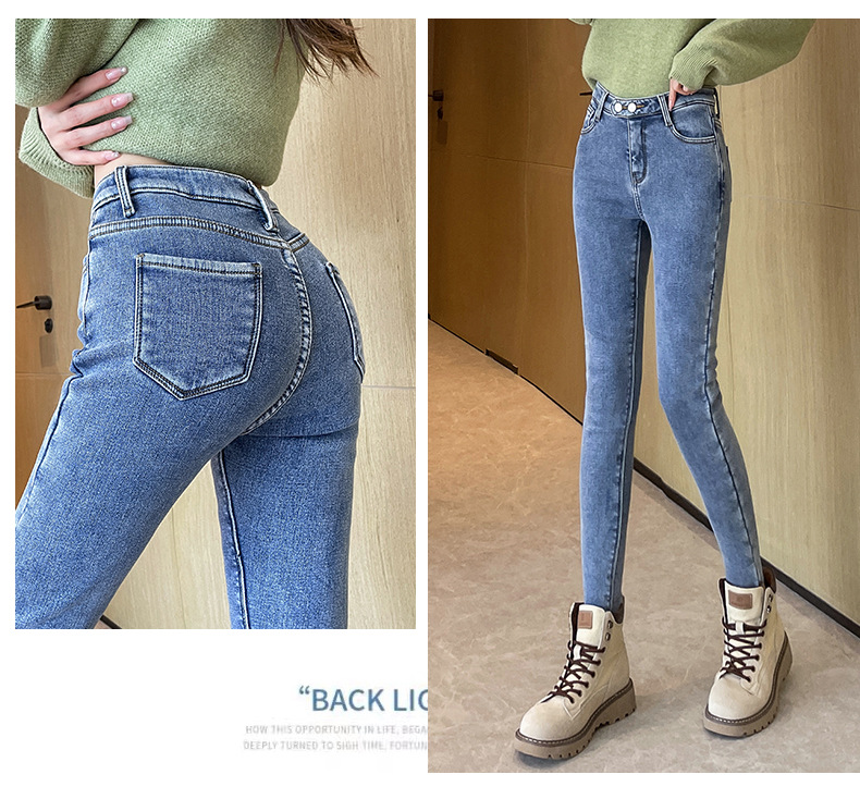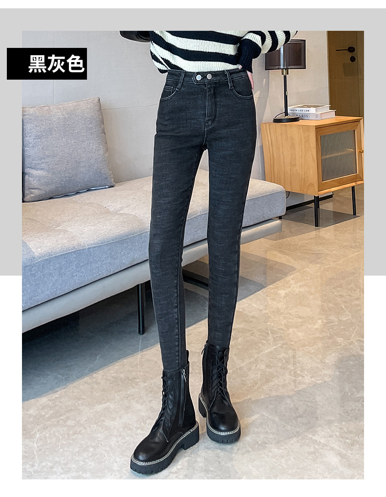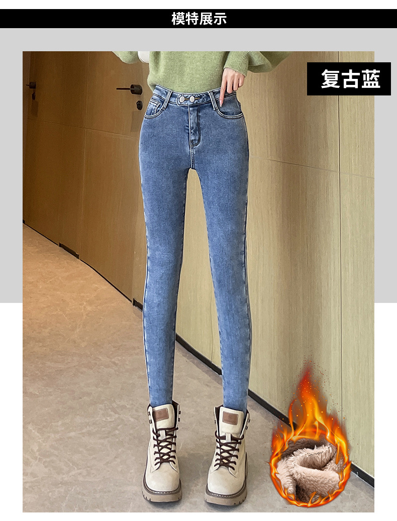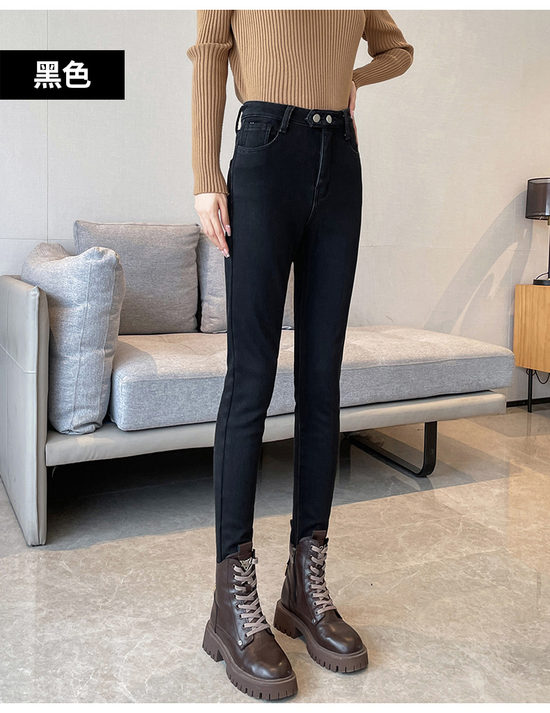 Jeans elásticos de cintura alta para mujeres en otoño e invierno de 2023 más terciopelo engrosado nuevo adelgazamiento, pantalones de lápiz y pantalones de pies pequeños