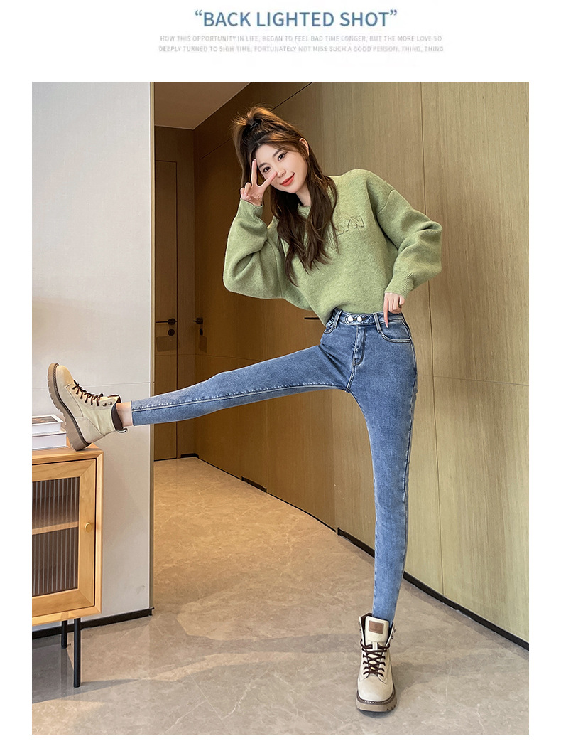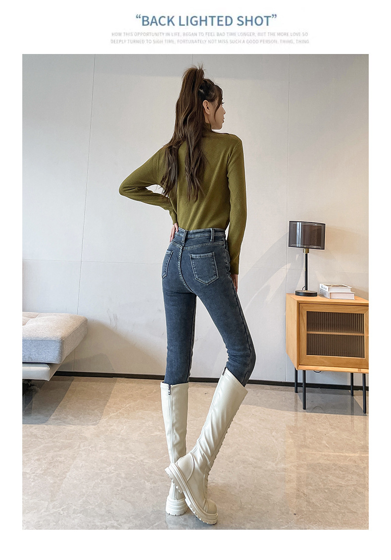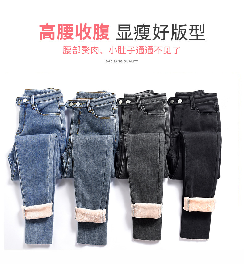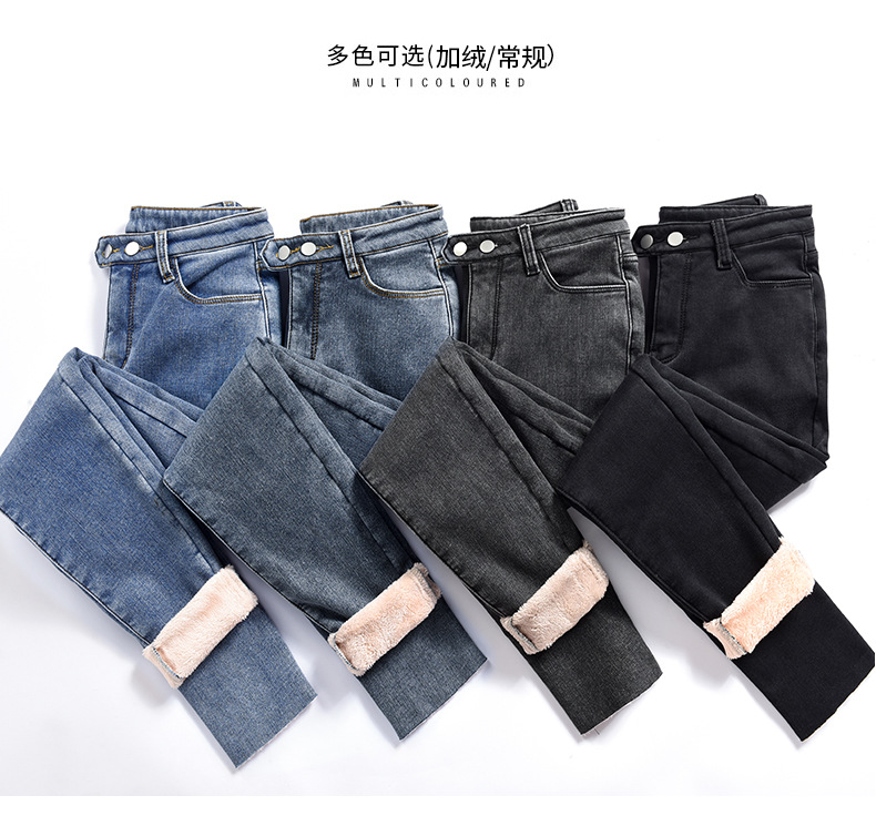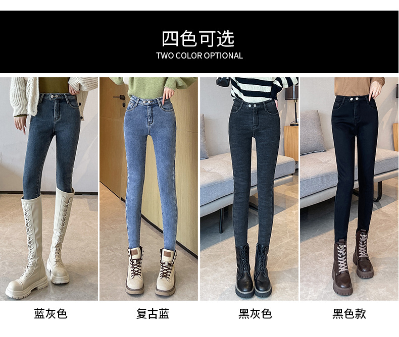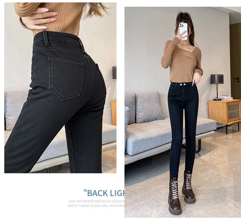 Jeans elásticos de cintura alta para mujeres en otoño e invierno de 2023 más terciopelo engrosado nuevo adelgazamiento, pantalones de lápiz y pantalones de pies pequeños