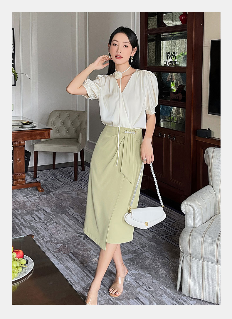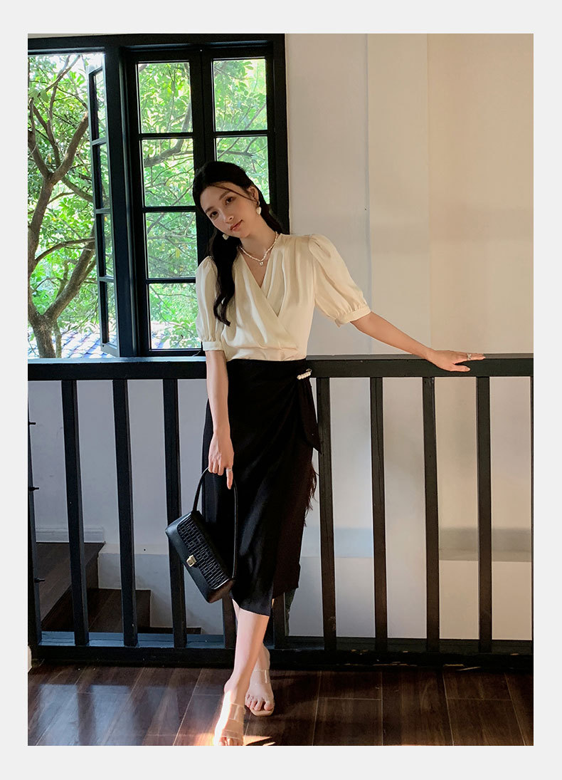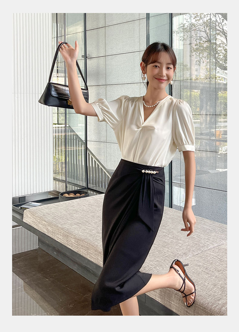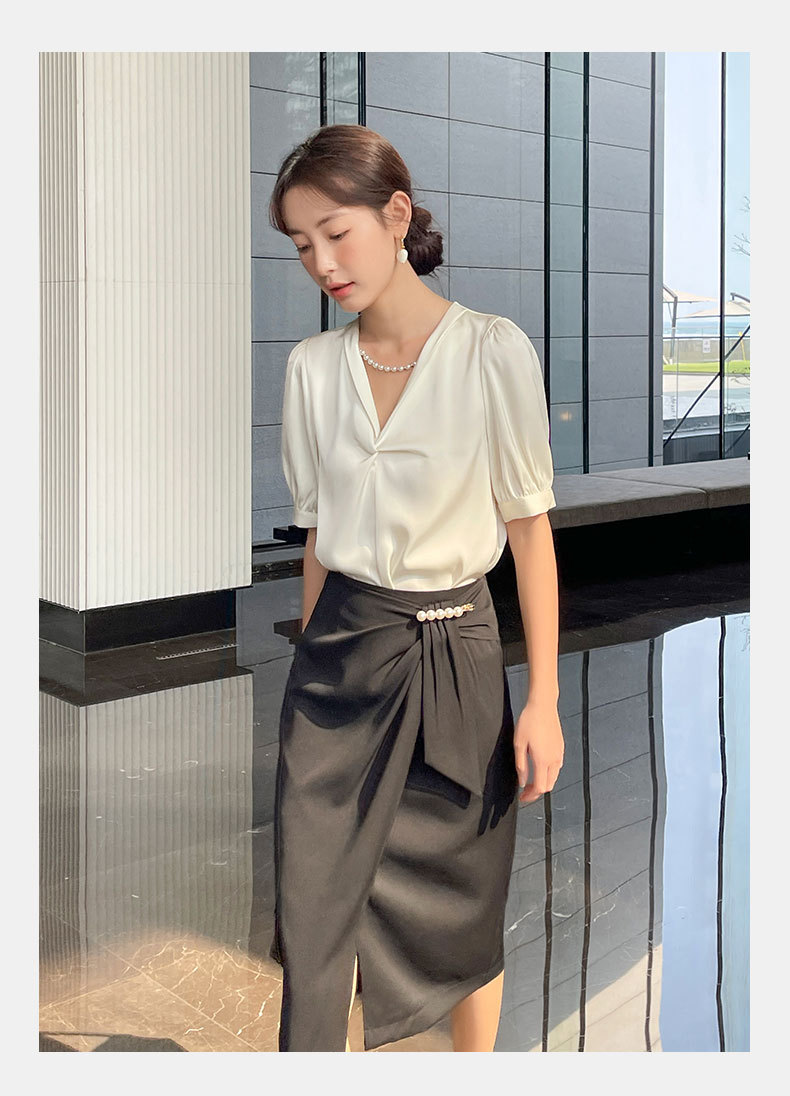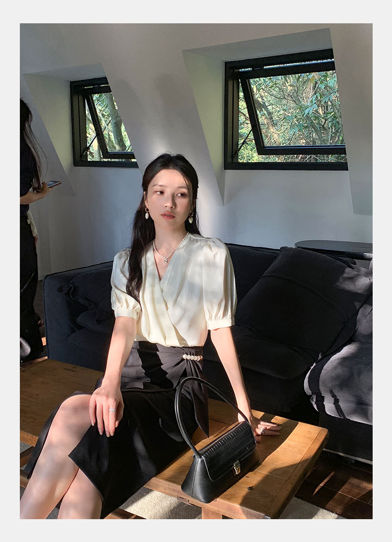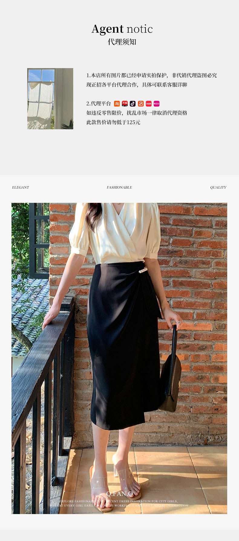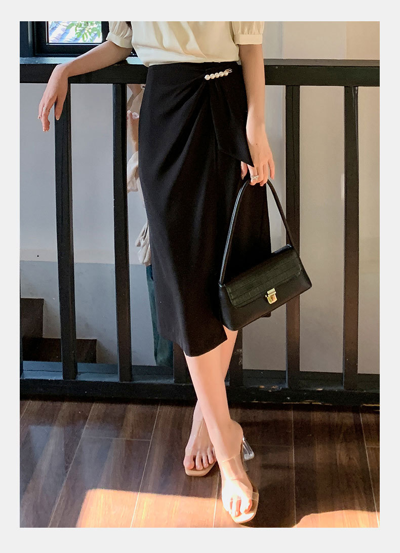QiFan Summer Black half skirt elegant Travel half skirt Pearl Pins cut off show slender half skirt 80978