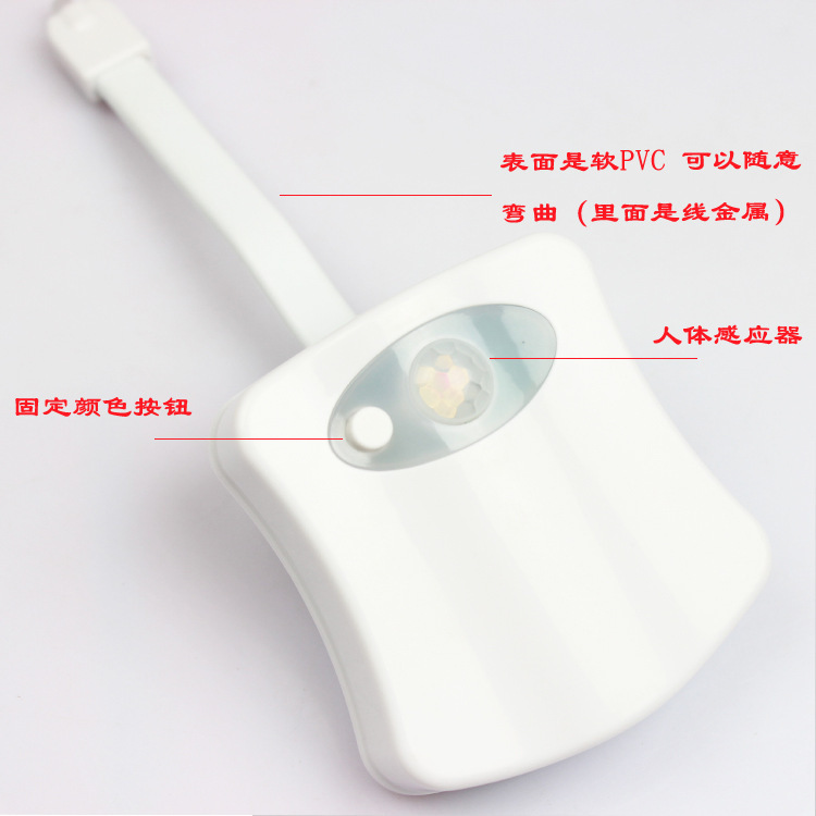 材料:ABS塑料 电压:4.5伏特 功率:0.1瓦特 电池:需要3节AAA电池。(产品不自带电池) 特殊功能:运动传感器 电源:电池供电 运动感应式\光敏感 适合于任何厕所! 没有更多的周围绊在黑暗中!没有更多的凌乱清理! 使得如厕训练FUN! 卫生设计:易清洁 设置为彩色旋转(8色120秒 每个色随机15秒 也可以固定一个颜色 )