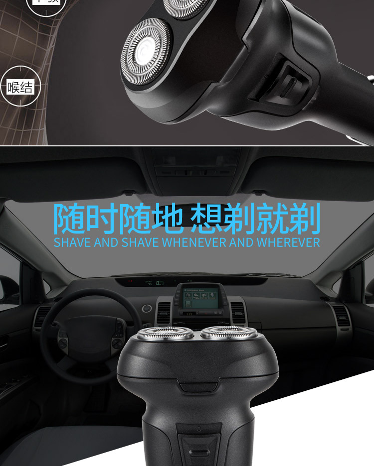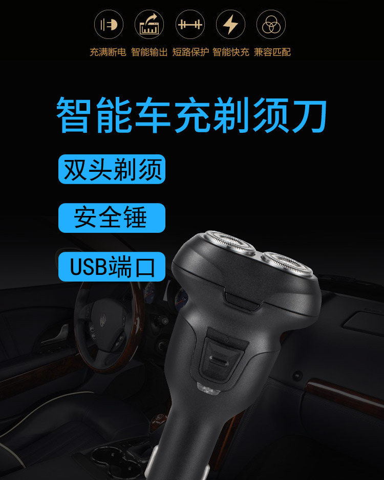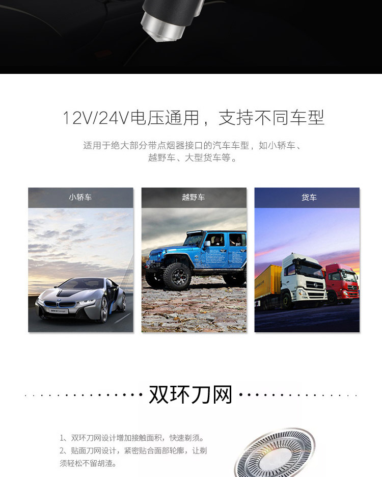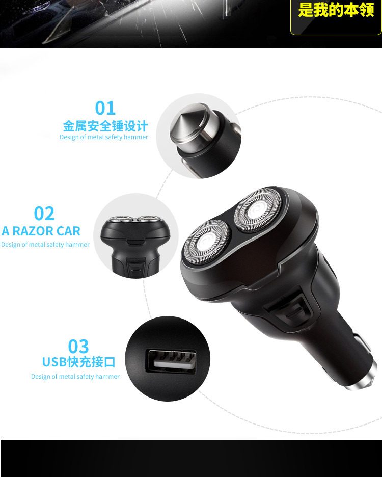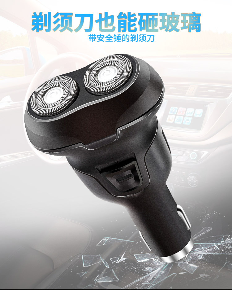 是否水洗:刀头水洗 充电线:无 自带车载充电 12V-24V通用 产品包装:全英文+英文说明书 产品重量:0.185KG 包装尺寸:14*8*4.3CM 装箱量:100 PCS
