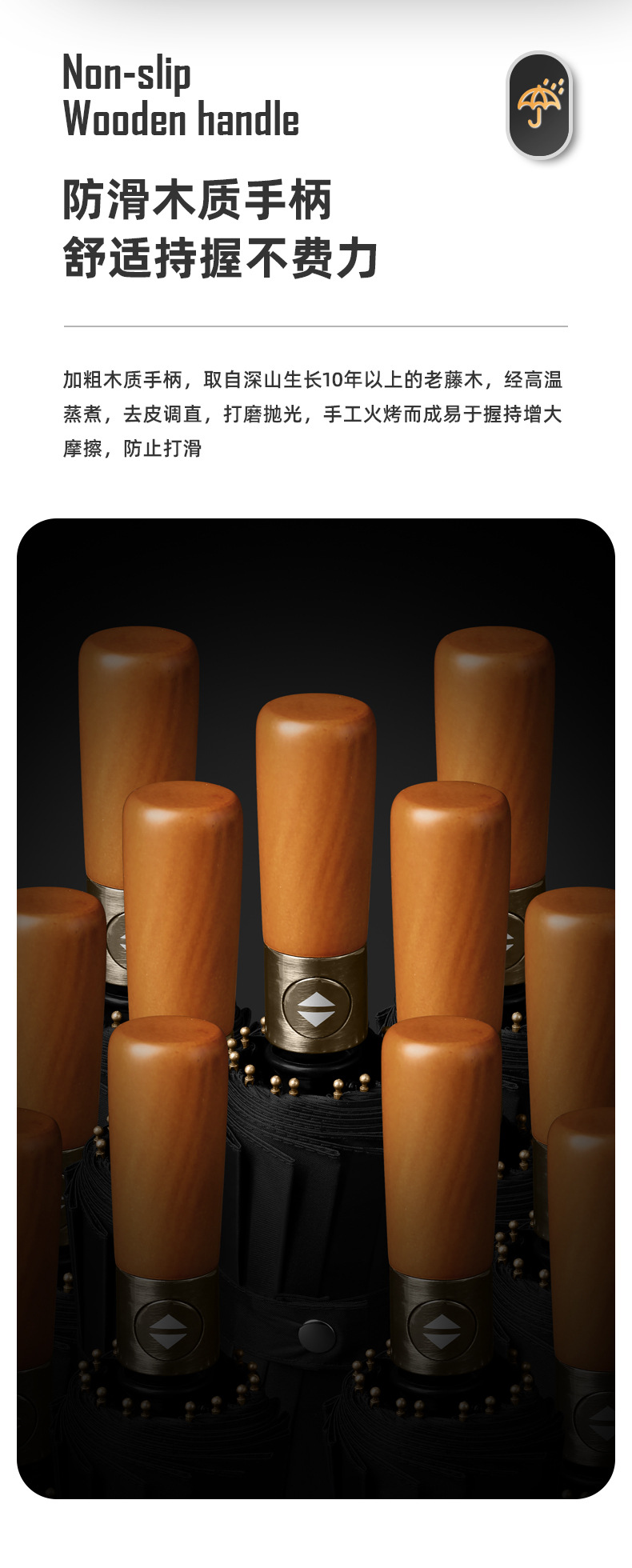 El fabricante vende al por mayor paraguas automáticos de 24 huesos con mango de madera, pegamento negro súper resistente al viento, protección solar y paraguas plegables de doble uso para hombres, soleados y lluviosos.