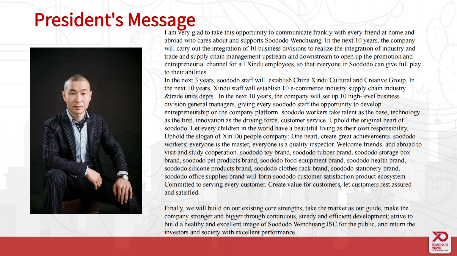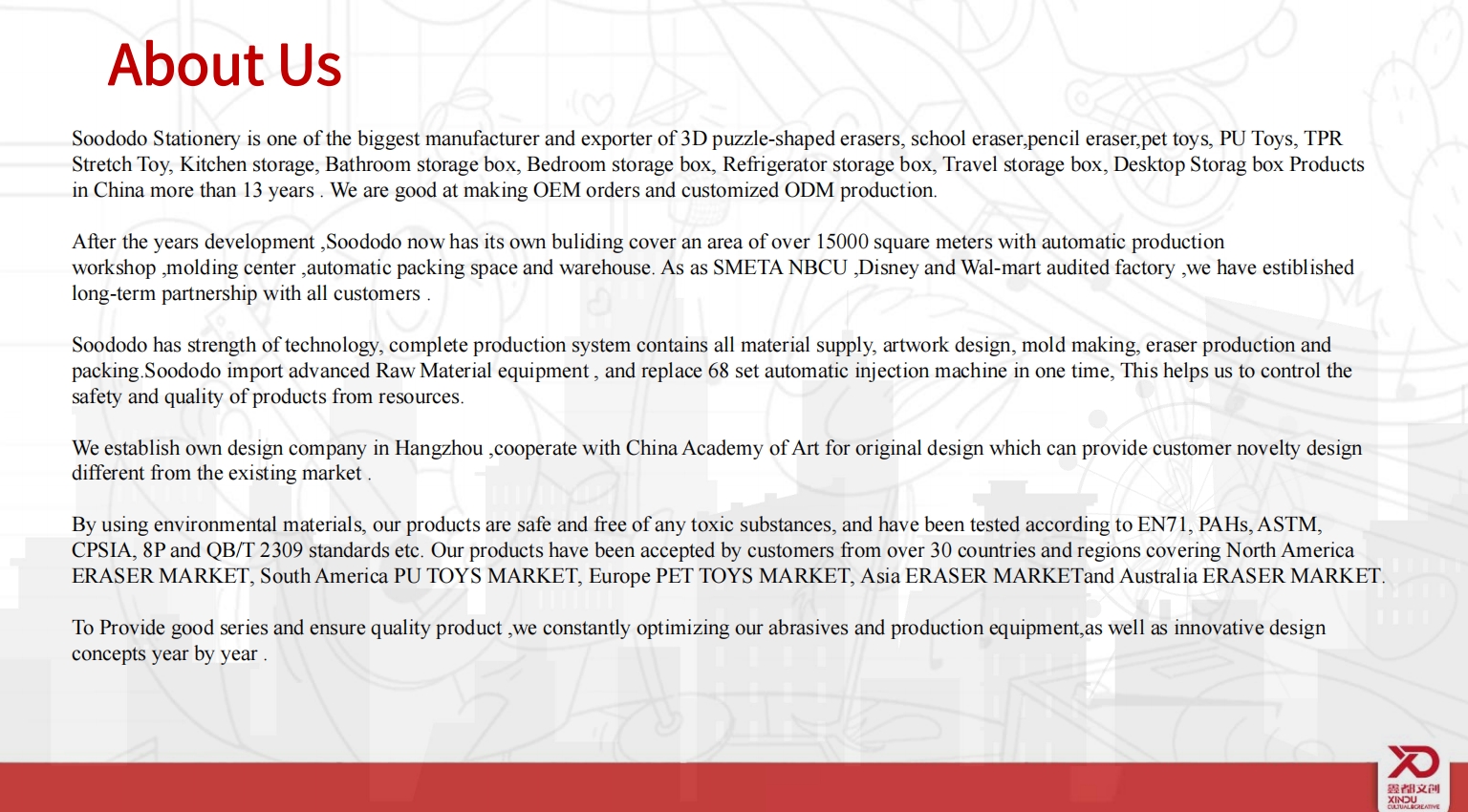 ZHEJIANG SOODODO STATIONERY CO., LTD ADD:No.#6 Block ,District A, No.588#,MingLi Str, Jin Yi Du Shi Industrial Zone , Jin Hua ,ZheJiang , China TEL:86-579-85977809 FAX: 86-579-85977810WEB:www.soododo.comWEB:soododo8.en,alibaba,comWEB:soododopet.yiwugo.com WEB:soododo-trophy.chinagoods.com E-mail:king@soododo.com Contact:王学群/Mr King Wang(VGM) QQ:0086-18136289088 SOODODO公司产品电子画册\联系人名片\联系人微信\产品报价单\公司网址\企业关于我们\视频宣传片\FAQ\公司产品类目\企业产品认证\企业文化展示\VR\全家福 等二维码。 Company product electronic picture book contact name card Contact wechat product quotation Company website Complete Enterprise about us Company introduction Video video FAQ Company production product category Summary table Enterprise product certification Complete Enterprise culture display VR two-dimensional code family photo 使用方法(use way): 1. 使用手机扫描二维码 2.使用手机截图功能保存为图片 3.图片保存到电脑文件夹即可。 温馨提示: 鑫都集团为您提供高效服务,所有客户的问题我们专业服务团队都会在5分钟之内帮助所有客户解决。为您节约大量时间轻松和我们公司合作订单。我们公司服务团队口号: 你只负责买单,其他所有的事情交给我们来做!建议您可以快速选择我们711个SKU产品型号和数量,选品请扫码如下: