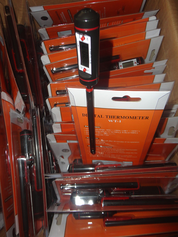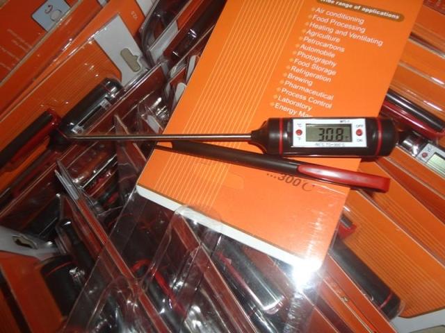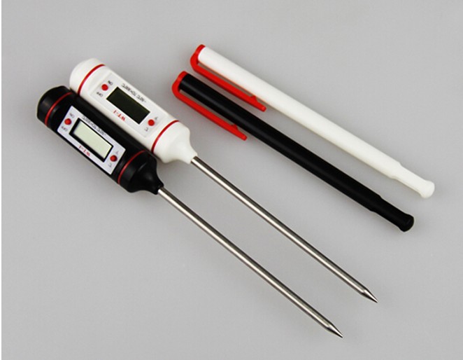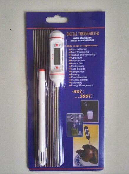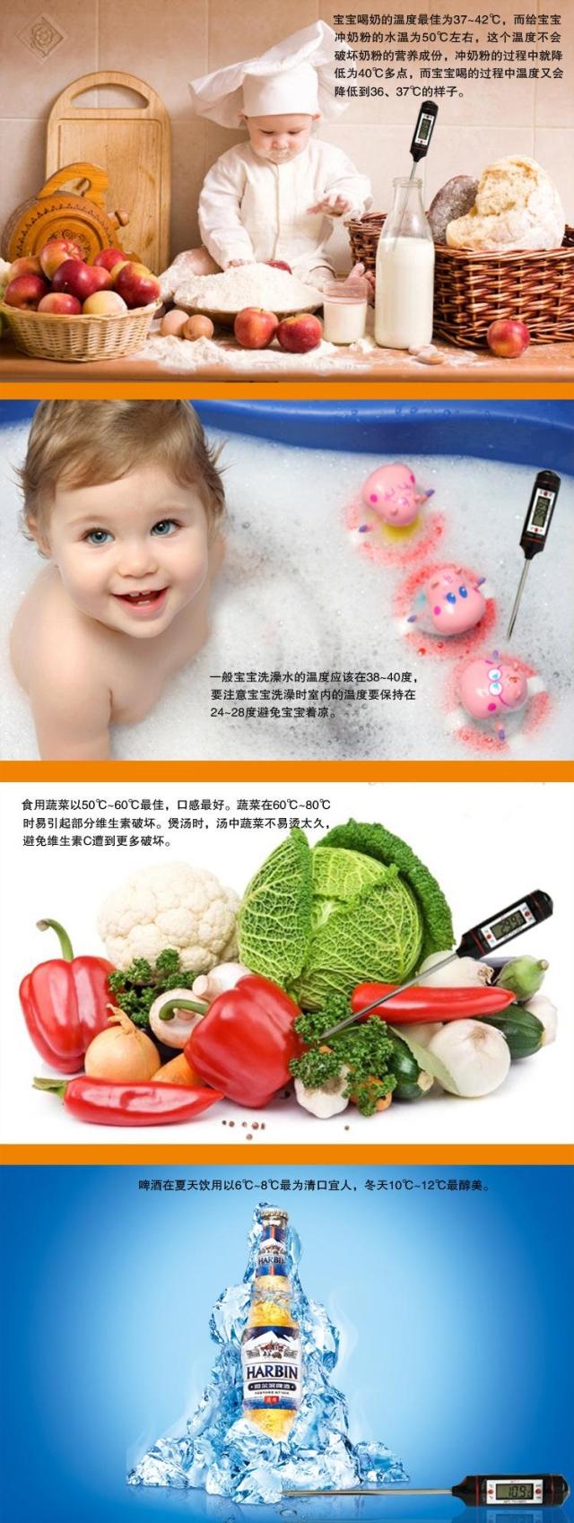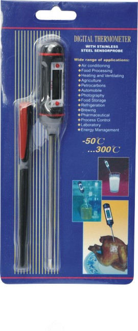 品名:电子温度计 说明:可测量-50摄氏度到300摄氏度(内配电子一个),电子食物温度计是不能放烤箱的,一般可用作做量水温,食物温度,做姜撞奶,或其它对温度要求比较高的点心上 使用方法:按下on开关即可开始工作,off开关为关闭。摄氏与华氏双显可切换。安装1.5v钮扣电池。使用方便带套筒,可携带,挂于衣服口袋。 零下 18度保存半年? 油温 180度 油炸 5分钟 ? 牛奶请加温至 40度适合饮用? 200度 蒸气蒸 3分钟 ? 没有适合的温度计怎么测量? 工欲善其事,必先利其器,当然要有好工具,才能做出好料理,做好温度控制..... -50度到300度,各种食物,物品,环境,连汽机车的油温水温都很好测量喔!!!! 当然也可以测到室温啰!!